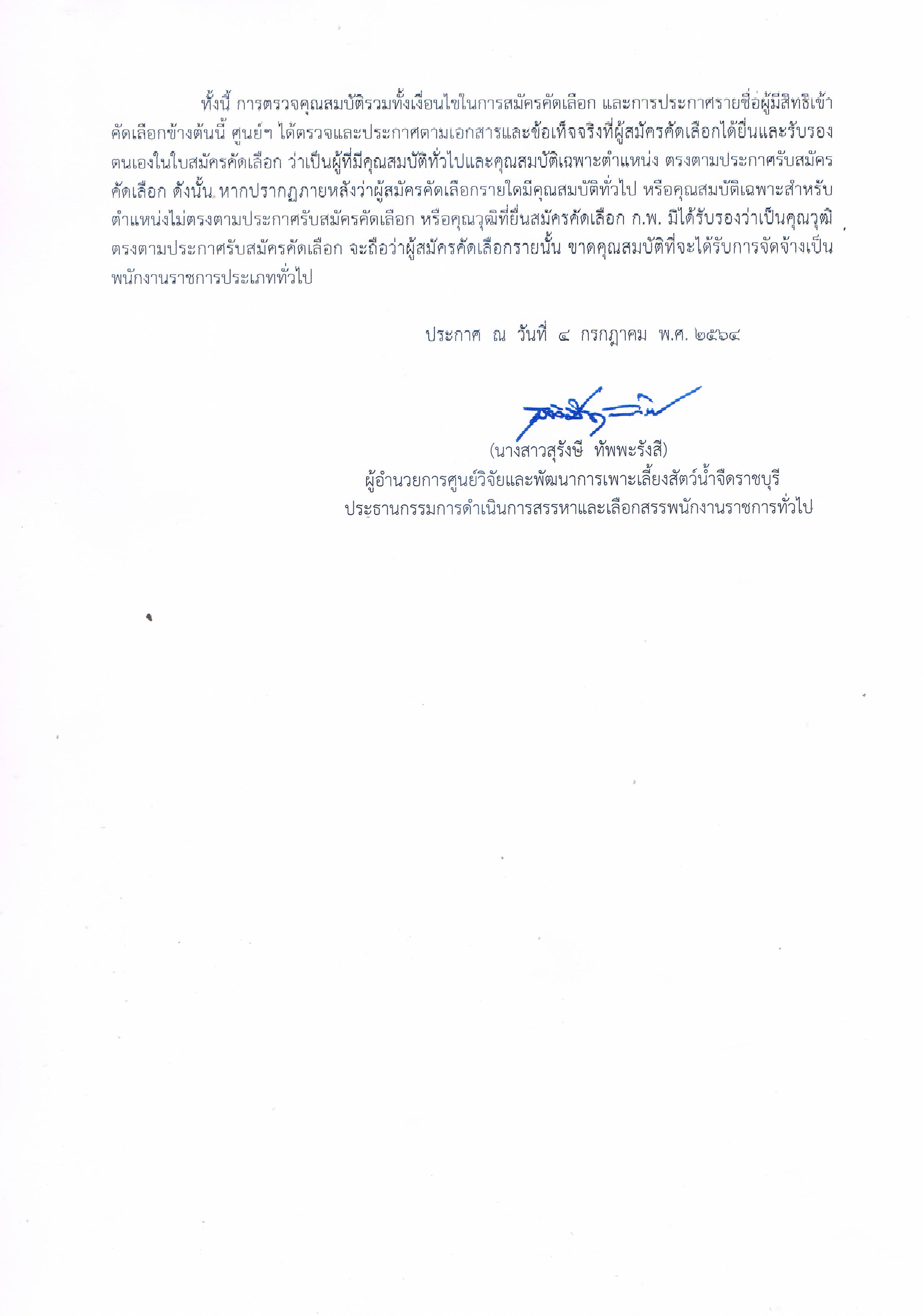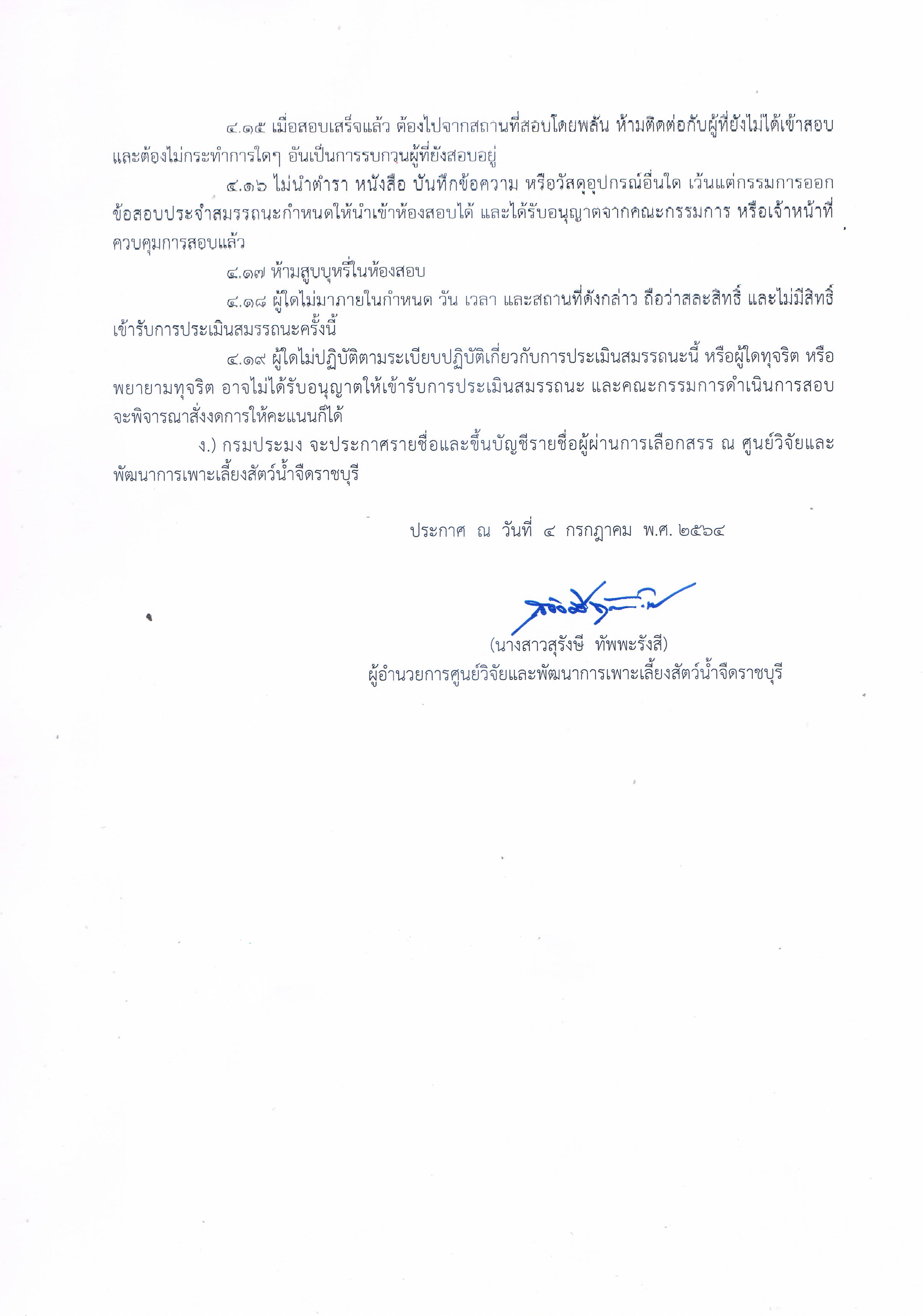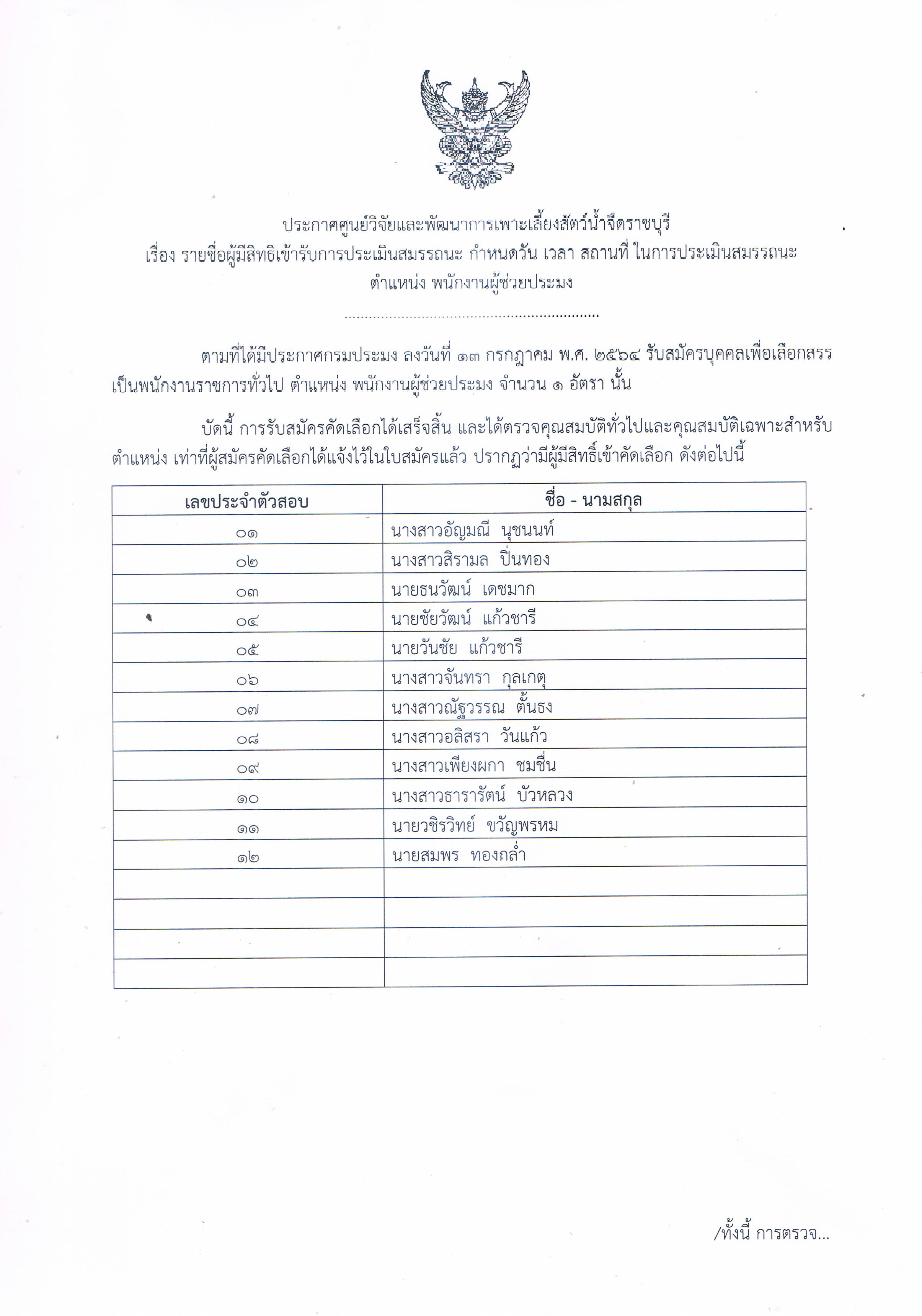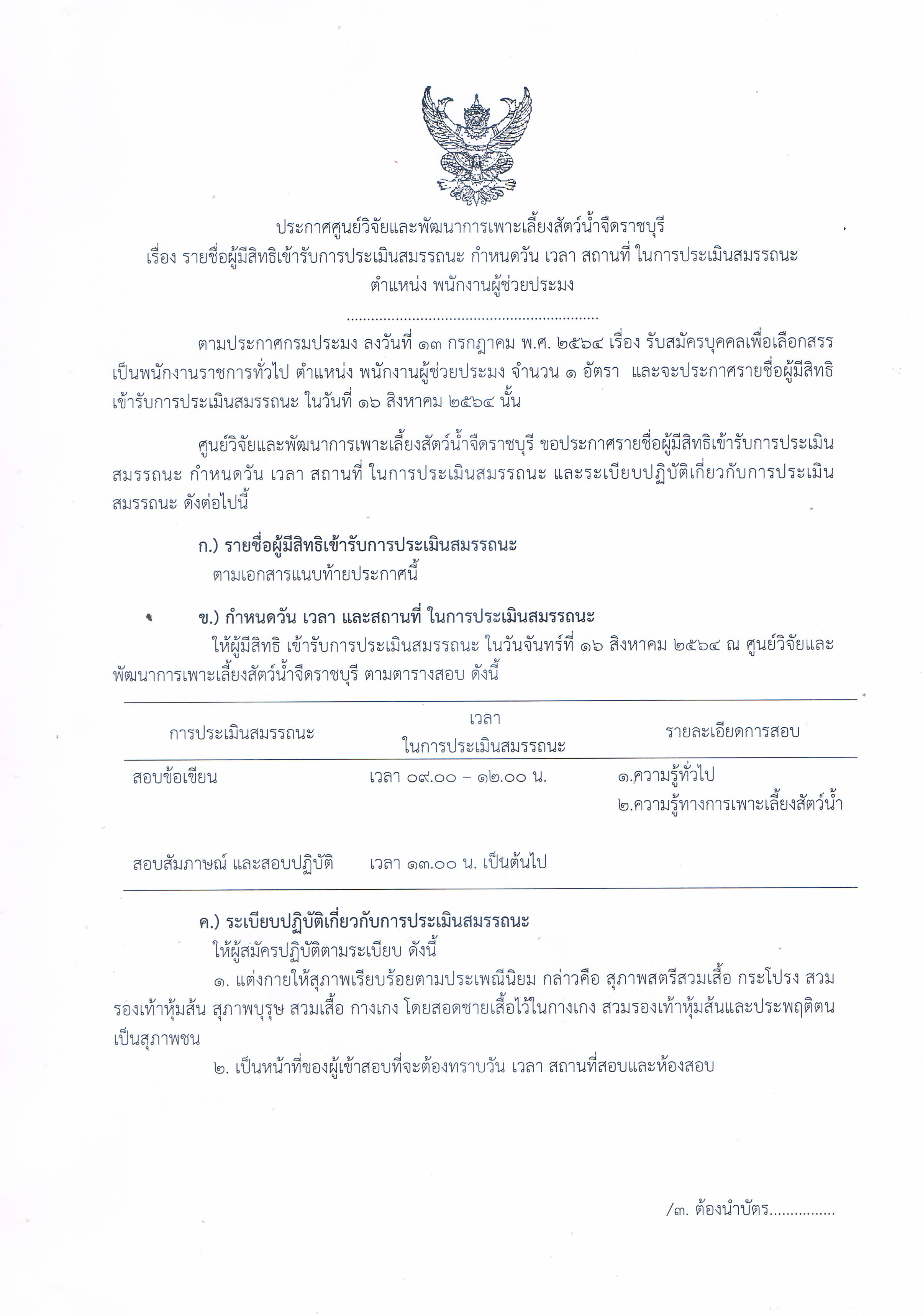ประกาศศูนย์วิจัยและพัฒนาการเพาะเลี้ยงสัตว์น้ำจืดราชบุรี เรื่อง รายชื่อผู้มีสิทธิเข้ารับการประเมินสมรรถนะ กำหนดวัน เวลา สถานที่ในการประเมินสมรรถนะ ตำแหน่ง พนักงานผู้ช่วยประมง