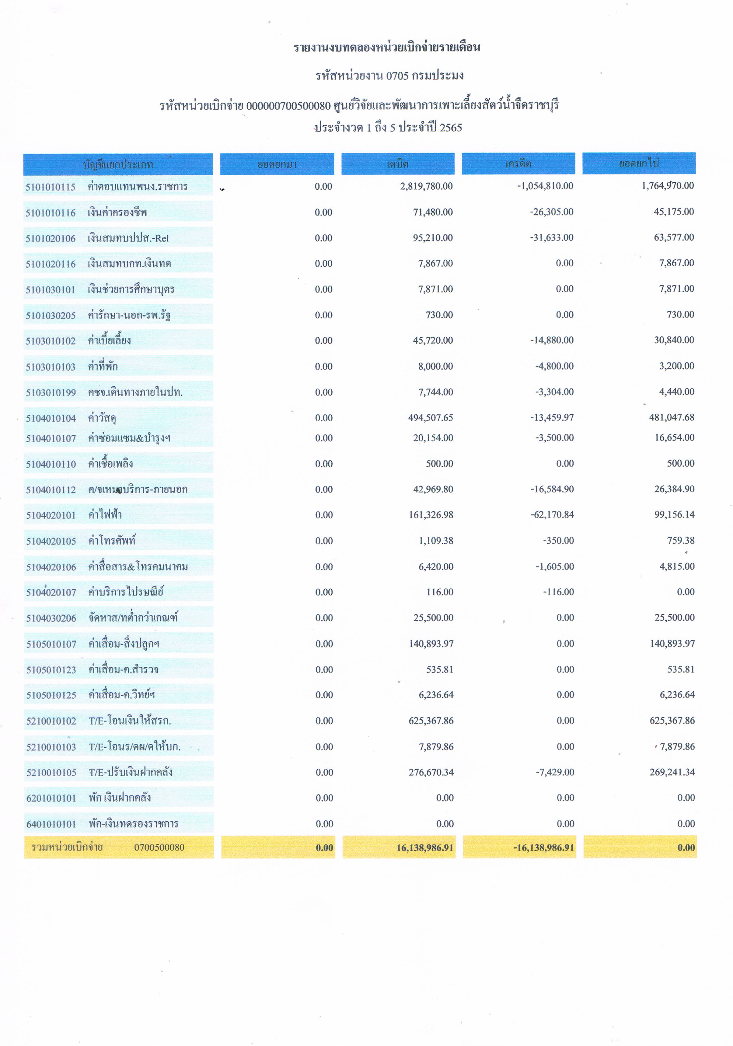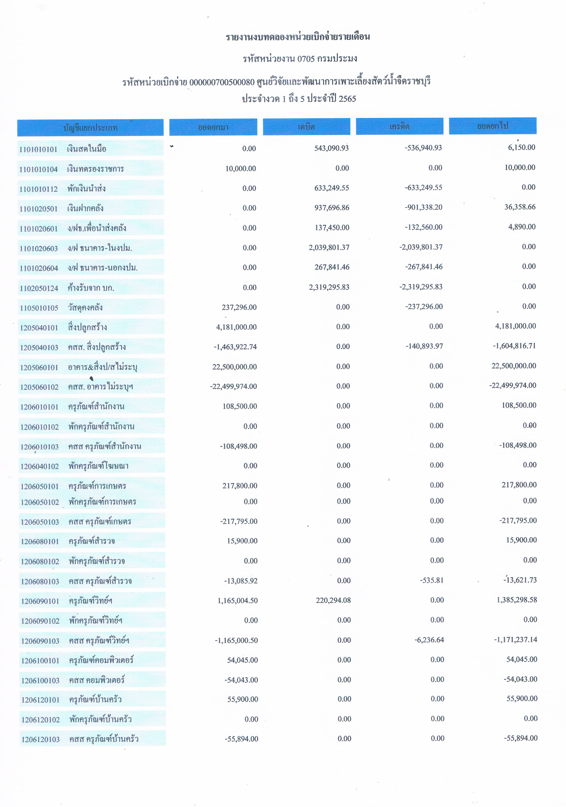 รายงานงบทดลองหน่วยเบิกจ่ายรายเดือน ประจำเดือน กุมภาพันธ์ 2565