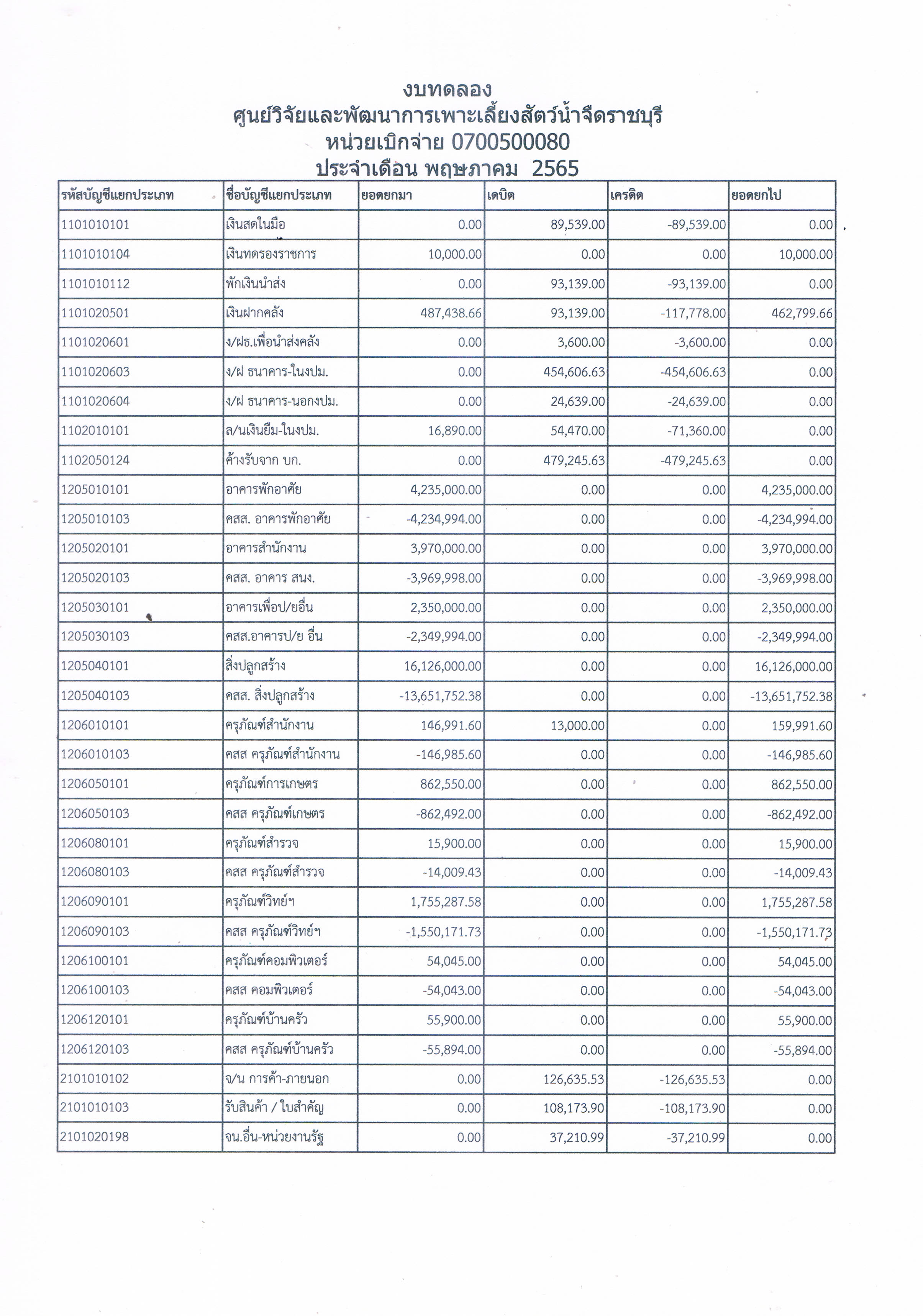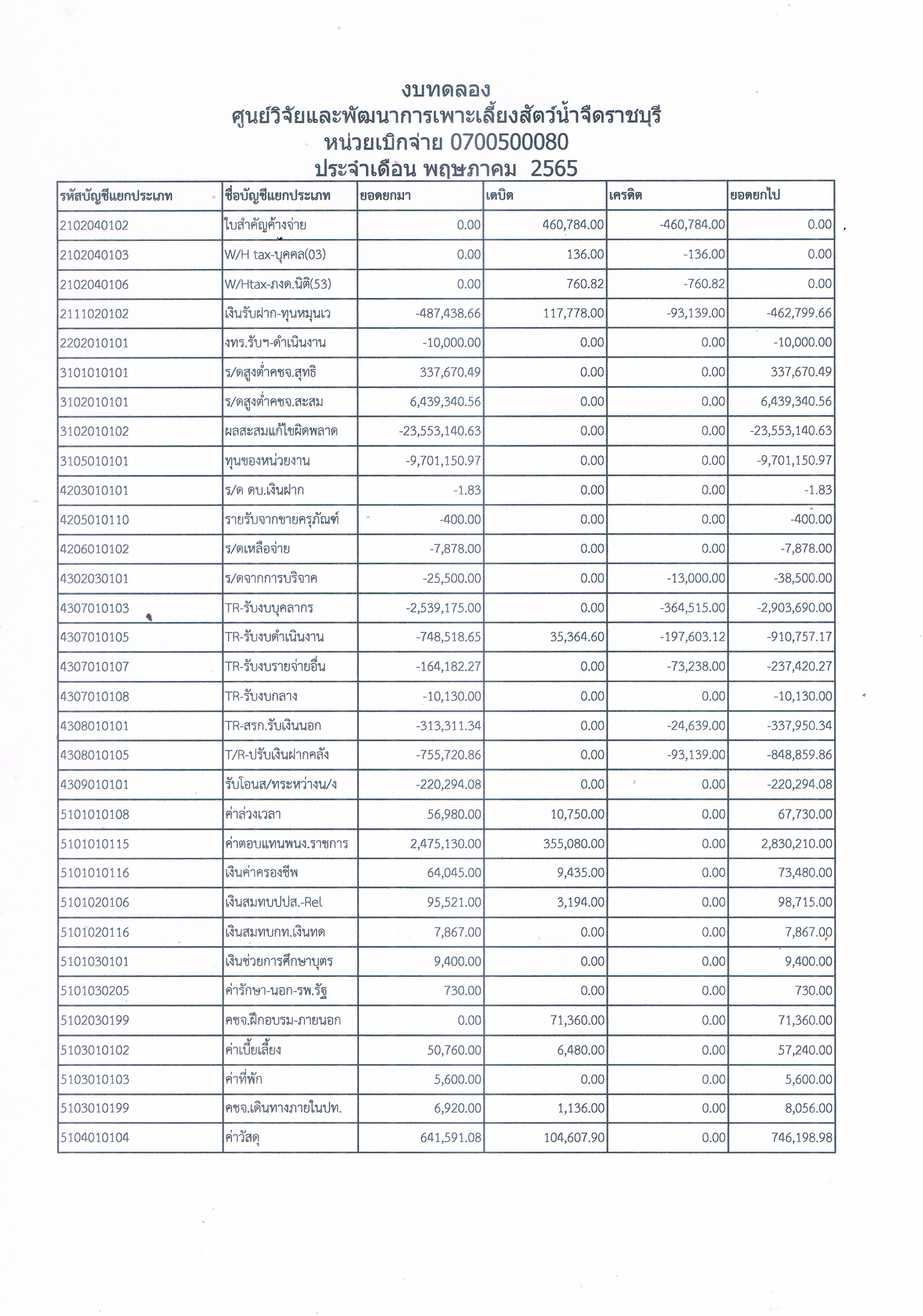 รายงานงบทดลองหน่วยเบิกจ่ายรายเดือน พฤษภาคม 2565 ศูนย์วิจัยและพัฒนาการเพาะเลี้ยงสัตว์น้ำจืดราชบุรี