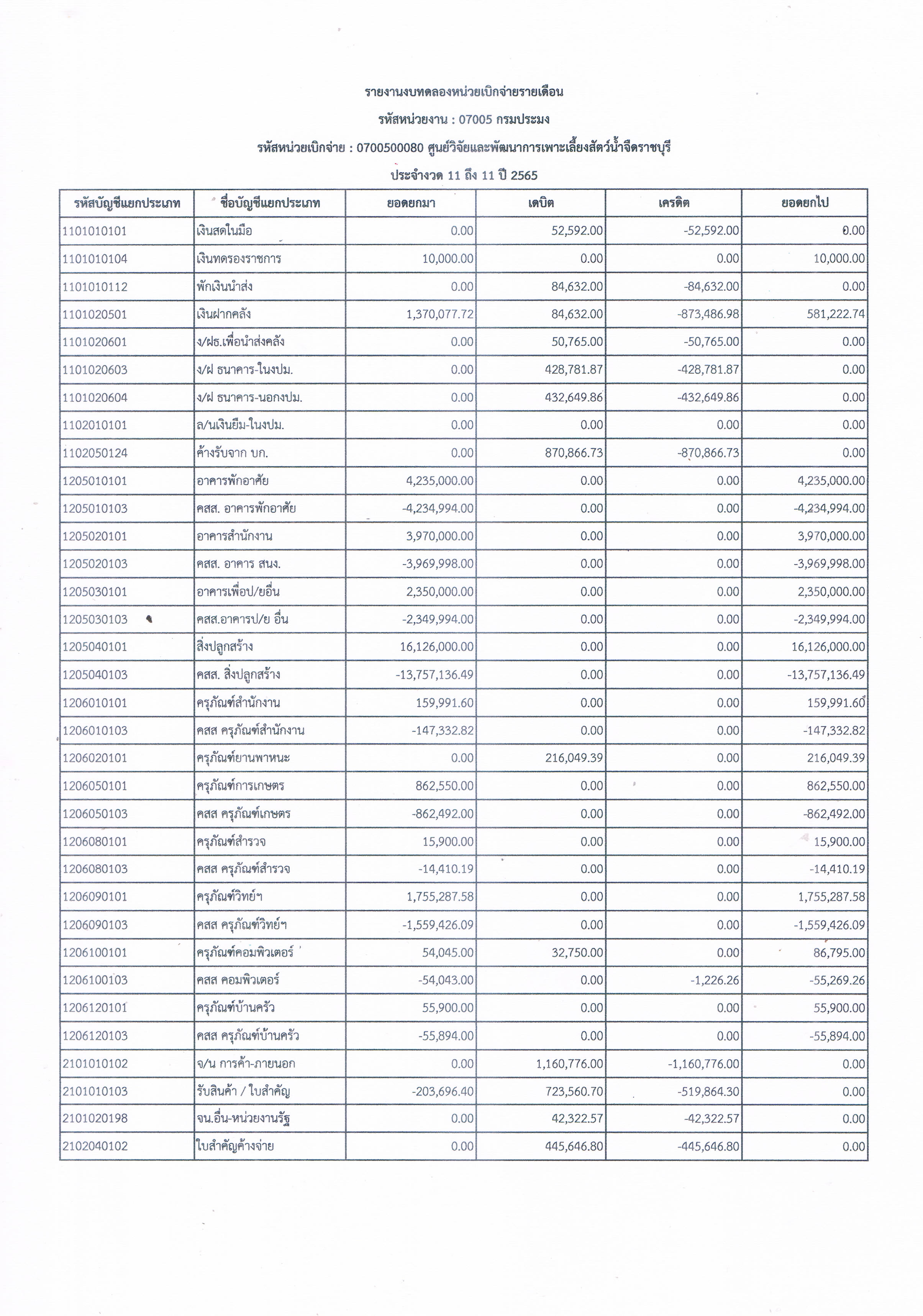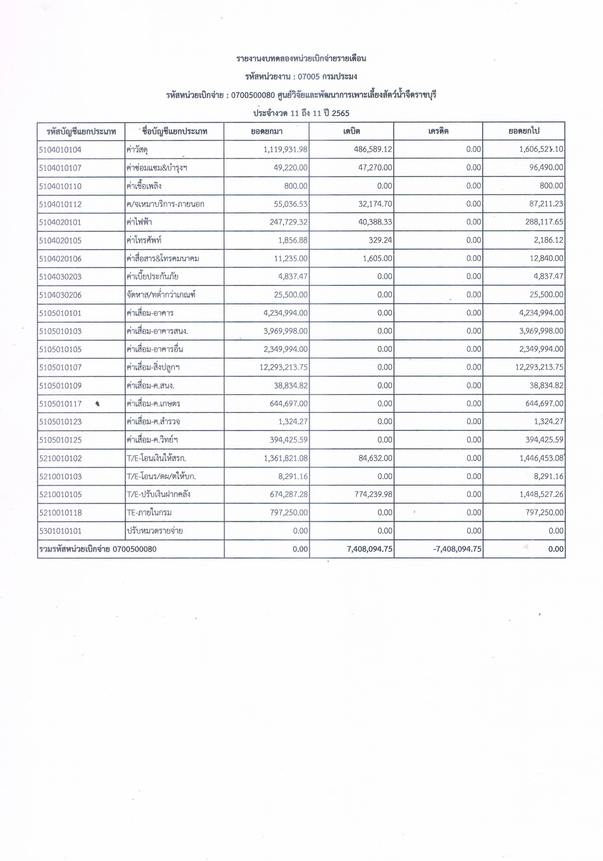 รายงานงบทดลองหน่วยเบิกจ่ายรายเดือน สิงหาคม 2565 ศูนย์วิจัยและพัฒนาการเพาะเลี้ยงสัตว์น้ำจืดราชบุรี