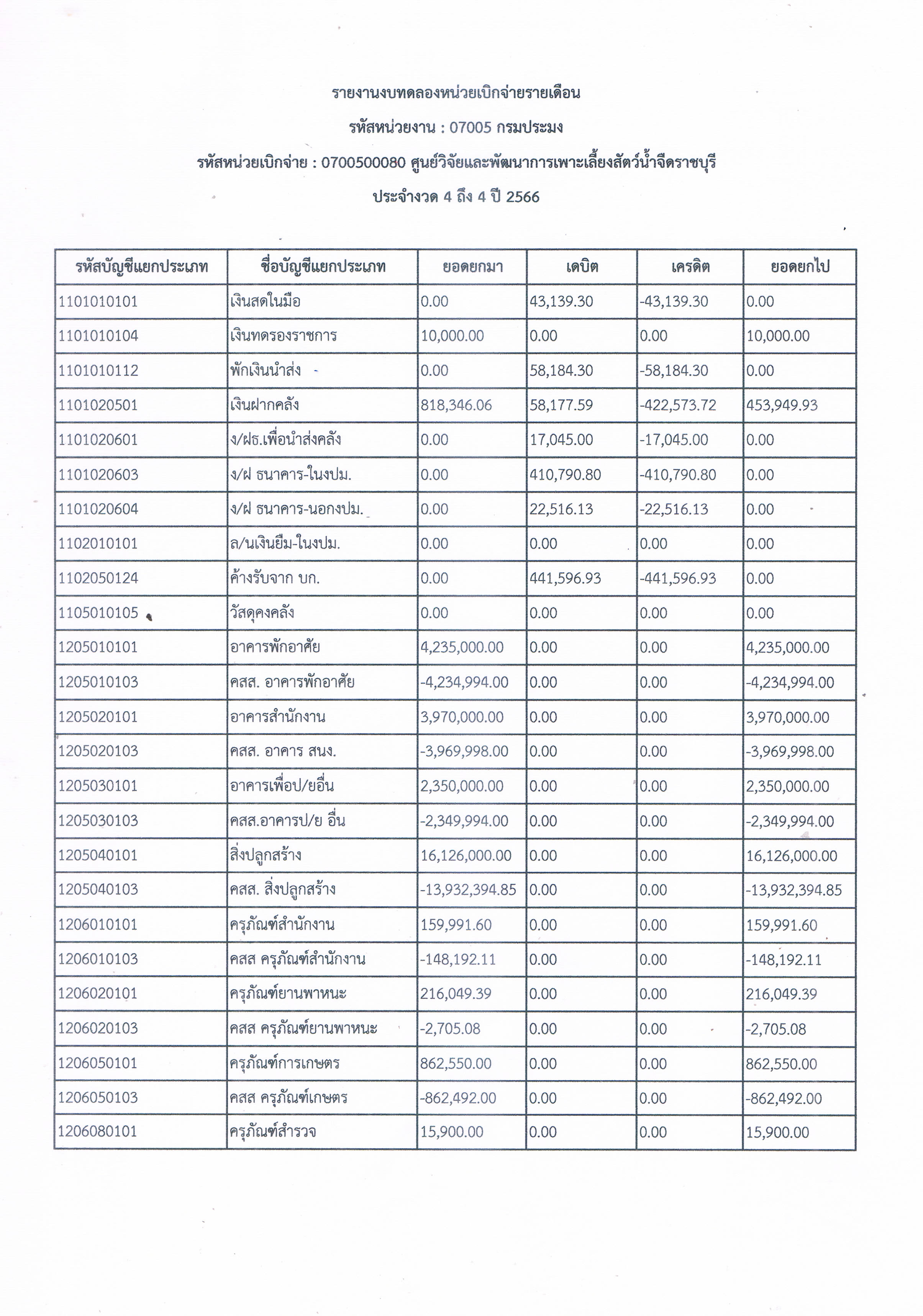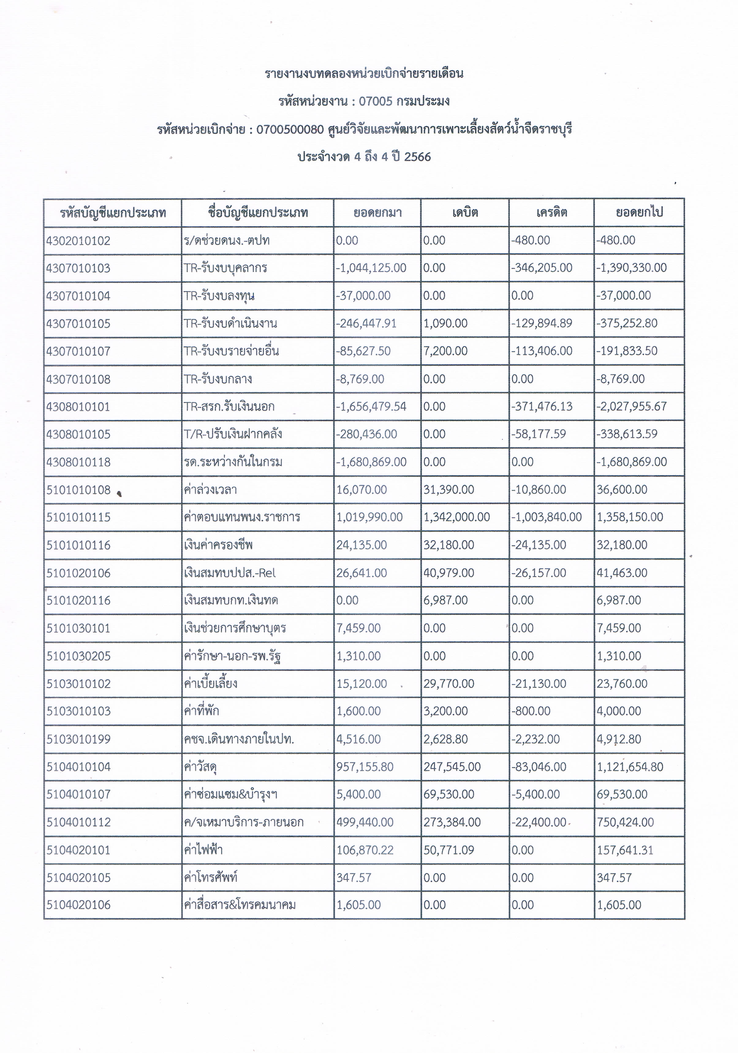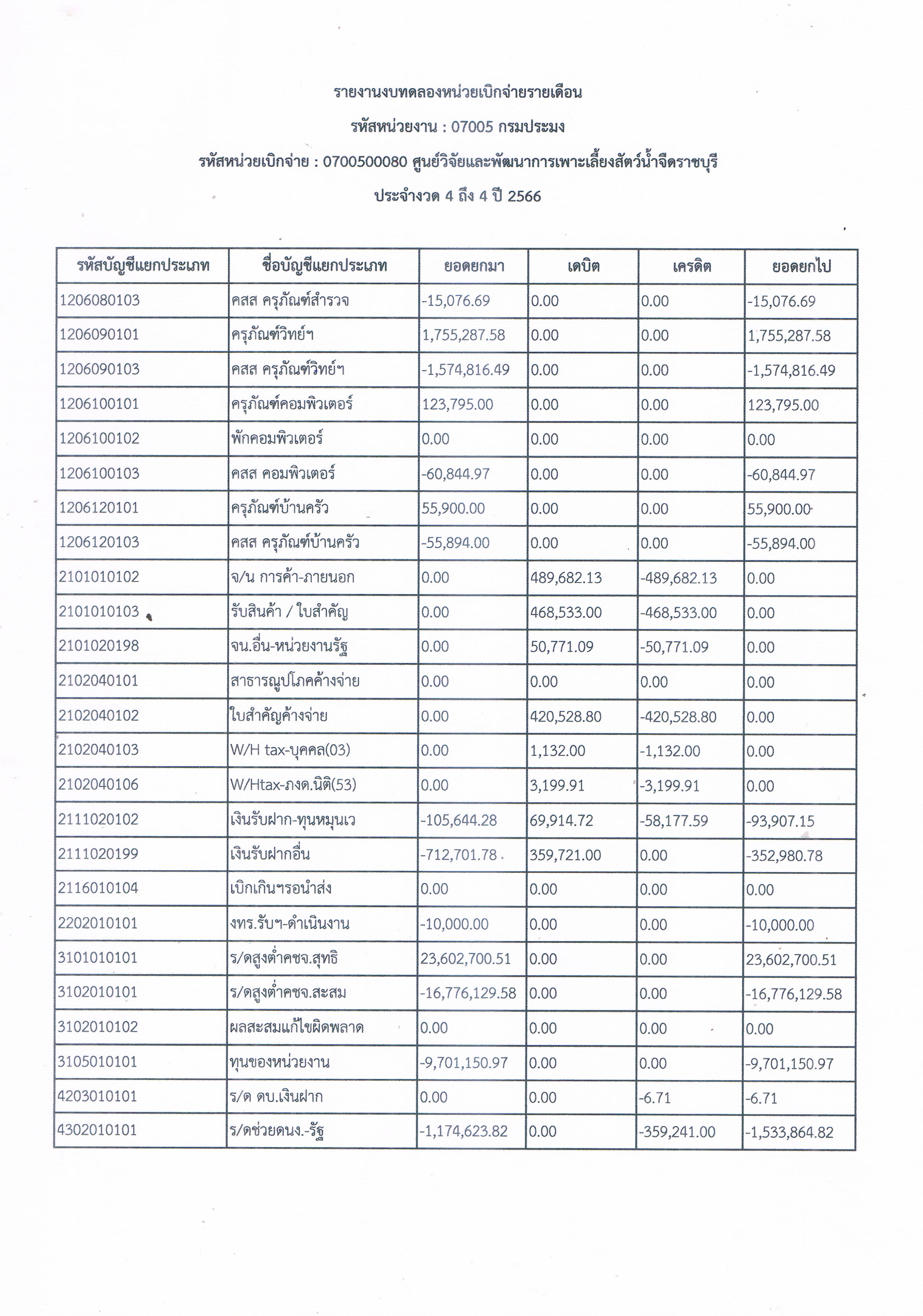 รายงานงบทดลองหน่วยเบิกจ่ายรายเดือน มกราคม 2566 ศูนย์วิจัยและพัฒนาการเพาะเลี้ยงสัตว์น้ำจืดราชบุรี