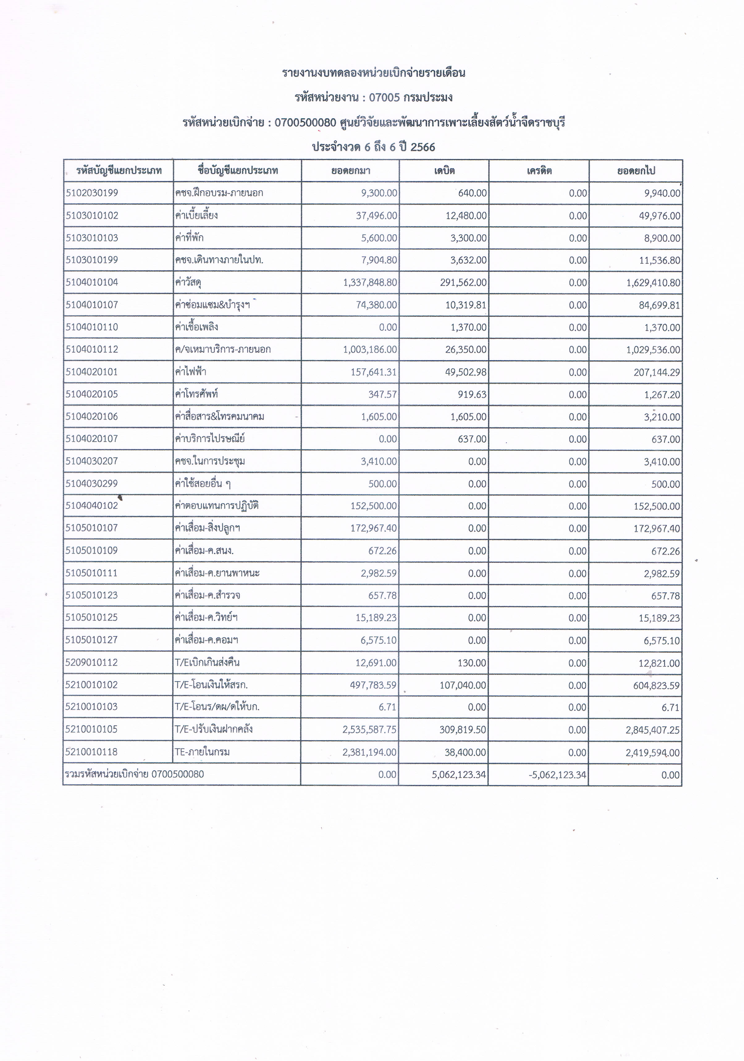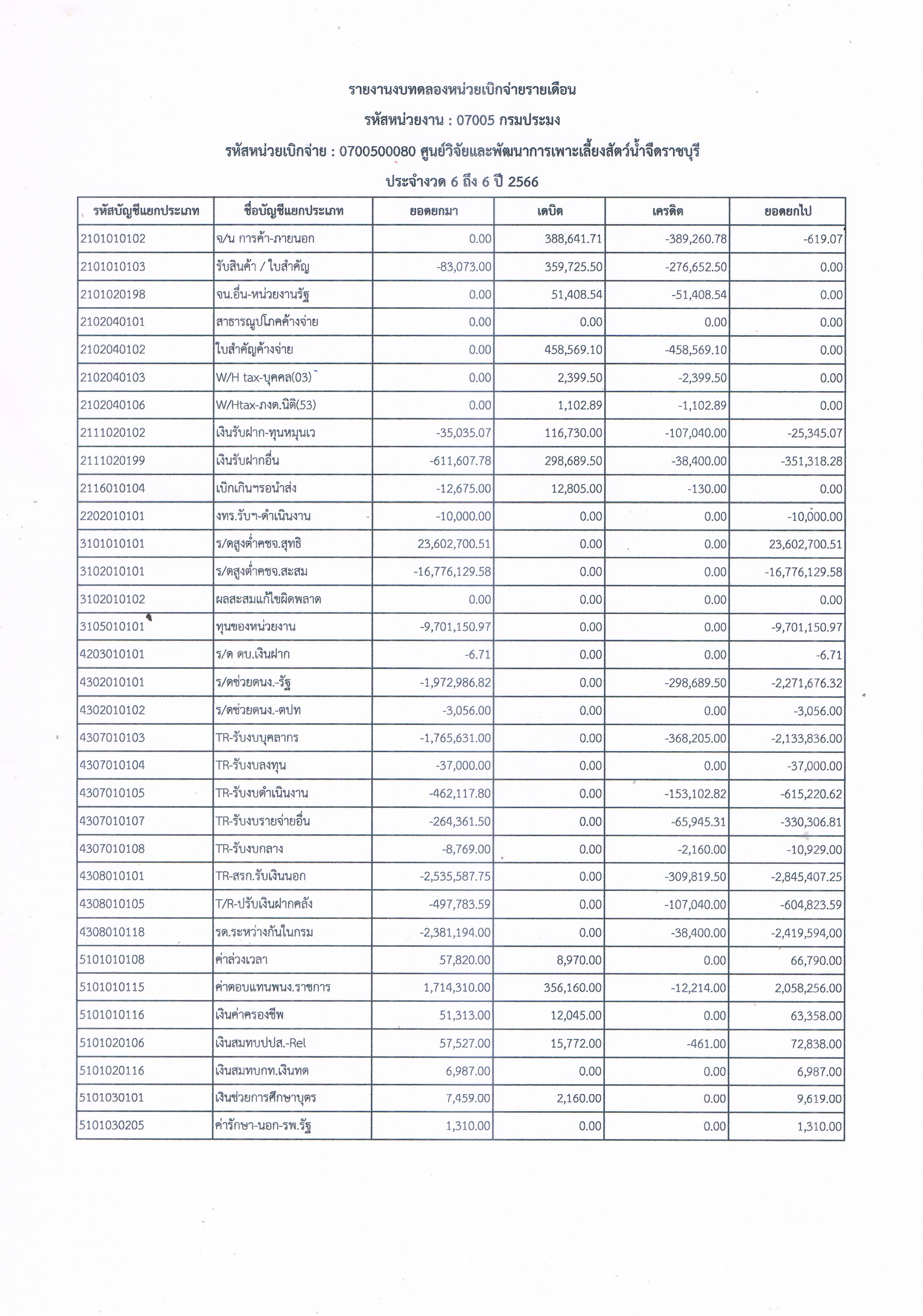 รายงานงบทดลองหน่วยเบิกจ่ายรายเดือน มีนาคม 2566 ศูนย์วิจัยและพัฒนาการเพาะเลี้ยงสัตว์น้ำจืดราชบุรี..คลิก