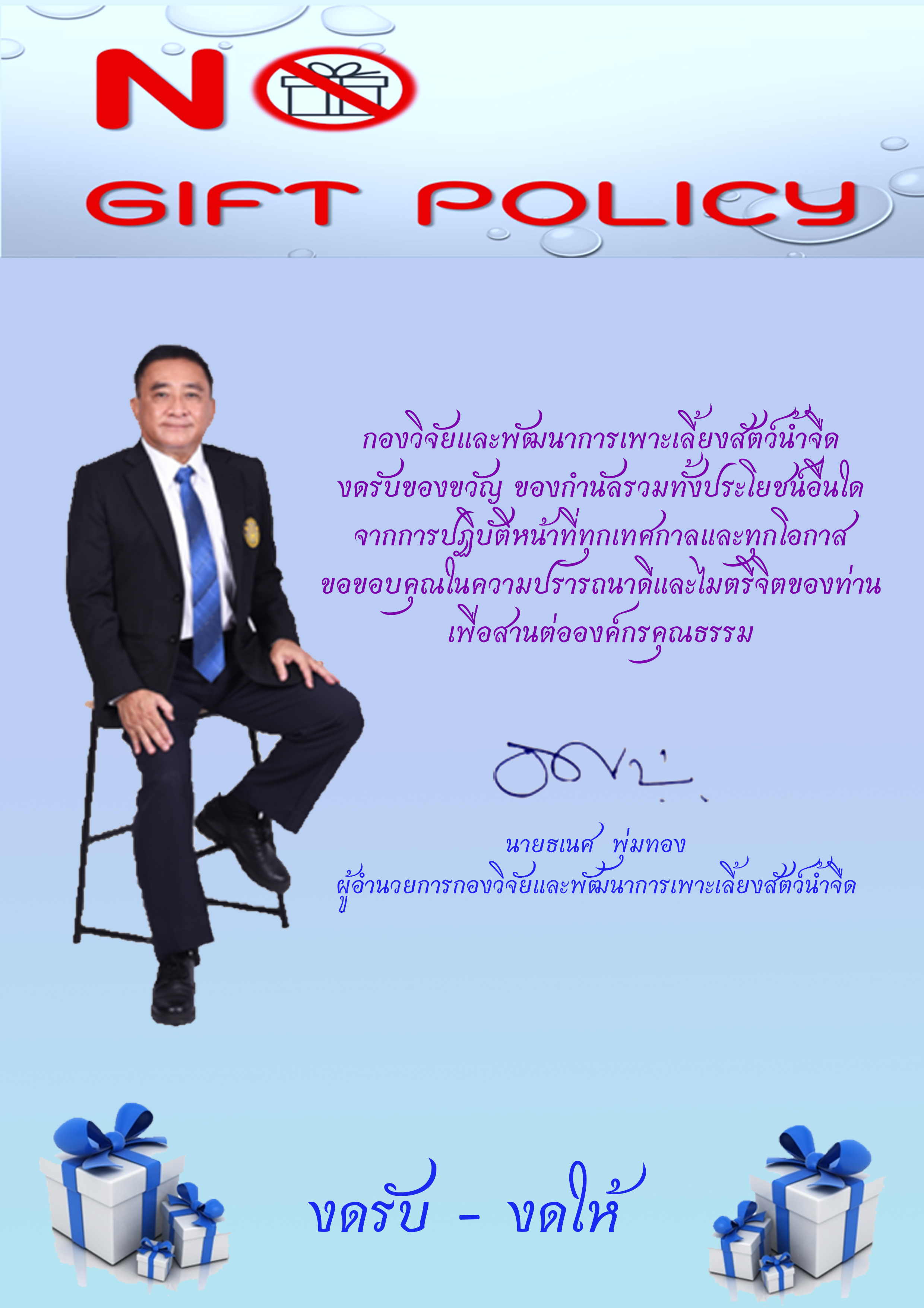 ศูนย์วิจัยและพัฒนาการเพาะเลี้ยงสัตว์น้ำจืดราชบุรี งดรับของขวัญ ของกำนัล รวมทั้งประโยชน์อื่นใด จากการปฏิบัติหน้าที่ทุกเทศกาลและทุกโอกาส