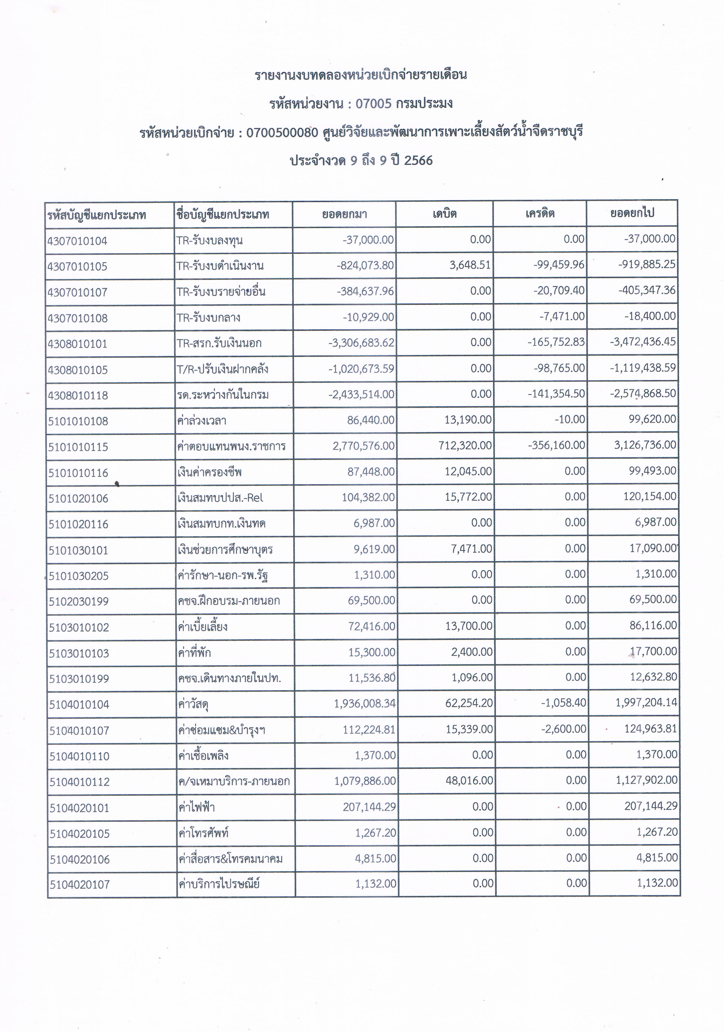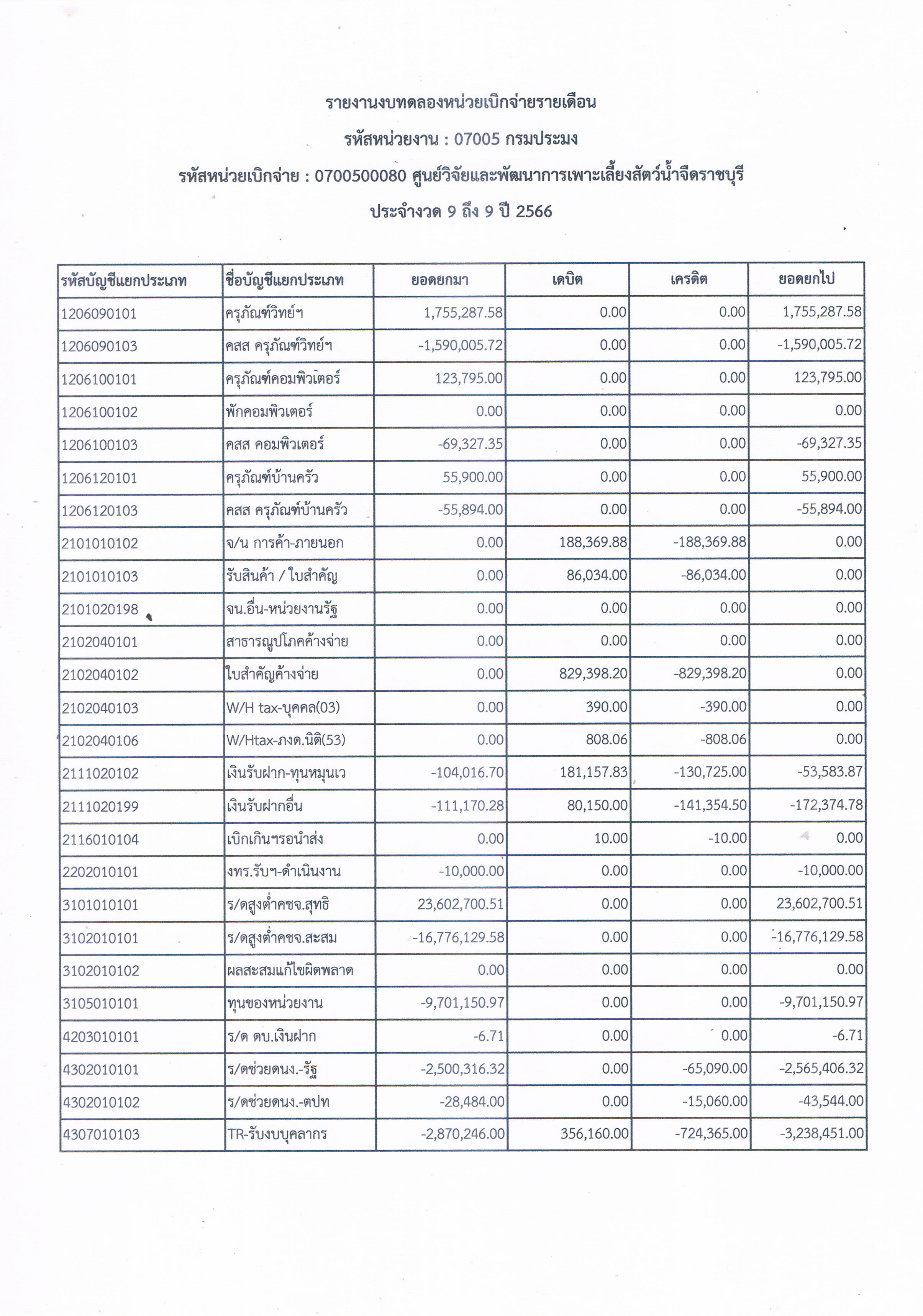 รายงานงบทดลองหน่วยเบิกจ่ายรายเดือน มิถุนายน 2566 ศูนย์วิจัยและพัฒนาการเพาะเลี้ยงสัตว์น้ำจืดราชบุรี..คลิก