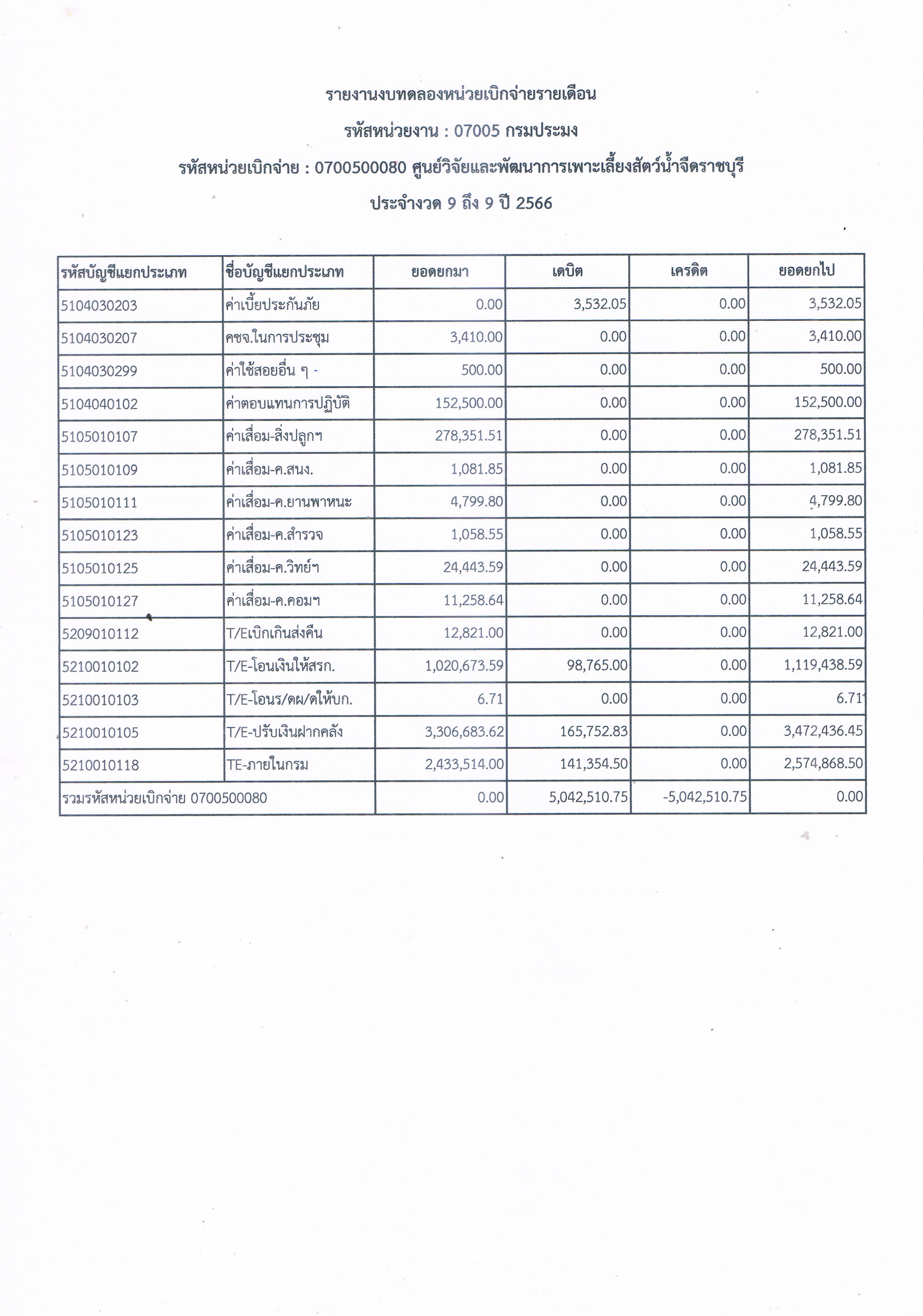 รายงานงบทดลองหน่วยเบิกจ่ายรายเดือน มิถุนายน 2566 ศูนย์วิจัยและพัฒนาการเพาะเลี้ยงสัตว์น้ำจืดราชบุรี
