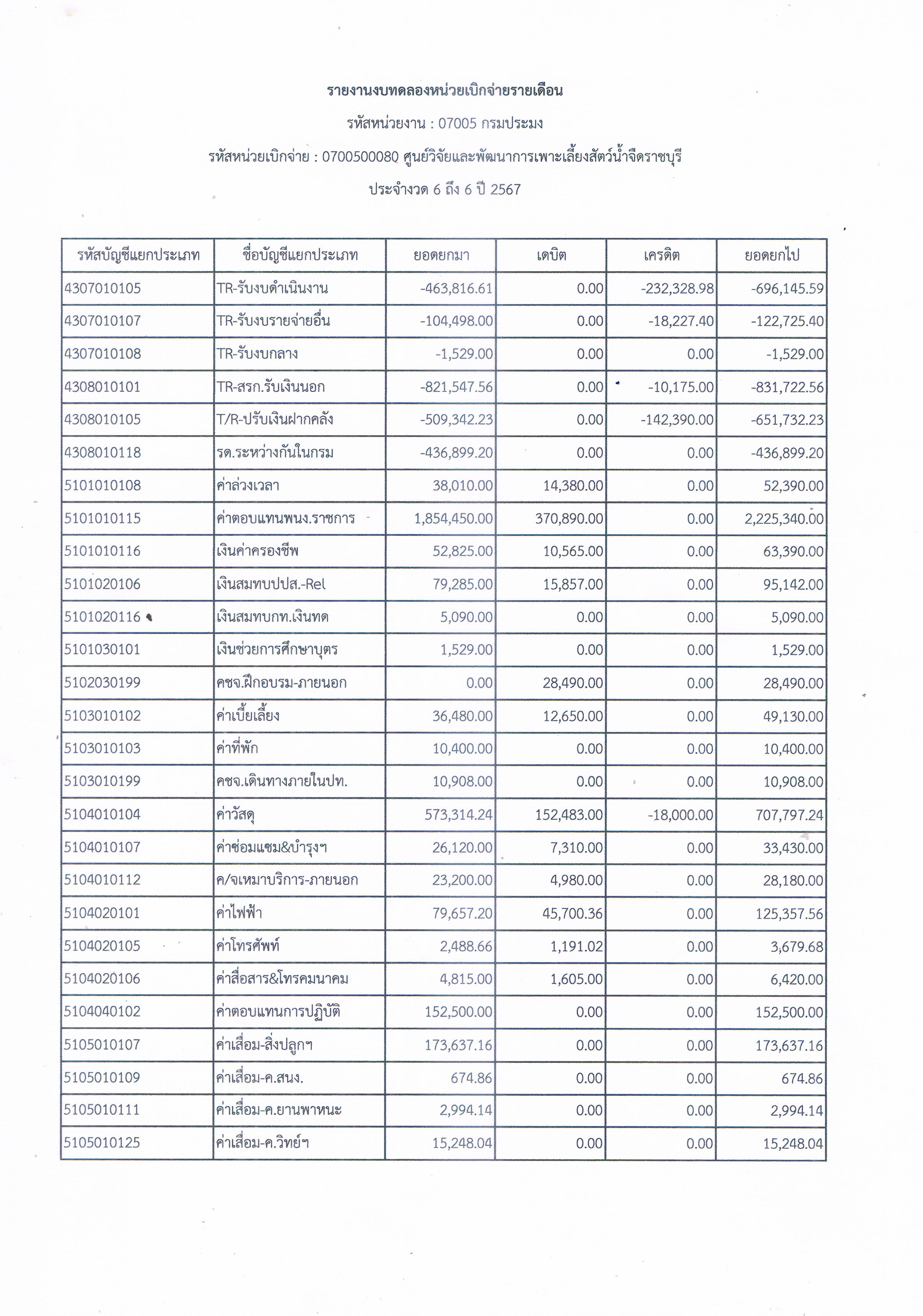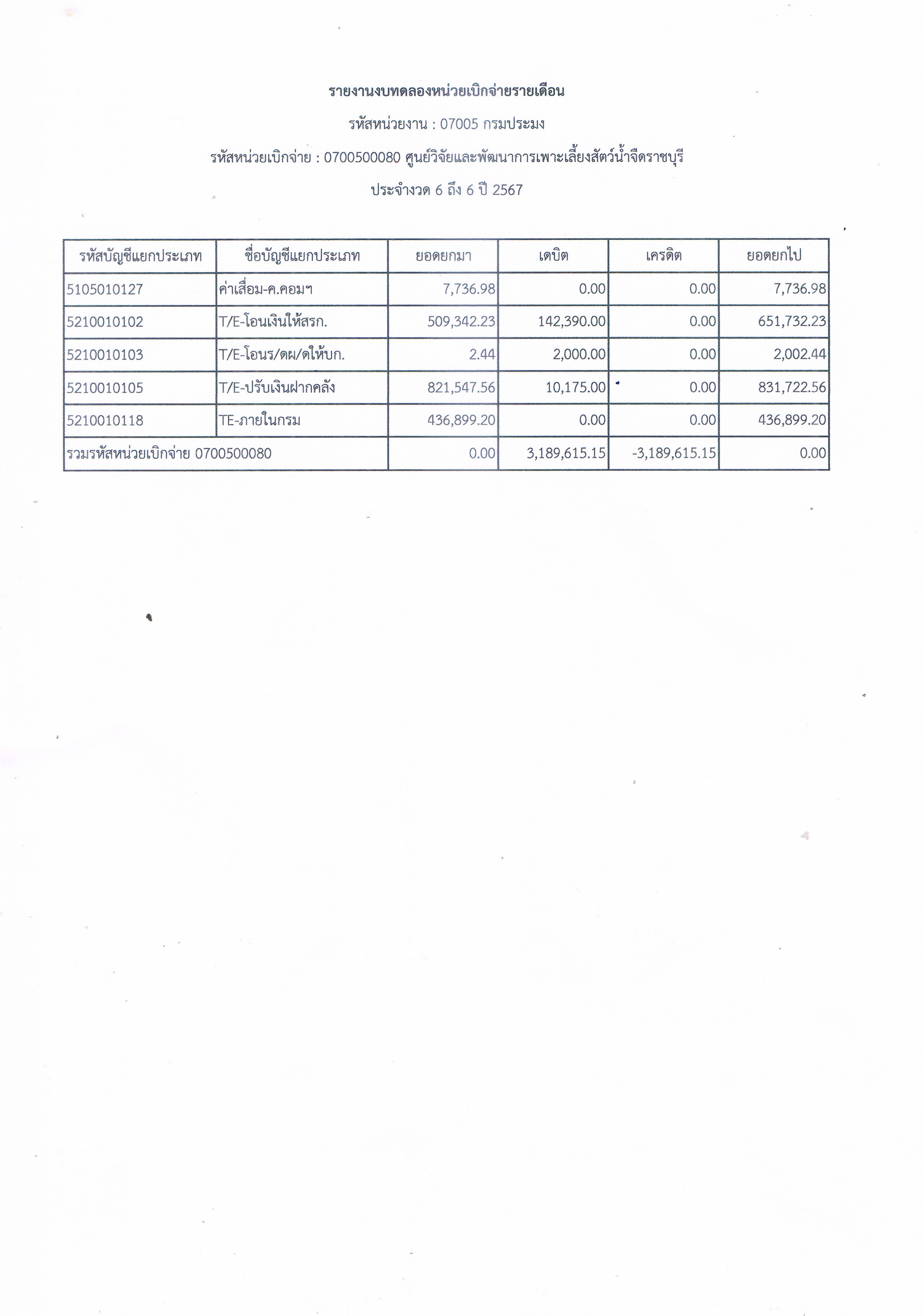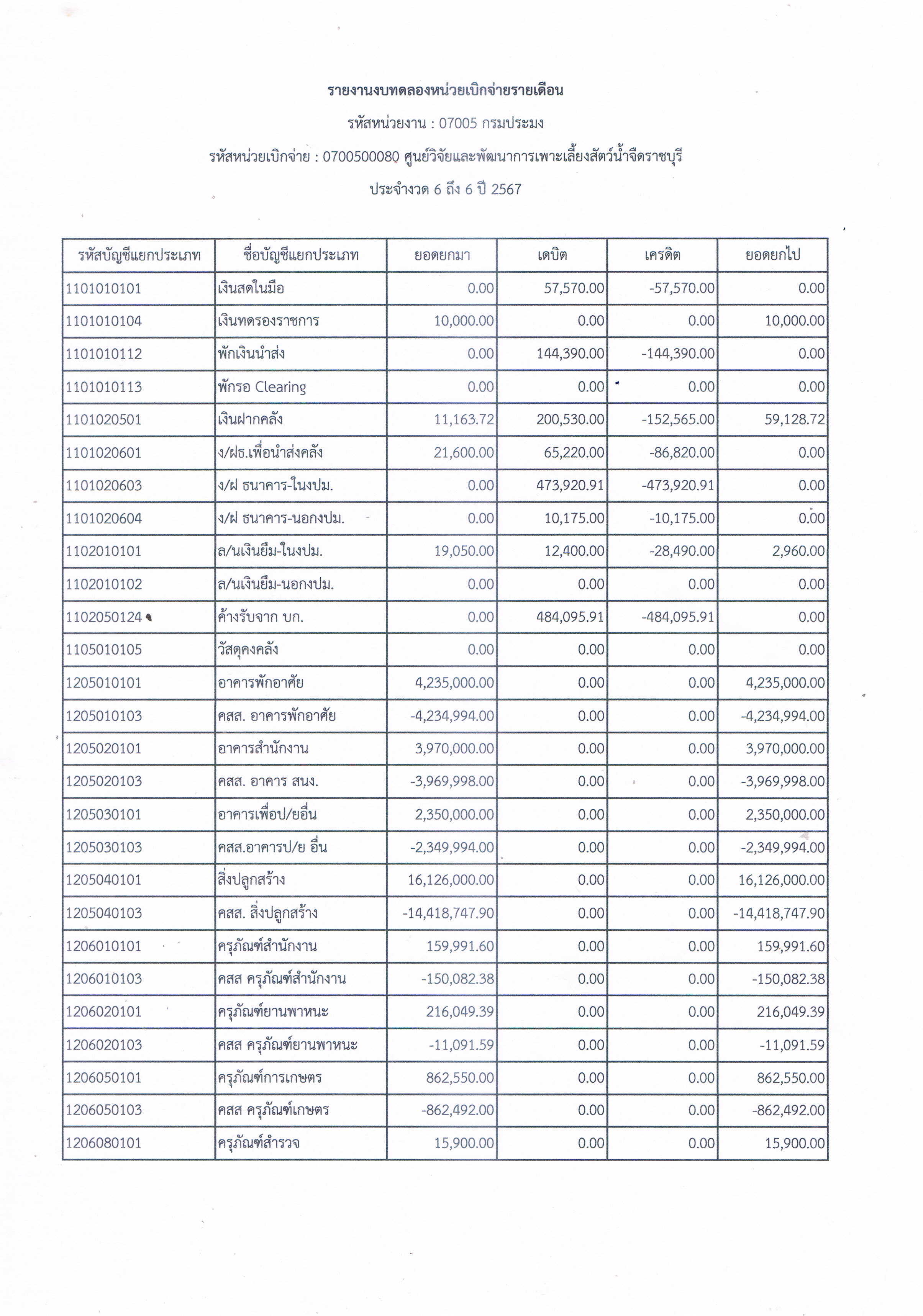 รายงานงบทดลองหน่วยเบิกจ่ายรายเดือน ประจำเดือน มีนาคม 2567