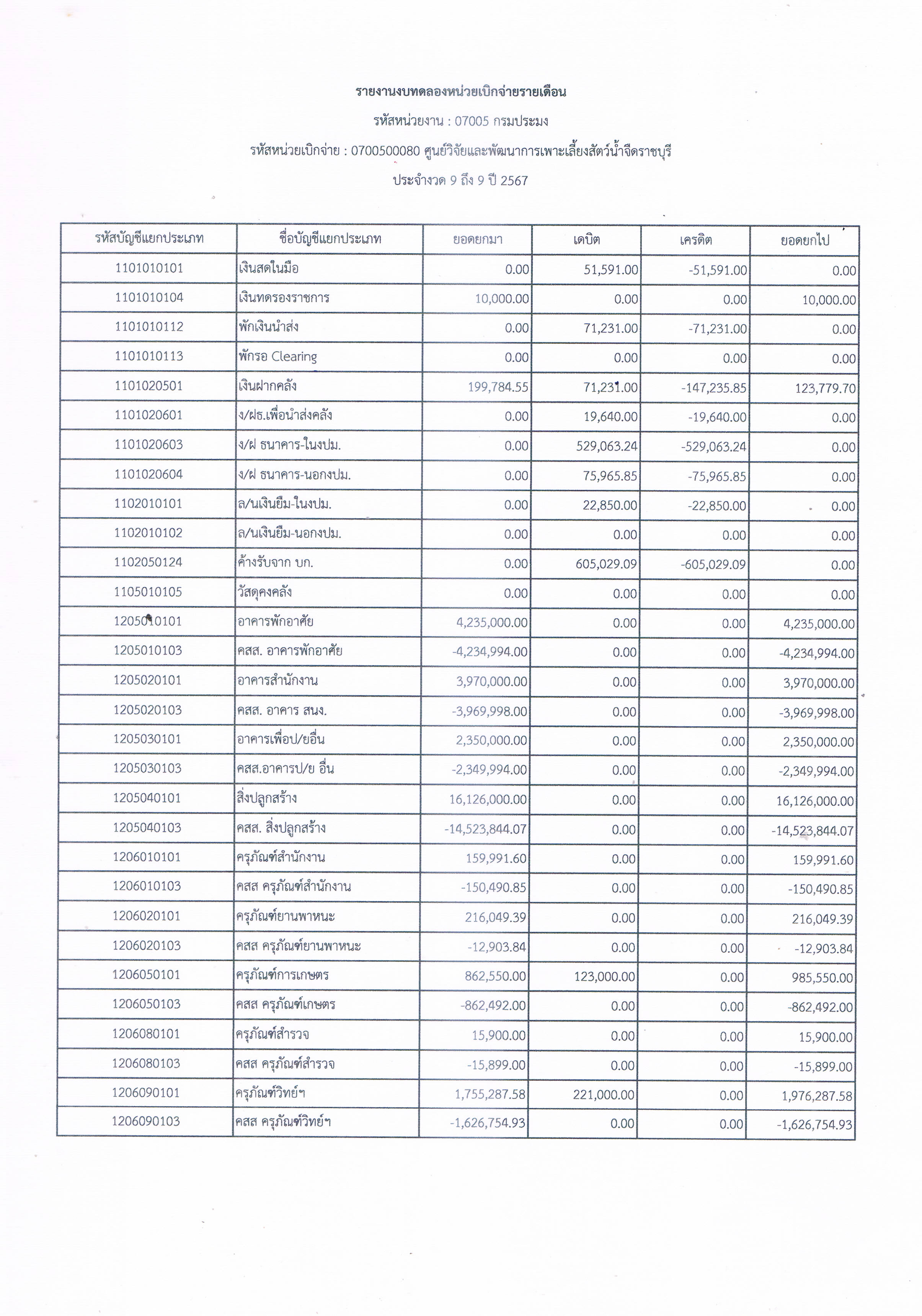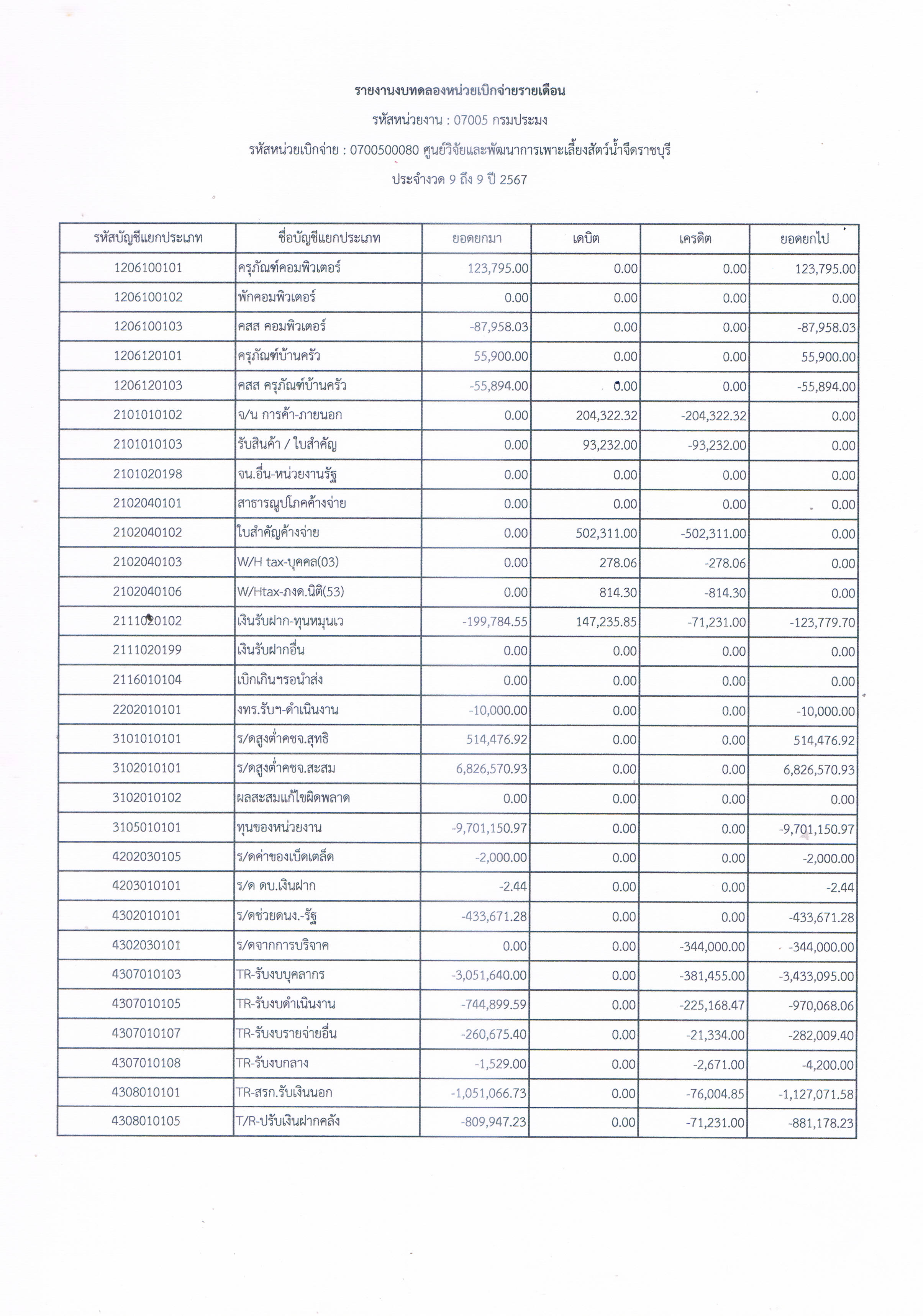 รายงานงบทดลองหน่วยเบิกจ่ายรายเดือน ประจำเดือน มิถุนายน 2567