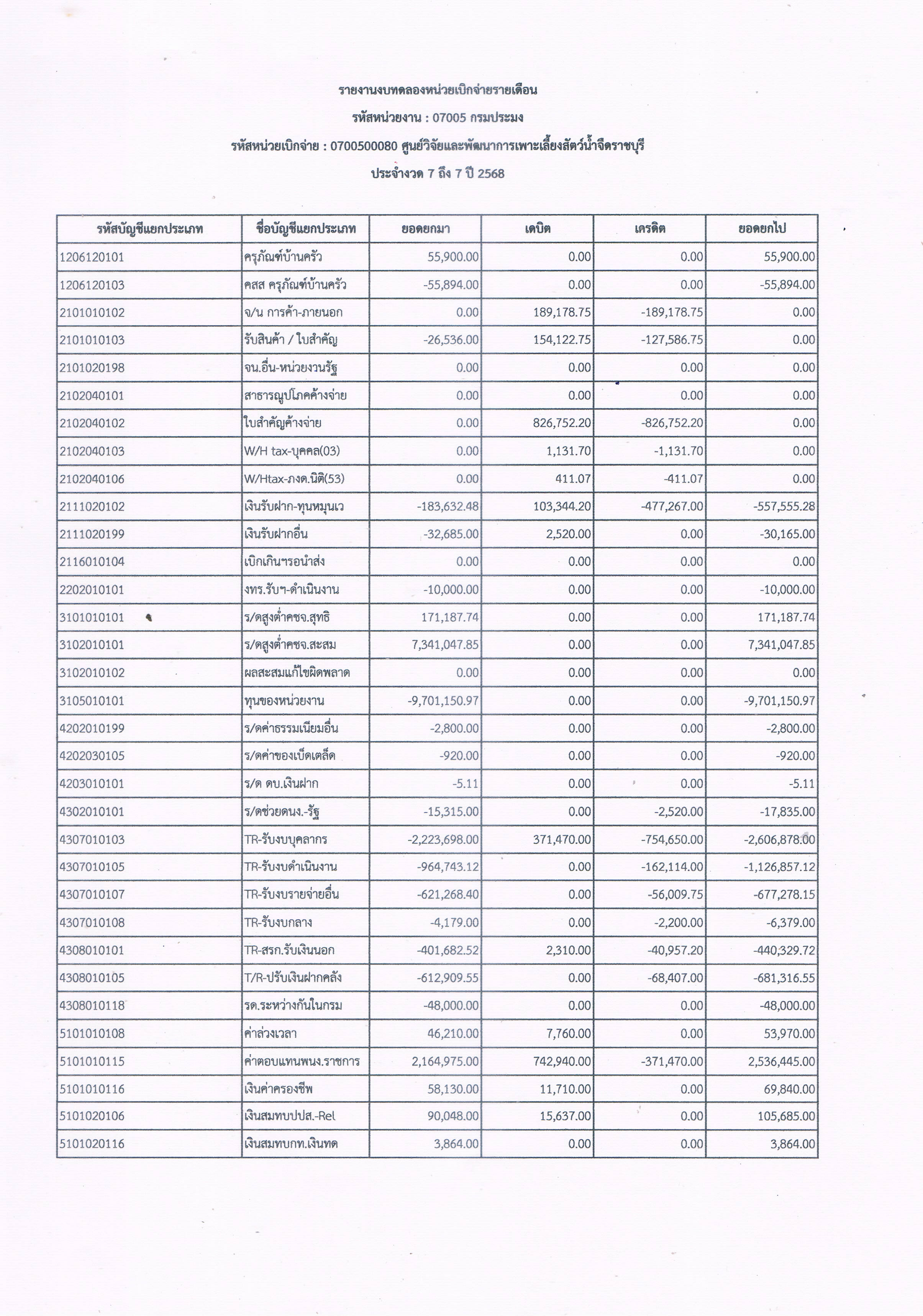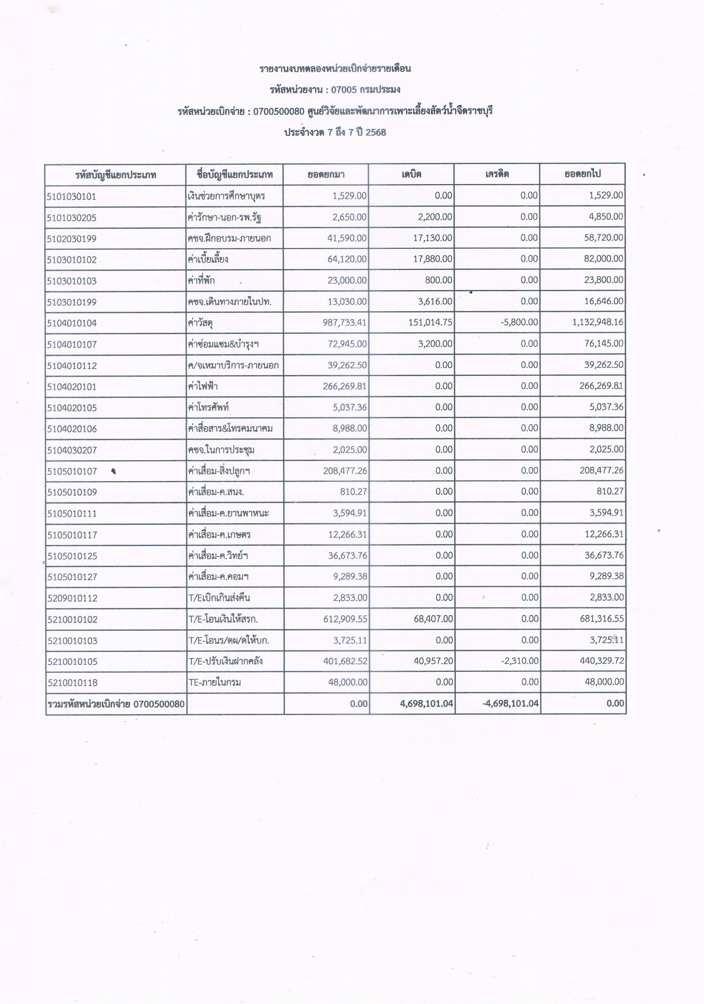 รายงานงบทดลองหน่วยเบิกจ่ายรายเดือน ประจำเดือน เมษายน 2568