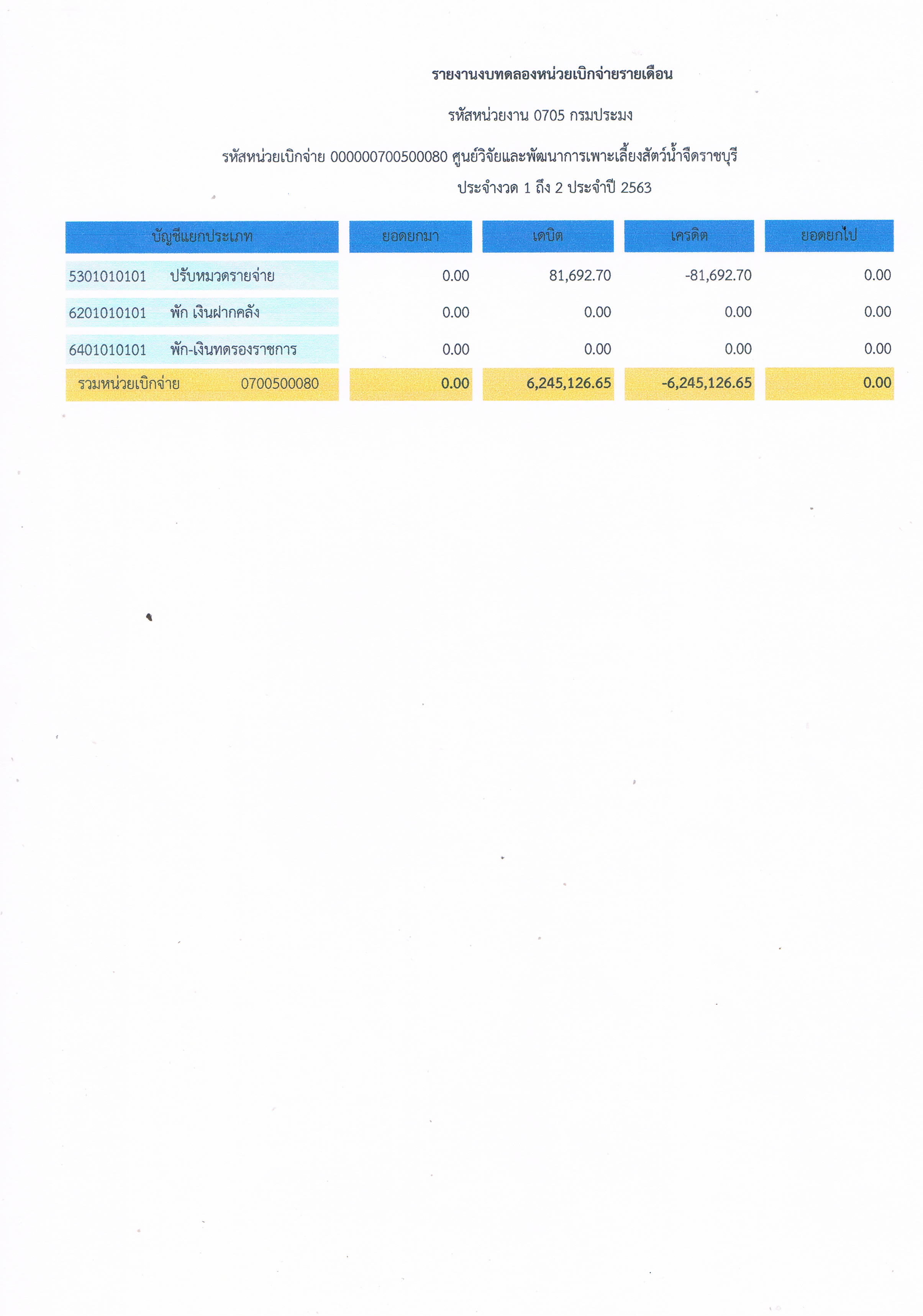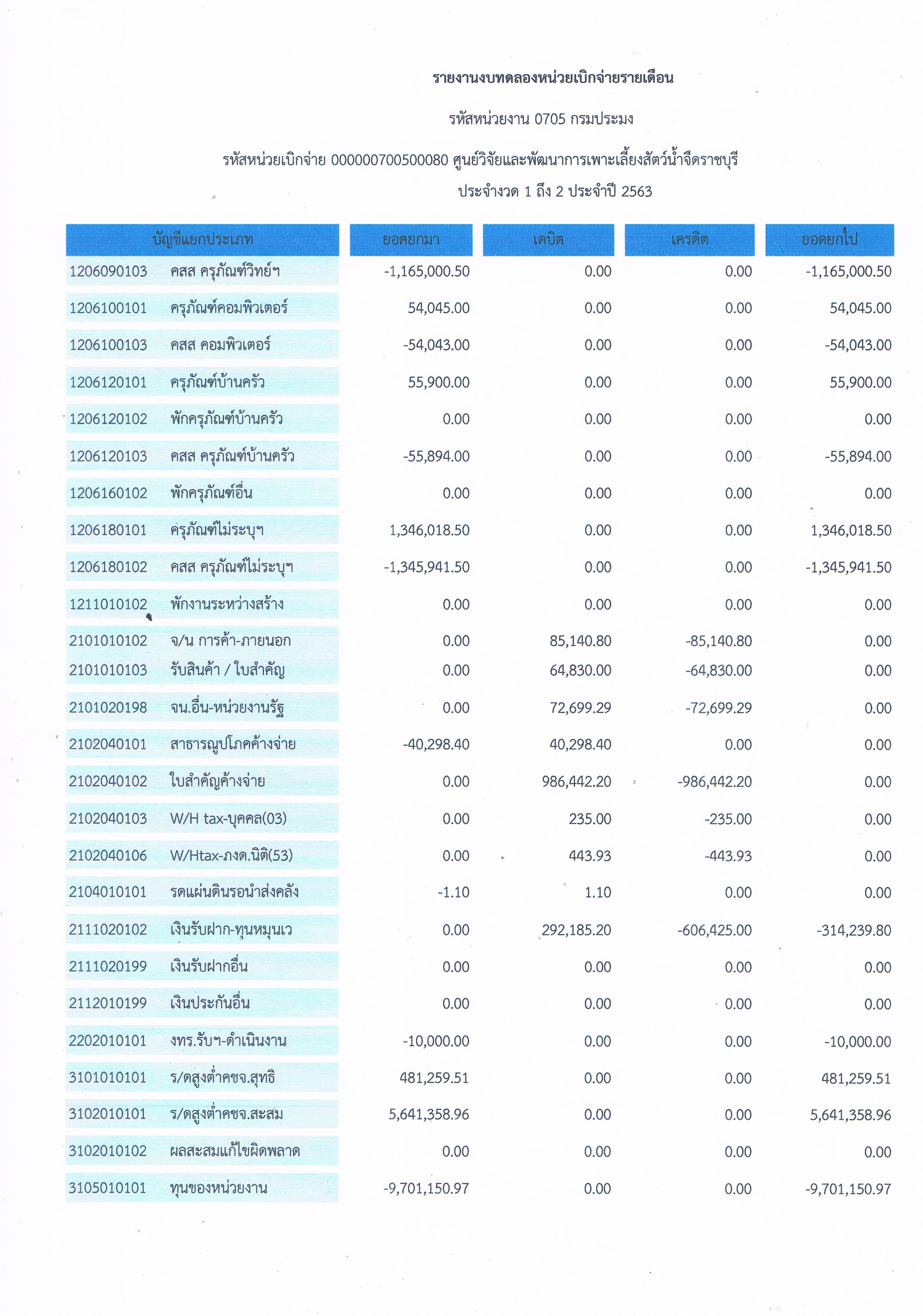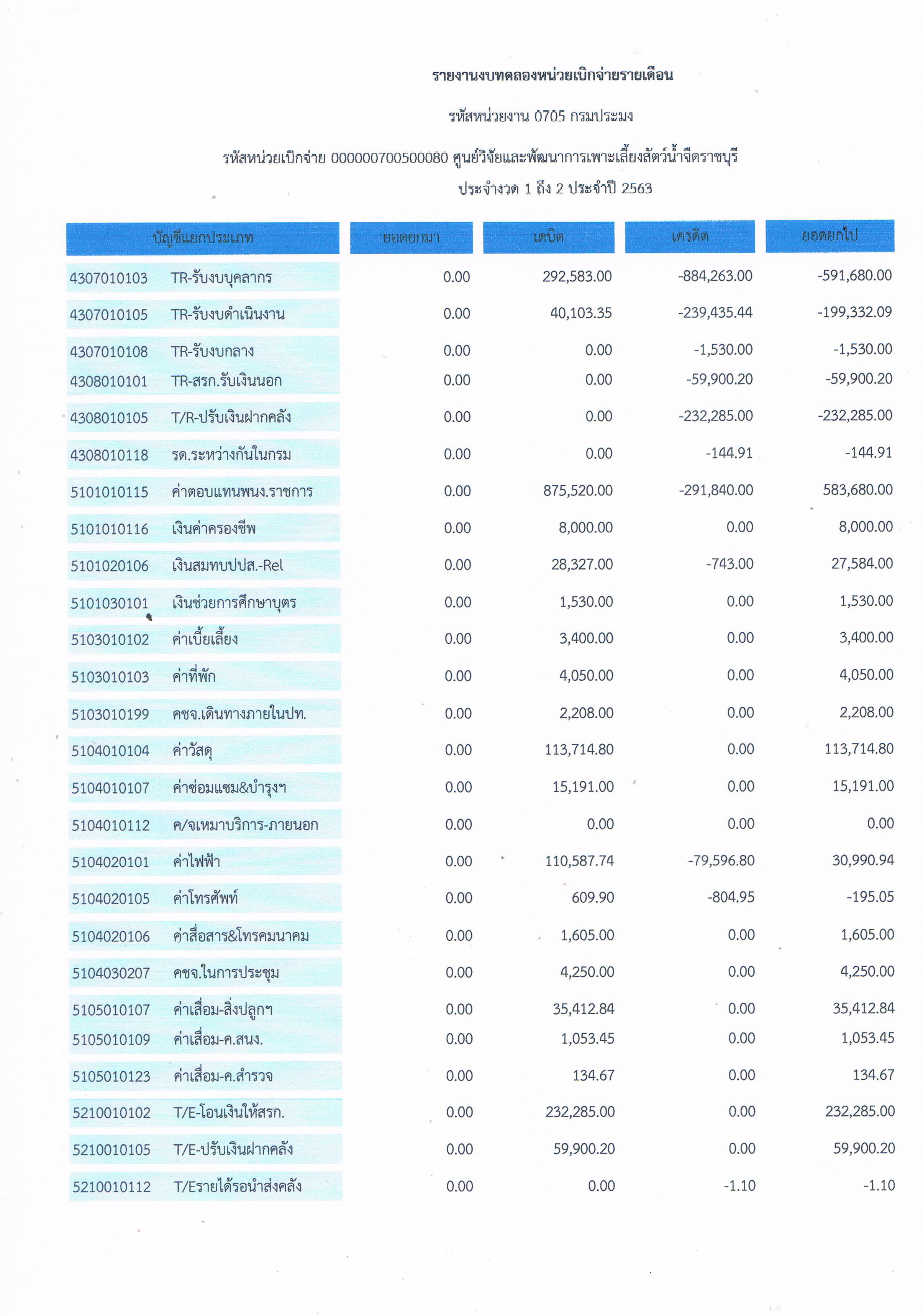 รายงานงบทดลองหน่วยงานเบิกจ่ายรายเดือน พฤศจิกายน 2562 ศูนย์วิจัยและพัฒนาการเพาะเลี้ยงสัตว์น้ำจืดราชบุรี..คลิก