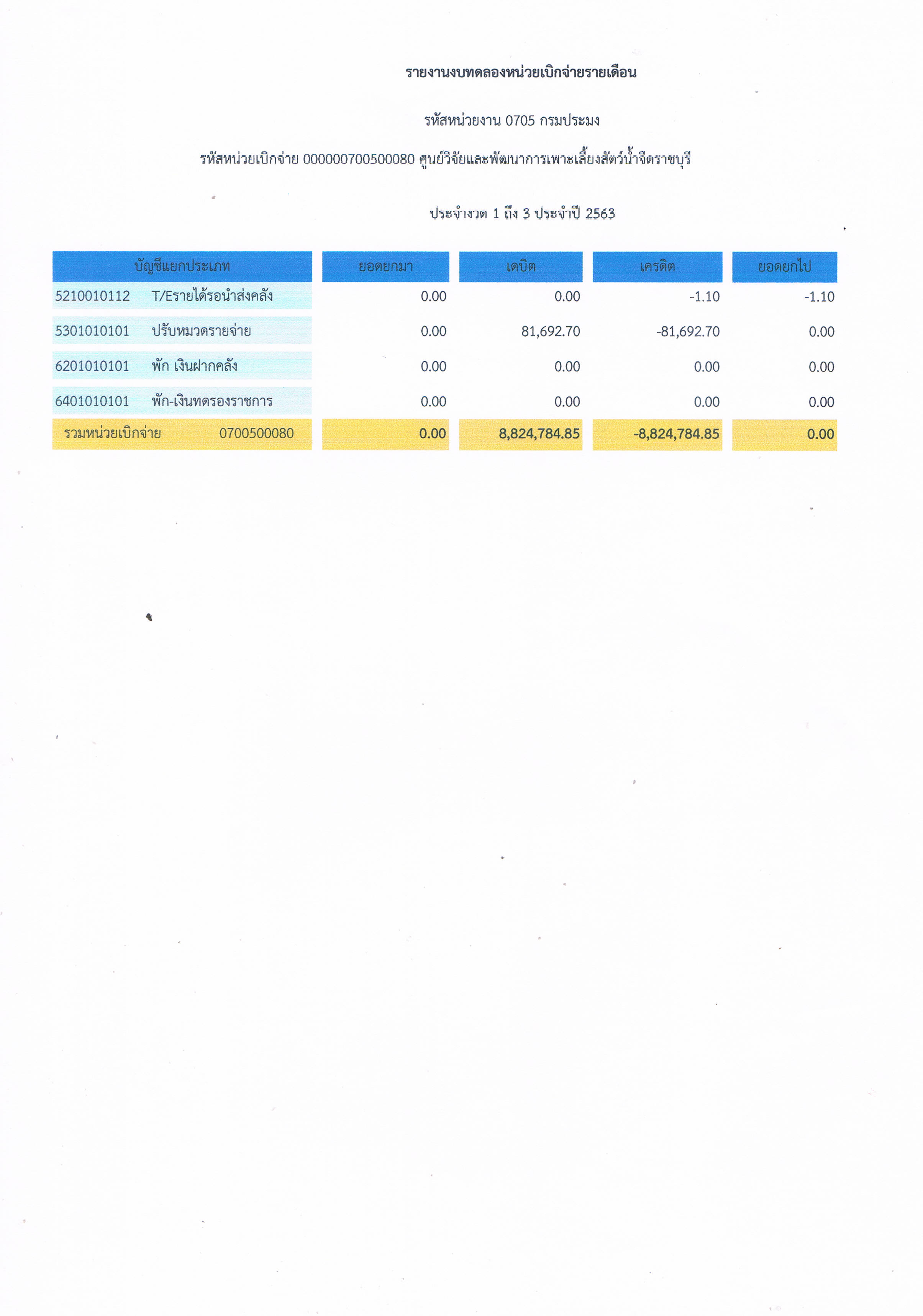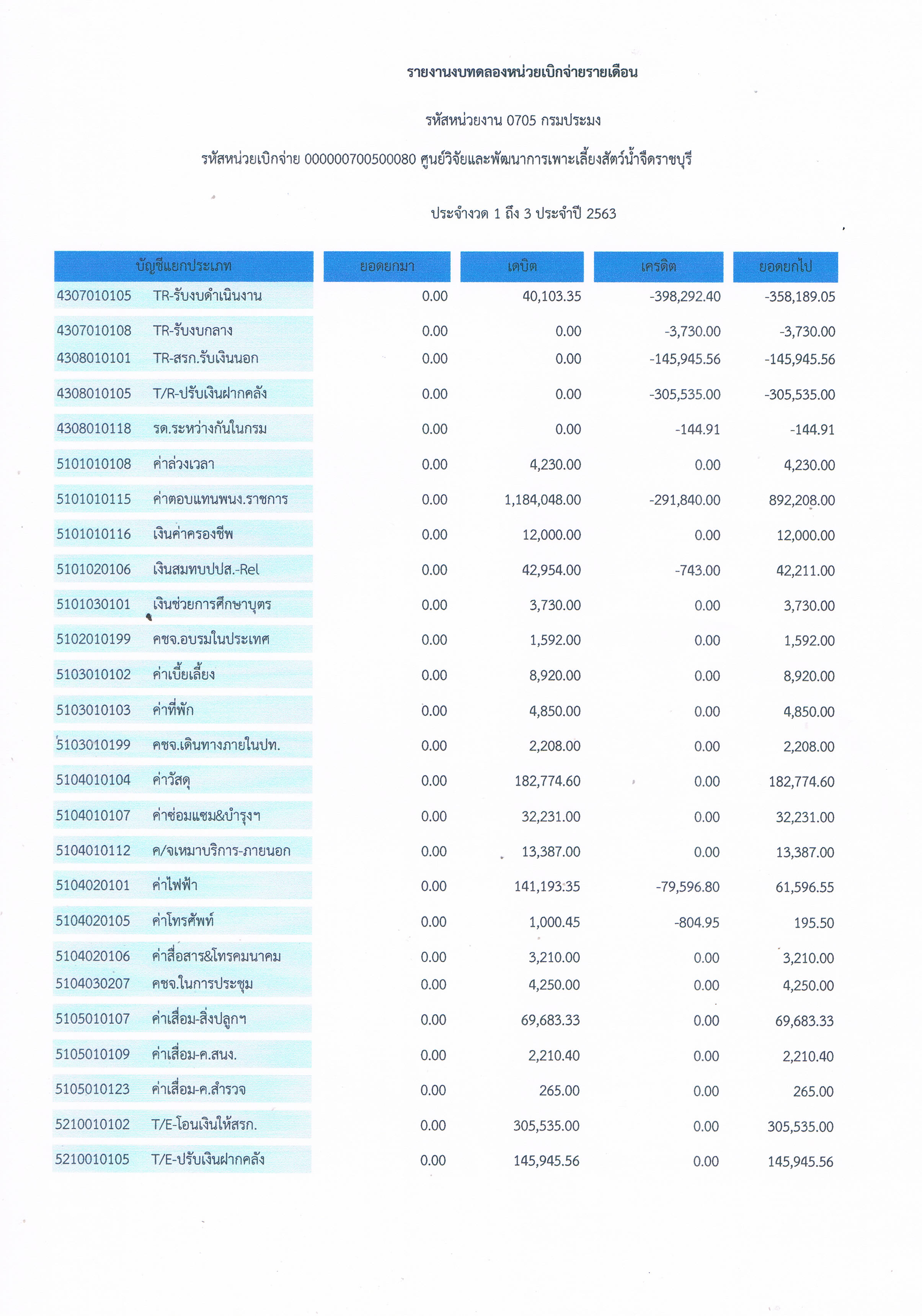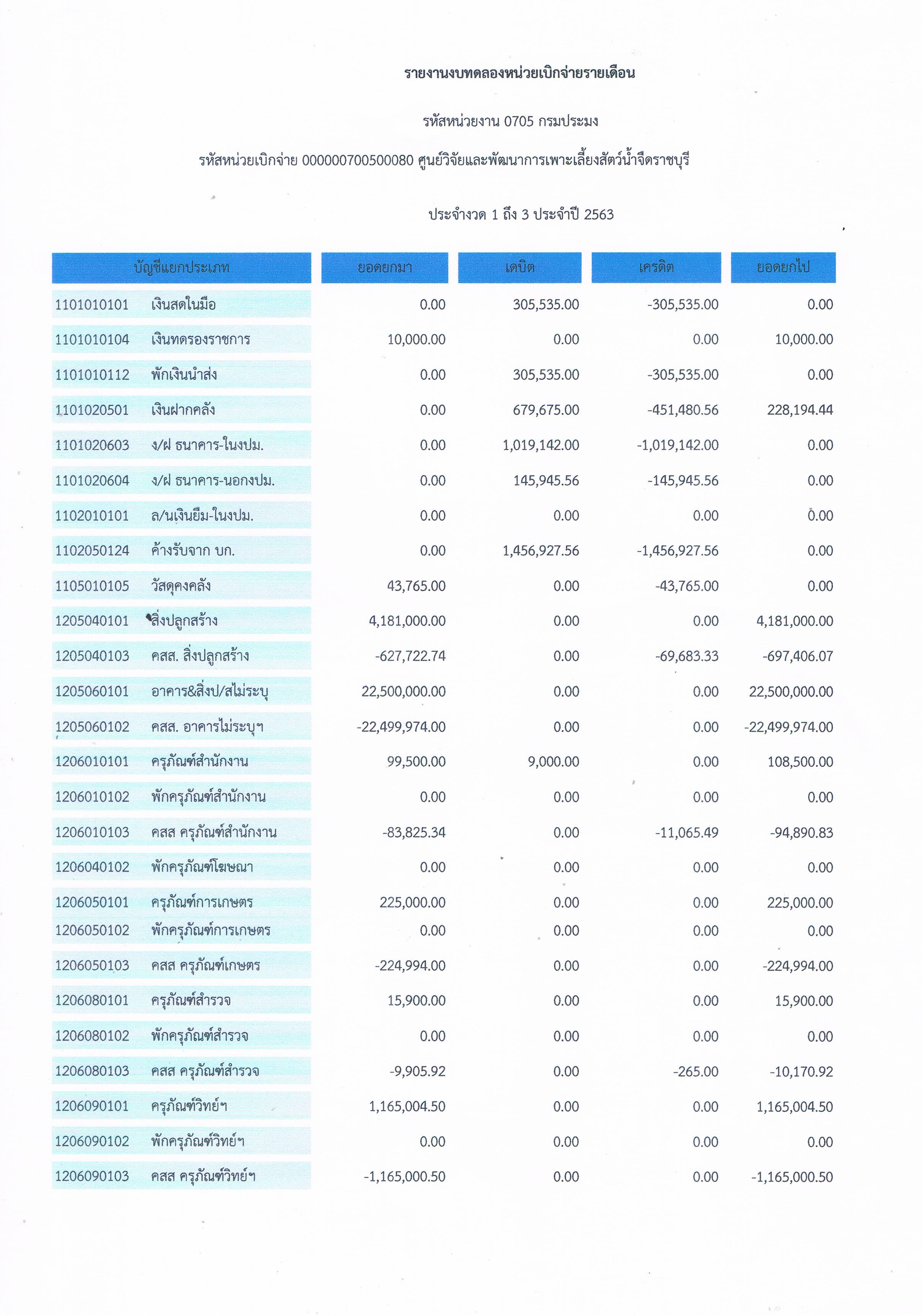 รายงานงบทดลองหน่วยงานเบิกจ่ายรายเดือน ธันวาคม 2562 ศูนย์วิจัยและพัฒนาการเพาะเลี้ยงสัตว์น้ำจืดราชบุรี
