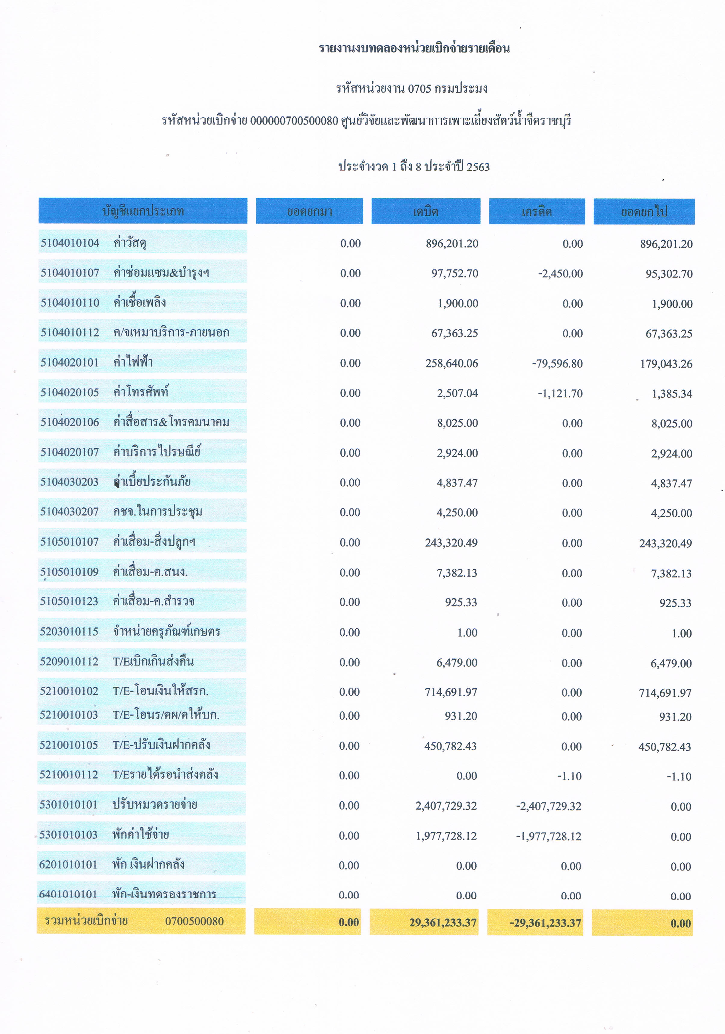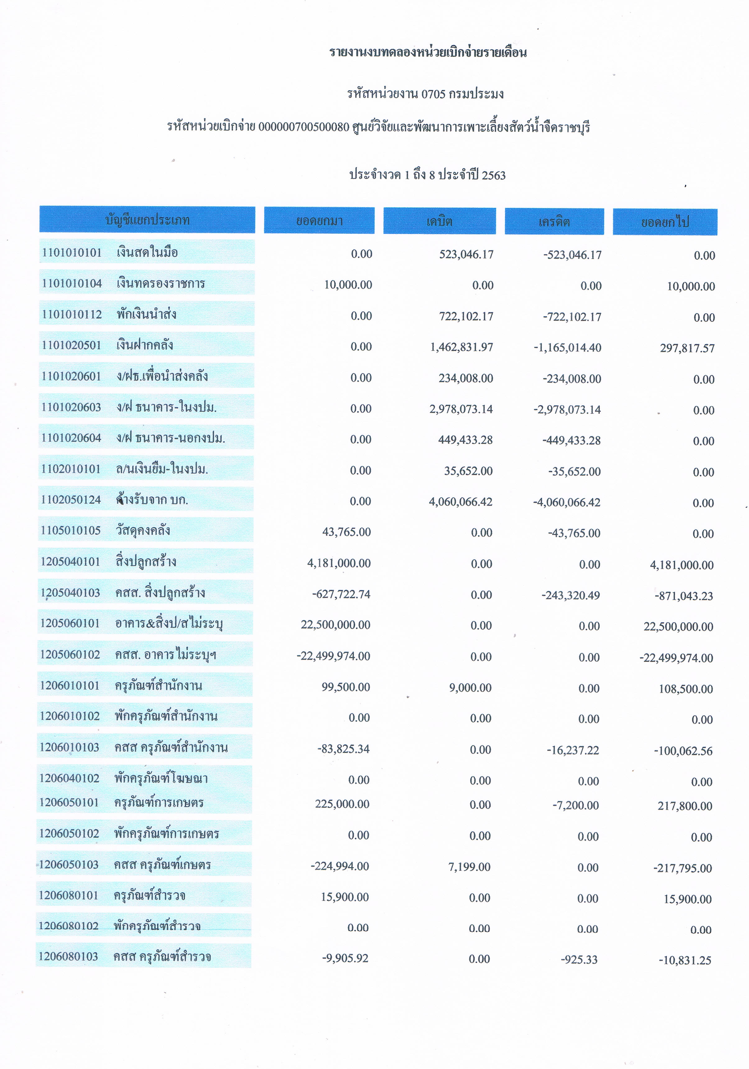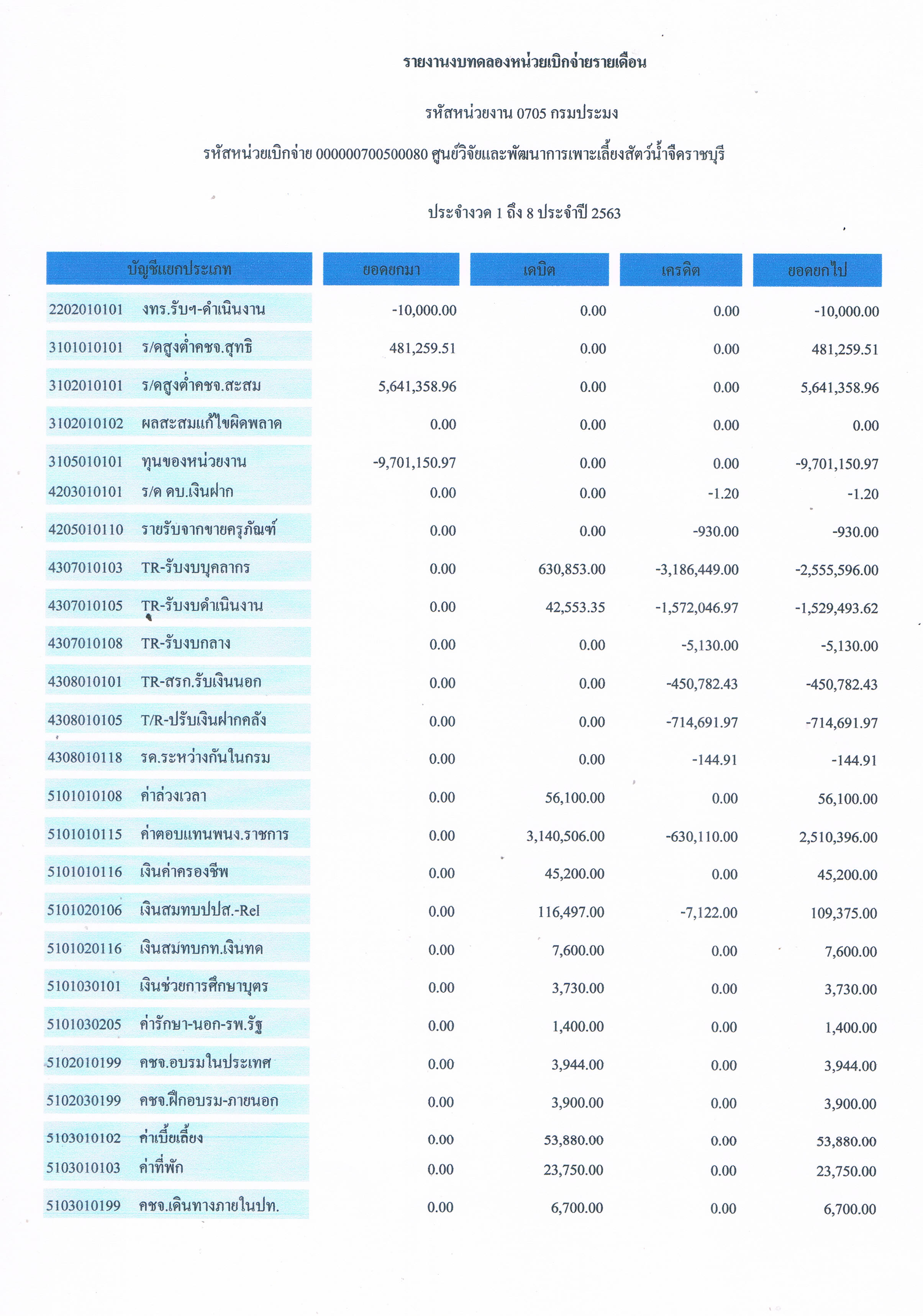 รายงานงบทดลองหน่วยงานเบิกจ่ายรายเดือน พฤษภาคม 2563 ศูนย์วิจัยและพัฒนาการเพาะเลี้ยงสัตว์น้ำจืดราชบุรี