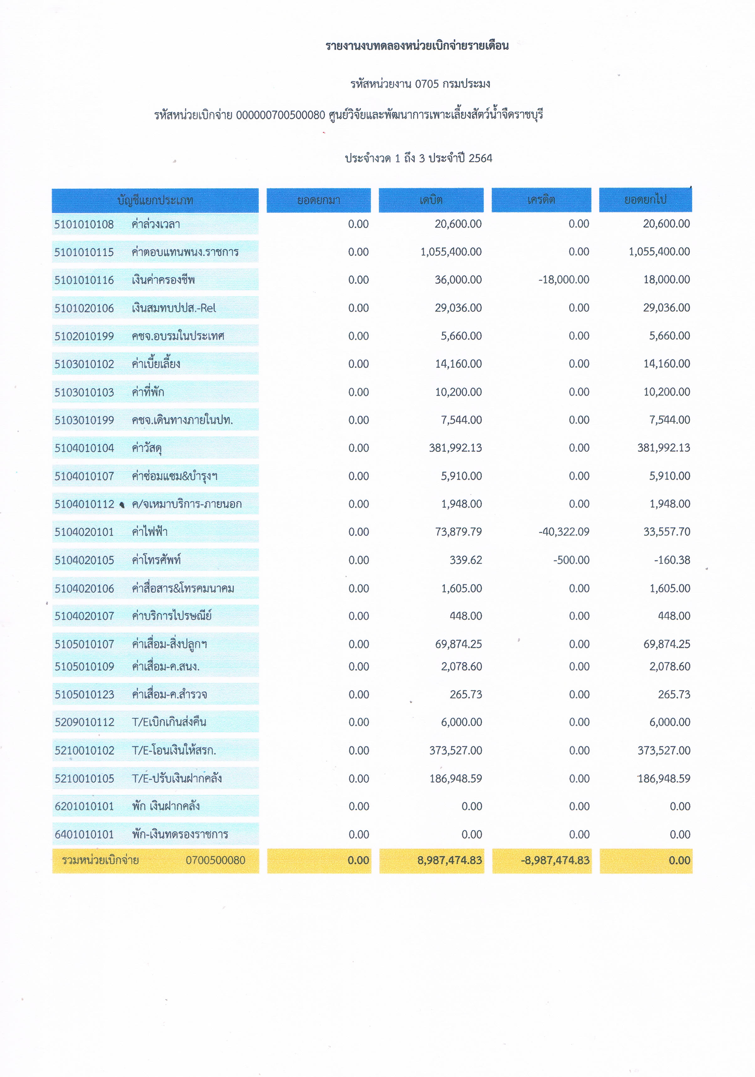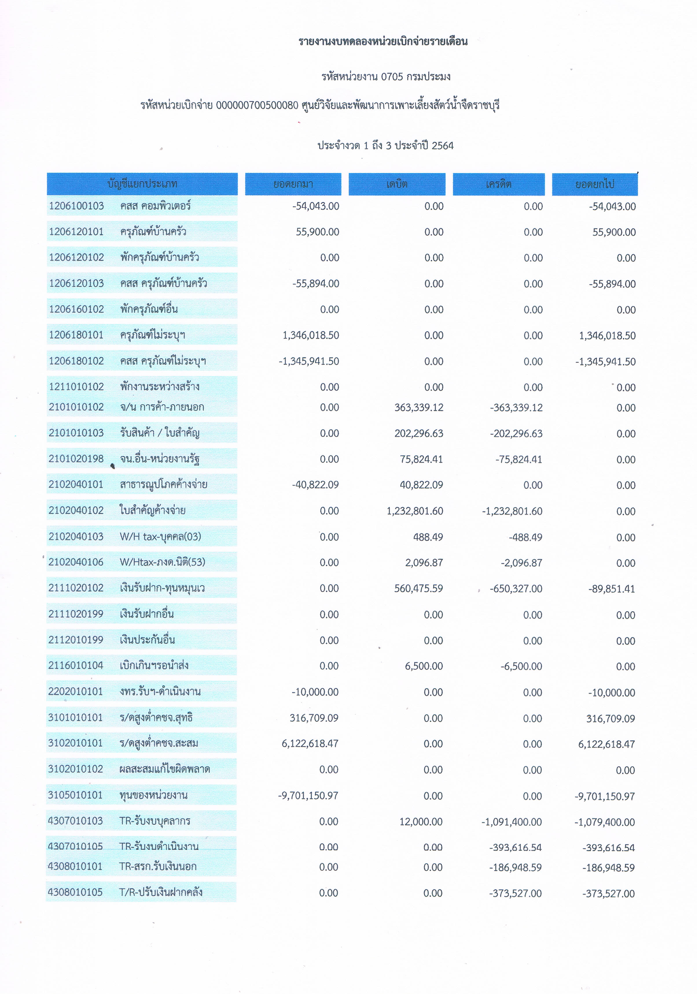 รายงานงบทดลองหน่วยงานเบิกจ่ายรายเดือน ธันวาคม 2563 ศูนย์วิจัยและพัฒนาการเพาะเลี้ยงสัตว์น้ำจืดราชบุรี