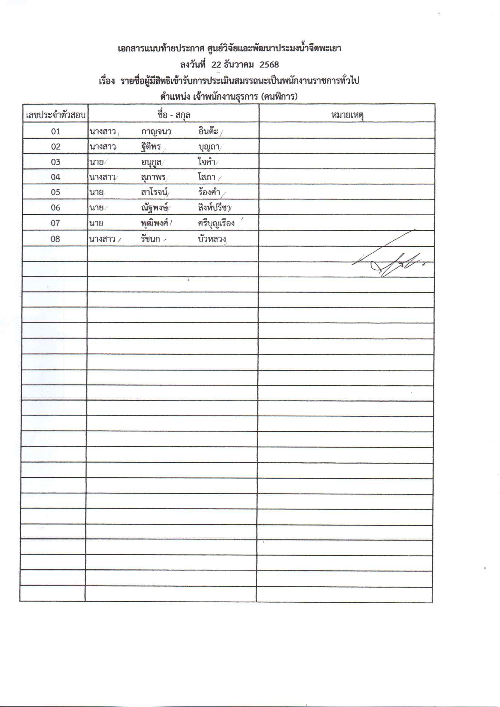 ประกาศรายชื่อผู้มีสิทธิเข้ารับการประเมินสมรรถนะ กำหนดวัน เวลา สถานที่ในการประเมินสมรรถนะ ในตำแหน่ง เจ้าพนักงานธุรการ(คนพิการ)