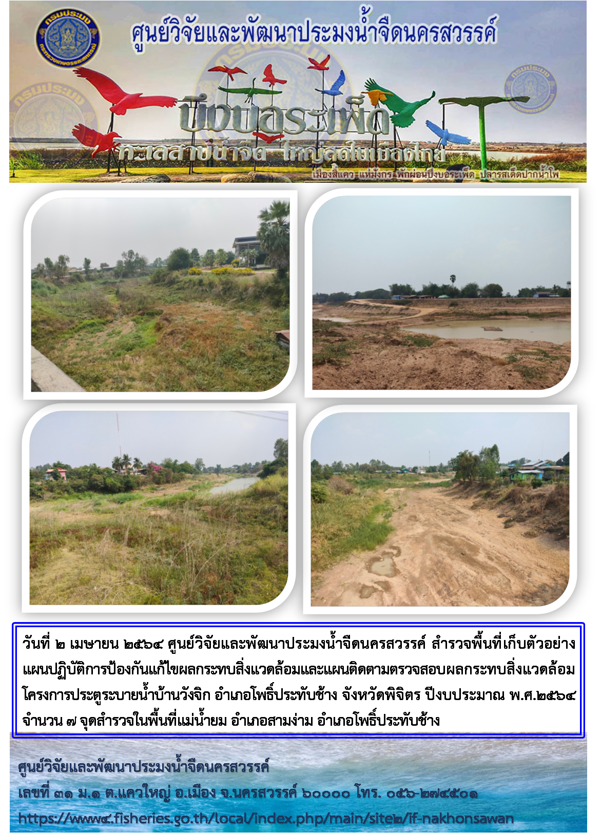วันที่ 2 เมษายน 2564 ศูนย์วิจัยและพัฒนาประมงน้ำจืดนครสวรรค์ สำรวจพื้นที่เก็บตัวอย่างแผนปฏิบัติการป้องกันแก้ไขผลกระทบสิ่งแวดล้อมและแผนติดตามตรวจสอบผลกระทบสิ่งแวดล้อมโครงการประตูระบายน้ำบ้านวังจิก อำเภอโพธิ์ประทับช้าง จังหวัดพิจิตร ปีงบประมาณ 2564 จำนวน 7 จุดสำรวจในพื้นที่ลุ่มแม่น้ำยม อำเภอสามง่าม และอำเภอโพธิ์ประทับช้าง