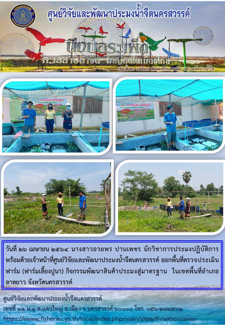 วันที่ 26 เมษายน 2564 นางสาวอวยพร ปานเพชร นักวิชาการประมงปฏิบัติการ พร้อมด้วยเจ้าหน้าที่ศูนย์วิจัยและพัฒนาประมงน้ำจืดนครสวรรค์ ออกพื้นที่ตรวจประเมินฟาร์ม (ฟาร์มเลี้ยงปูนา) กิจกรรมพัฒนาสินค้าประมงสู่มาตรฐาน  ในเขตพื้นที่อำเภอลาดยาว จังหวัดนครสวรรค์