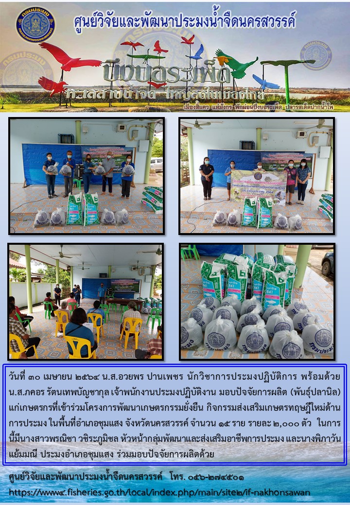 วันที่ 30 เมษายน 2564 นายสุพัตร์ ศรีพัฒน์ ผู้อำนวยการศูนย์วิจัยและพัฒนาประมงน้ำจืดนครสวรรค์ มอบหมายให้นางสาวอวยพร ปานเพชร นักวิชาการประมงปฏิบัติการและนางสาวภคอร รัตนเทพบัญชากุล เจ้าพนักงานประมงปฏิบัติงาน มอบปัจจัยการผลิต (พันธุ์ปลานิล) แก่เกษตรกรที่เข้าร่วมโครงการพัฒนาเกษตรกรรมยั่งยืน กิจกรรมส่งเสริมเกษตรทฤษฎีใหม่ด้านการประมง ประจำปีงบประมาณ 2564 ในเขตพื้นที่อำเภอชุมแสง จังหวัดนครสวรรค์ จำนวน 15 ราย รายละ 2,000 ตัว  ในการนี้มีนางสาวพรณิชา วชิระภูมิชล หัวหน้ากลุ่มพัฒนาและส่งเสริมอาชีพการประมงและนางพิภาวัน แย้มมณี ประมงอำเภอชุมแสง ร่วมมอบปัจจัยการผลิตด้วย