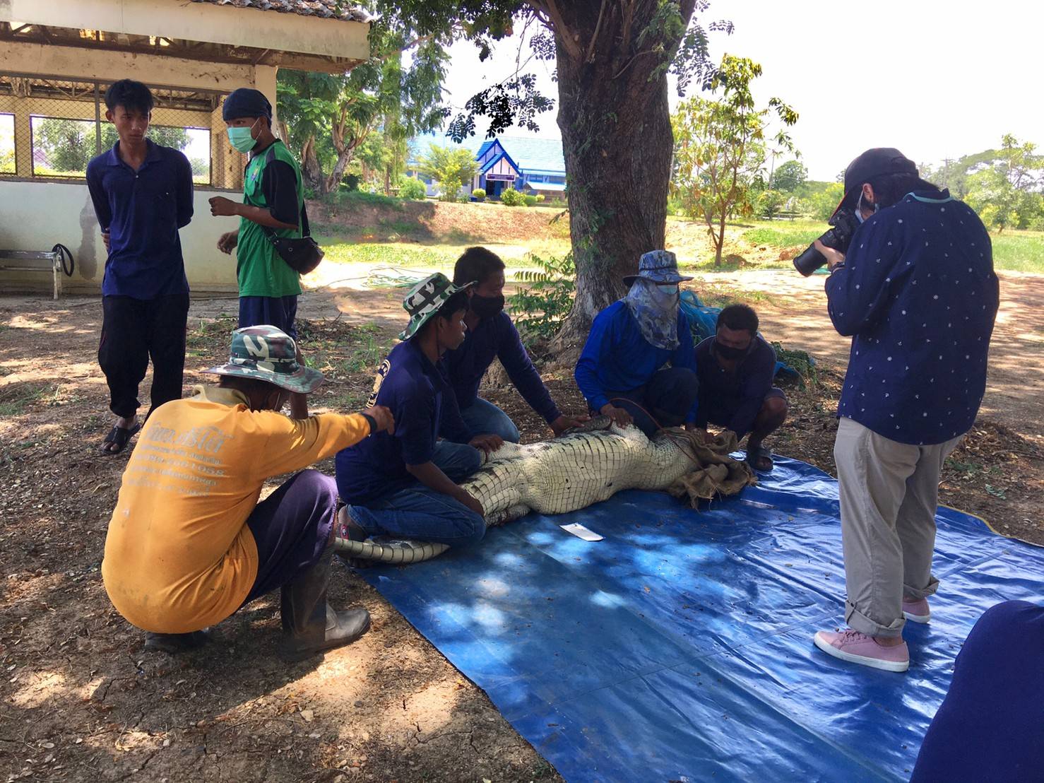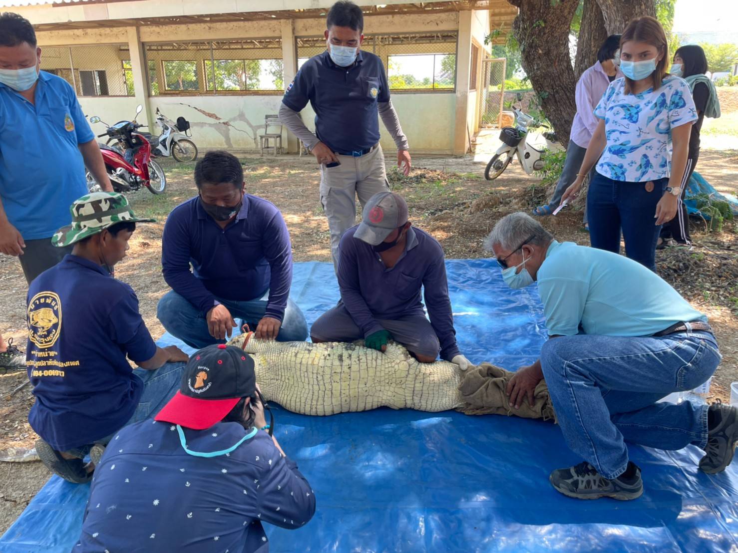 นายเฉลิมพล เพ็ชรรัตน์ ผู้อำนวยการกองวิจัยและพัฒนาประมงน้ำจืด พร้อมด้วยหัวหน้ากลุ่มวิจัยความหลากหลายทางชีวภาพสัตว์น้ำจืดและคณะ เข้าตรวจเยี่ยมและรวบรวมตัวอย่างจระเข้น้ำจืดฯ
