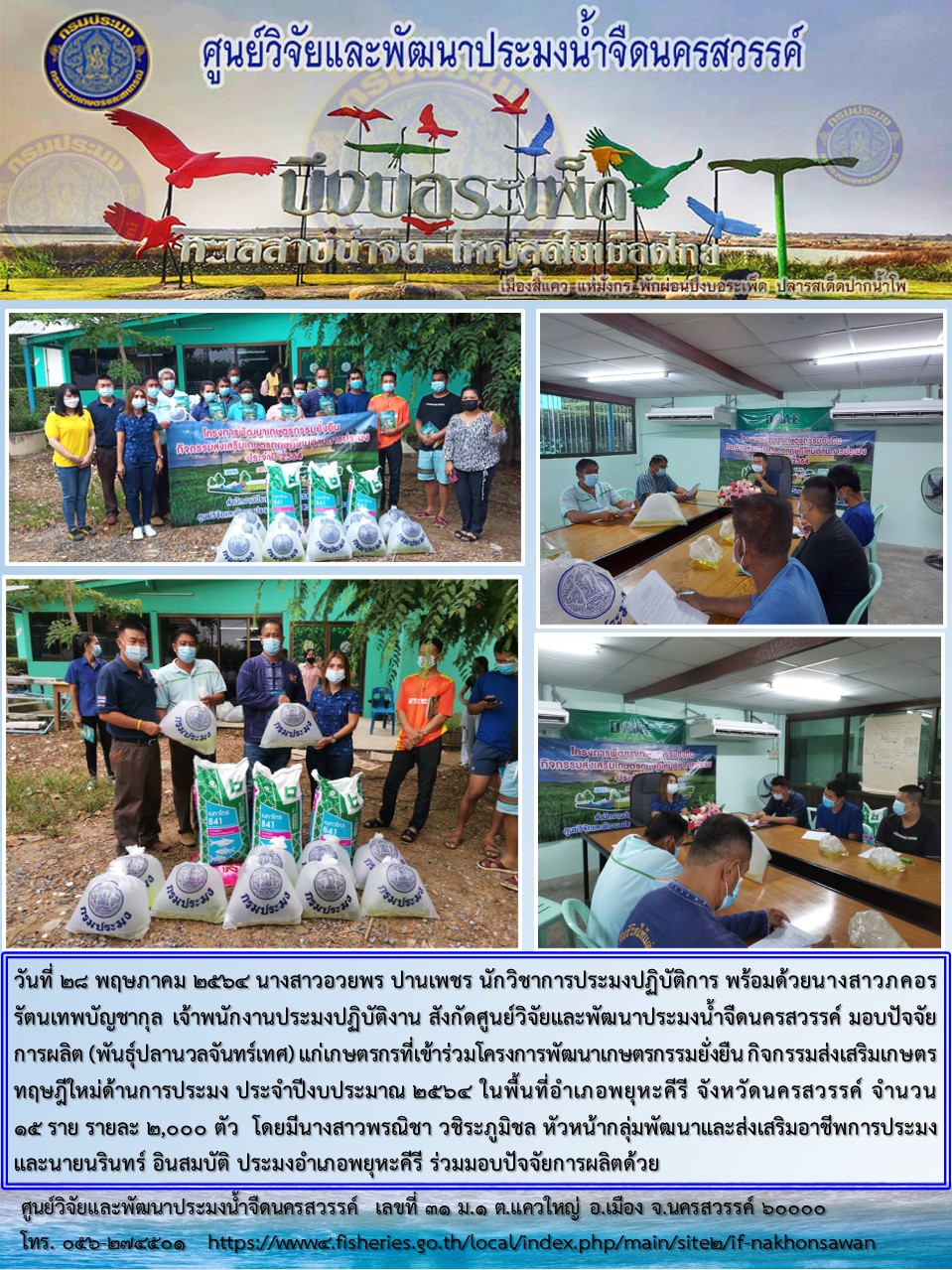 วันที่ 28 พฤษภาคม 2564 นางสาวอวยพร ปานเพชร นักวิชาการประมงปฏิบัติการ พร้อมด้วยนางสาวภคอร รัตนเทพบัญชากุล เจ้าพนักงานประมงปฏิบัติงาน สังกัดศูนย์วิจัยและพัฒนาประมงน้ำจืดนครสวรรค์ มอบปัจจัยการผลิต (พันธุ์ปลานวลจันทร์เทศ) แก่เกษตรกรที่เข้าร่วมโครงการพัฒนาเกษตรกรรมยั่งยืน กิจกรรมส่งเสริมเกษตรทฤษฎีใหม่ด้านการประมง ประจำปีงบประมาณ 2564 ในเขตพื้นที่อำเภอพยุหะคีรี จังหวัดนครสวรรค์ จำนวน 15 ราย รายละ 2,000 ตัว  ในการนี้มีนางสาวพรณิชา วชิระภูมิชล หัวหน้ากลุ่มพัฒนาและส่งเสริมอาชีพการประมง และนายนรินทร์ อินสมบัติ ประมงอำเภอพยุหะคีรี ร่วมมอบปัจจัยการผลิตด้วย