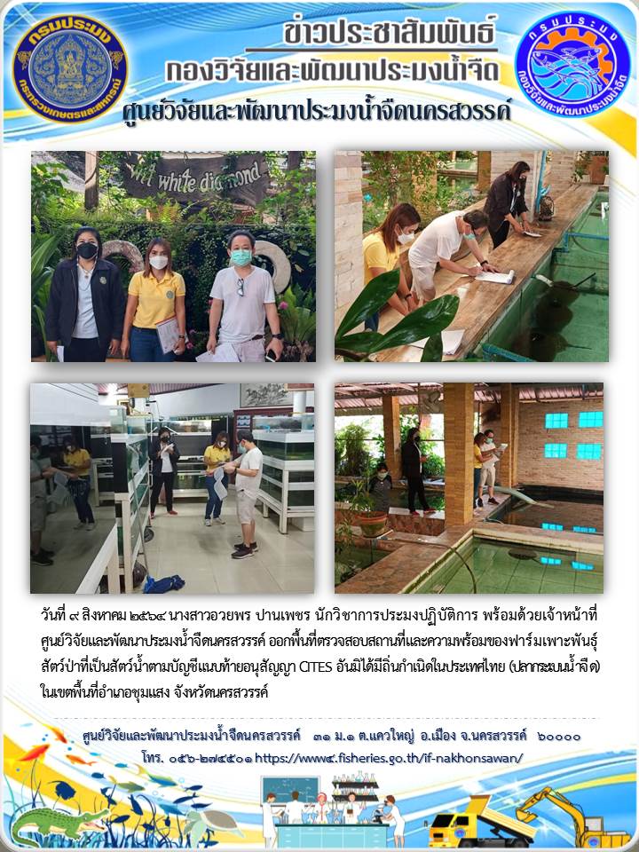 วันที่ 9 สิงหาคม 2564 นางสาวอวยพร ปานเพชร นักวิชาการประมงปฏิบัติการ พร้อมด้วยเจ้าหน้าที่ศูนย์วิจัยและพัฒนาประมงน้ำจืดนครสวรรค์ ออกพื้นที่ตรวจสอบสถานที่และความพร้อมของฟาร์มเพาะพันธุ์สัตว์ป่าที่เป็นสัตว์น้ำตามบัญชีแนบท้ายอนุสัญญา CITES อันมิได้มีถิ่นกำเนิดในประเทศไทย (ปลากระเบนน้ำจืด) ในเขตพื้นที่อำเภอชุมแสง จังหวัดนครสวรรค์
