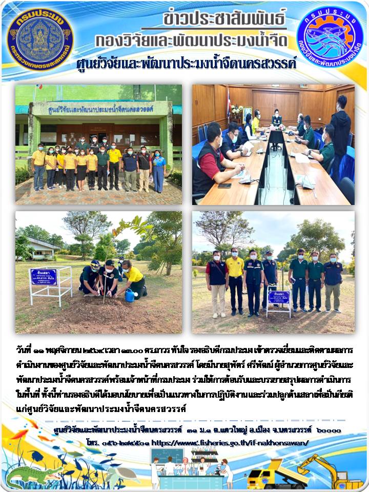วันที่ 11 พฤศจิกายน 2564 เวลา 13.00 น. ณ ศูนย์วิจัยและพัฒนาประมงน้ำจืดนครสวรรค์ ดร.ถาวร ทันใจ รองอธิบดีกรมประมง เข้าตรวจเยี่ยมและติดตามผลการดำเนินงานของศูนย์วิจัยและพัฒนาประมงน้ำจืดนครสวรรค์ โดยมีนายสุพัตร์ ศรีพัฒน์ ผู้อำนวยการศูนย์วิจัยและพัฒนาประมงน้ำจืดนครสวรรค์ นายวิวัฒน์ ปรารมภ์ ประมงจังหวัดนครสวรรค์ นายเดชา รอดระวัง ประมงจังหวัดสุพรรณบุรี และเจ้าหน้าที่กรมประมงให้การต้อนรับและบรรยายสรุปผลการดำเนินการของหน่วยงานในพื้นที่ ทั้งนี้รองอธิบดีได้มอบนโยบายเพื่อเป้นแนวทางในการปฏิบัติงาน โดยมุ่งเน้นให้หน่วยงานกรมประมงในพื้นที่ สร้างการรับรู้ความเข้าใจข่าวสารของกรมประมงที่ถูกต้องไปยังเกษตรกรกลุ่มเป้าหมายให้รวดเร็ว ทั้งนี้ได้ร่วมปลูกต้นเสลา เพื่อเป็นเกียรติแก่ศูนย์วิจัยและพัฒนาประมงน้ำจืดนครสวรรค์