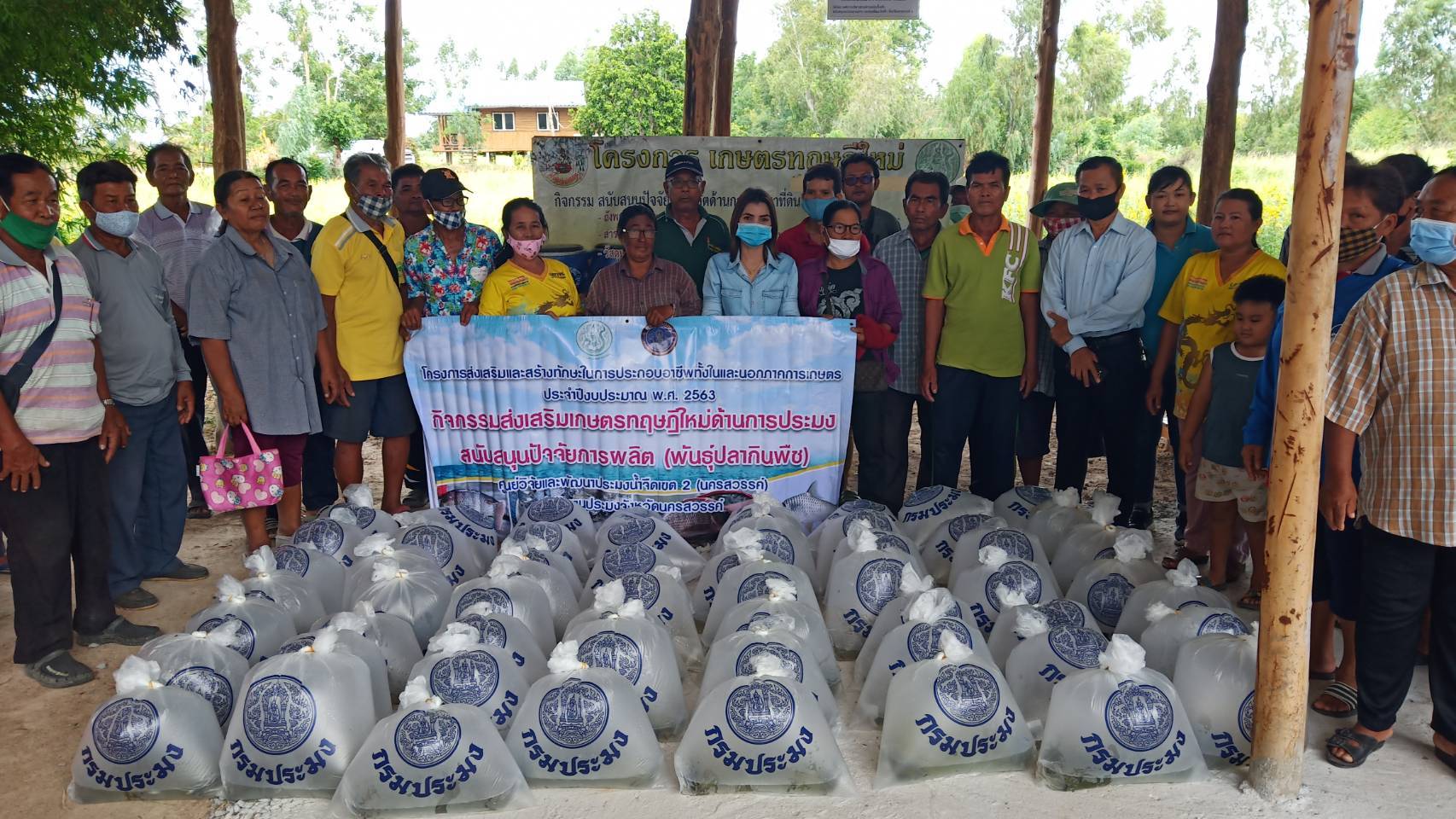 วันที่ 5 สิงหาคม 2563 นายวชิระ กว้างขวาง ผู้อำนวยการศูนย์วิจัยและพัฒนาประมงน้ำจืดเขต 2 (นครสวรรค์) มอบหมายให้นางสาวอวยพร ปานเพชรนักวิชาการประมงปฏิบัติการ มอบปัจจัยการผลิต (พันธุ์ปลาสวาย) ให้แก่เกษตรกรที่เข้าร่วมโครงการส่งเสริมและสร้างทักษะในการประกอบอาชีพทั้งในและนอกภาคการเกษตร ประจำปีงบประมาณ 2563 กิจกรรมส่งเสริมเกษตรทฤษฎีใหม่ด้านการประมง ในเขตพื้นที่อำเภอลาดยาว จังหวัดนครสวรรค์ จำนวน 127 ราย รายละ 1,000 ตัว ในการนี้มีเจ้าหน้าที่จากสำนักงานประมงจังหวัดนครสวรรค์และเจ้าหน้าที่จากสำนักงานพัฒนาที่ดินจังหวัดนครสวรรค์ ร่วมมอบปัจจัยการผลิต (พันธุ์ปลาสวาย) ด้วย