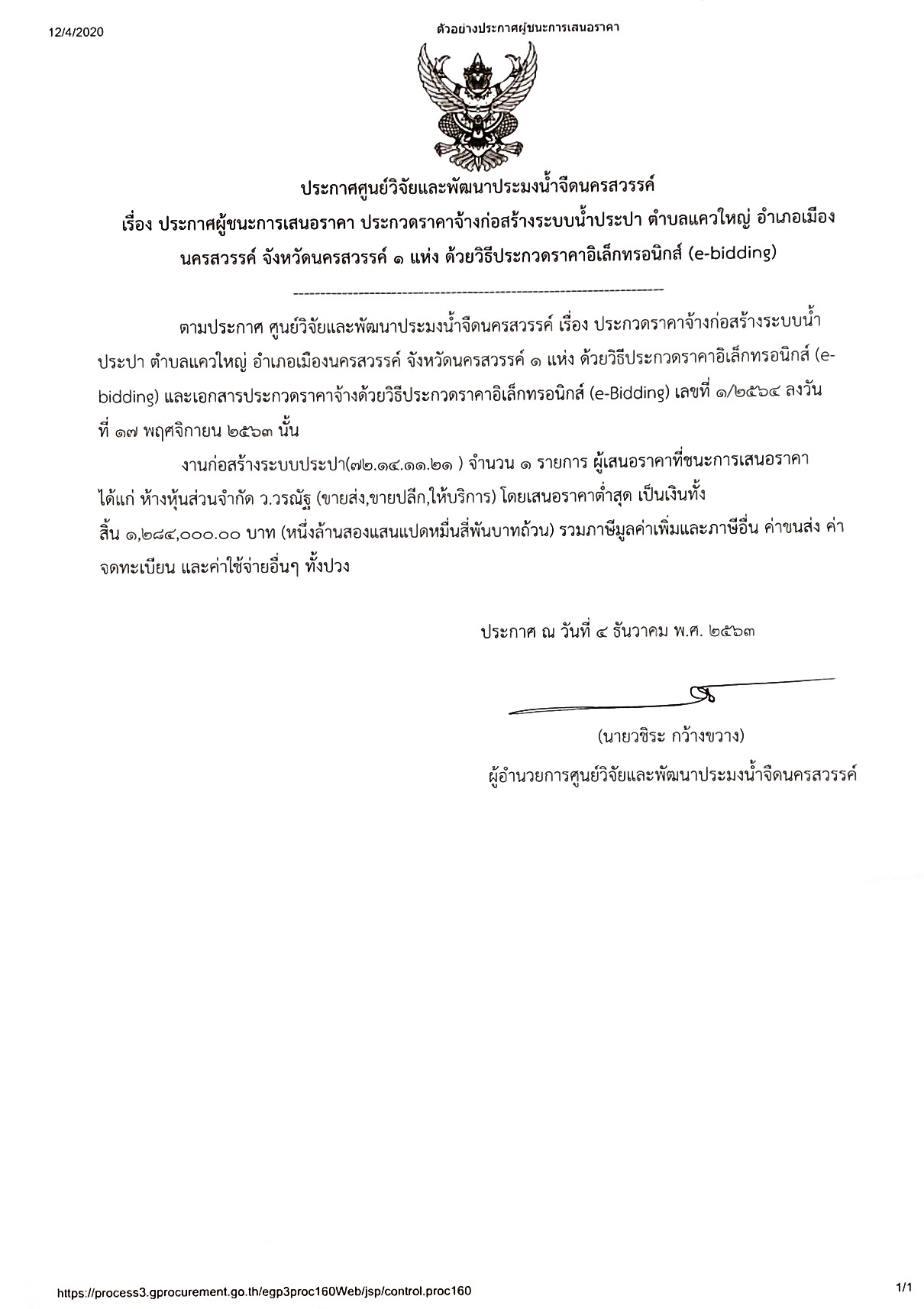ประกาศศูนย์วิจัยและพัฒนาประมงน้้ำจืดนครสวรรค์ เรื่อง ประกาศผู้ชนะการเสนอราคา ประกวดราคาจ้างก่อสร้างระบบน้ำปะปา ตำบลแควใหญ่ อำเภอเมือง จังหวัดนครสวรรค์