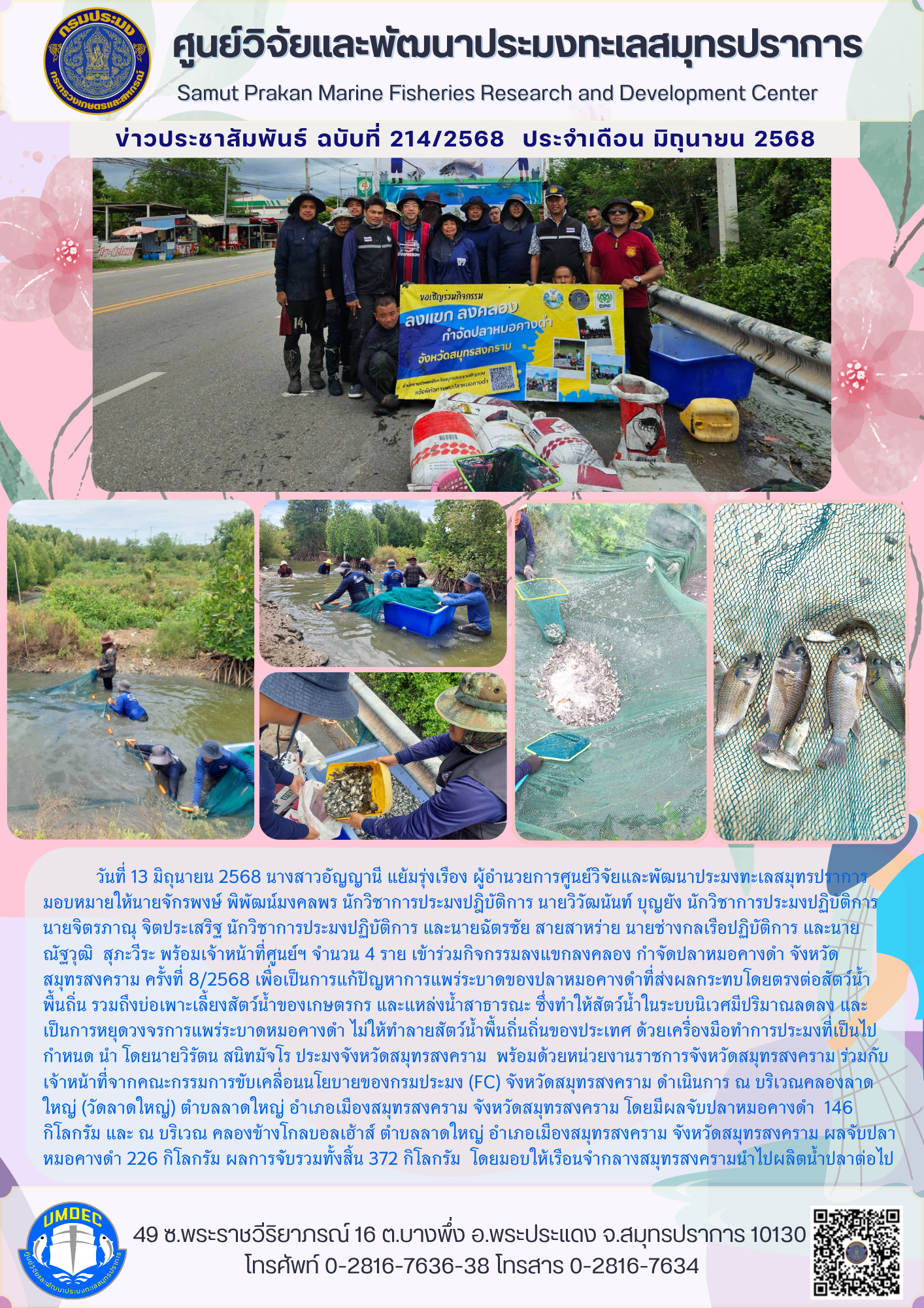 วันที่ 13 มิถุนายน 2568 นางสาวอัญญานี แย้มรุ่งเรือง ผู้อำนวยการศูนย์วิจัยและพัฒนาประมงทะเลสมุทรปราการ มอบหมายให้นายจักรพงษ์ พิพัฒน์มงคลพร นักวิชาการประมงปฎิบัติการ นายวิวัฒนันท์ บุญยัง นักวิชาการประมงปฏิบัติการ นายจิตรภาณุ จิตประเสริฐ นักวิชาการประมงปฏิบัติการ และนายฉัตรชัย สายสาหร่าย นายช่างกลเรือปฏิบัติการ และนายณัฐวุฒิ  สุภะวีระ พร้อมเจ้าหน้าที่ศูนย์ฯ จำนวน 4 ราย เข้าร่วมกิจกรรมลงแขกลงคลอง กำจัดปลาหมอคางดำ จังหวัดสมุทรสงคราม ครั้งที่ 8/2568 เพื่อเป็นการแก้ปัญหาการแพร่ระบาดของปลาหมอคางดำที่ส่งผลกระทบโดยตรงต่อสัตว์น้ำพื้นถิ่น รวมถึงบ่อเพาะเลี้ยงสัตว์น้ำของเกษตรกร และแหล่งน้ำสาธารณะ ซึ่งทำให้สัตว์น้ำในระบบนิเวศมีปริมาณลดลง และเป็นการหยุดวงจรการแพร่ระบาดหมอคางดำ ไม่ให้ทำลายสัตว์น้ำพื้นถิ่นถิ่นของประเทศ ด้วยเครื่องมือทำการประมงที่เป็นไปกำหนด นำ โดยนายวิรัตน สนิทมัจโร ประมงจังหวัดสมุทรสงคราม  พร้อมด้วยหน่วยงานราชการจังหวัดสมุทรสงคราม ร่วมกับเจ้าหน้าที่จากคณะกรรมการขับเคลื่อนนโยบายของกรมประมง (FC) จังหวัดสมุทรสงคราม ดำเนินการบริเวณคลองลาดใหญ่ (วัดลาดใหญ่) ตำบลลาดใหญ่ อำเภอเมืองสมุทรสงคราม จังหวัดสมุทรสงคราม โดยมีผลจับปลาหมอคางดำ 146 กิโลกรัม และบริเวณ คลองข้างโกลบอลเฮ้าส์ ตำบลลาดใหญ่ อำเภอเมืองสมุทรสงคราม จังหวัดสมุทรสงคราม ผลจับปลาหมอคางดำ 226 กิโลกรัม ผลการจับรวมทั้งสิ้น 372 กิโลกรัม  โดยมอบให้เรือนจำกลางสมุทรสงครามนำไปผลิตน้ำปลาต่อไป