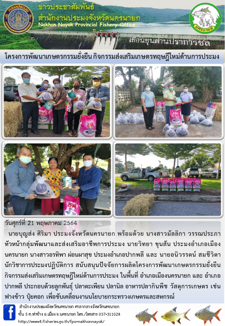 นายบุญส่ง ศิริมา ประมงจังหวัดนครนายก พร้อมด้วย นางสาวมัลลิกา วรรณประภา หัวหน้ากลุ่มพัฒนาและส่งเสริมอาชีพการประมง นายวิทยา ขุนสัน ประมงอำเภอเมืองนครนายก นางสาวอรทิพา ผ่อนผาสุข ประมงอำเภอปากพลี และ นายอนิวรรตน์ สมชีวิตา นักวิชาการประมงปฏิบัติการ สนับสนุนปัจจัยการผลิตโครงการพัฒนาเกษตรกรรมยั่งยืน กิจกรรมส่งเสริมเกษตรทฤษฎีใหม่ด้านการประมง ในพื้นที่ อำเภอเมืองนครนายก และ อำเภอปากพลี ประกอบด้วยลูกพันธุ์ ปลาตะเพียน ปลานิล อาหารปลากินพืช วัสดุการเกษตร เช่น ฟางข้าว ปุ๋ยคอก เพื่อขับเคลื่อนงานนโยบายกระทรวงเกษตรและสหกรณ์