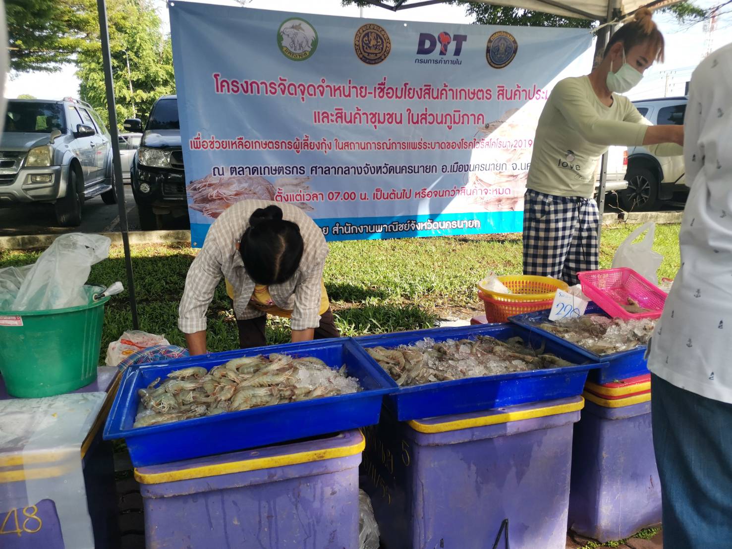จังหวัดนครนายก ร่วมกับ สำนักงานประมงจังหวัดนครนายก และ สำนักงานพาณิชย์จังหวัดนครนายก ช่วยเหลือเกษตรกรผู้เลี้ยงกุ้งขาวในจังหวัดนครนายก เปิดตลาดการค้าเสรีให้เกษตรกรได้พบกับผู้ซื้อโดยตรง จากผลกระทบของสถานการณ์การแพร่ระบาดของโรคติดเชื้อไวรัสโคโรนา 2019 (COVID-19) ส่งผลให้ราคาสินค้าสัตว์น้ำ และเศรษฐกิจไทยตกต่ำเป็นประวัติการณ์ ณ บริเวณตลาดนัดเกษตรกร ศาลากลางจังหวัดนครนายก ซึ่งมีประชาชนจำนวนมากสนใจในการจับจ่ายซื้อกุ้งขาวสด ส่งตรงมาจากบ่อเลี้ยงของเกษตรกรโดยตรง ซึ่งถ้าต้องการกุ้งที่สดกว่านี้ก็ลงบ่อไปจับเองแล้ว แถมยังราคาถูกมากเหมือนแจกฟรี หาซื้อที่อื่นไม่ได้อีกแล้วนอกจากมาจังหวัดนครนายก เพื่อซื้อกุ้งขาวราคาถูก สดๆ จากบ่อ ของขึ้นชื่อเมืองนครนายก โดยราคากุ้งขาวที่นำมาจำหน่ายวันนี้ มีดังนี้ กุ้งขาว ขนาด 25-30 ตัว/กิโลกรัม ราคา กิโลกรัม 220 บาท ขนาด 45-50 ตัว/กิโลกรัม ราคา กิโลกรัม 180 บาท และสามารถใช้สแกนโครงการ "คนละครึ่ง" ได้อีกด้วย