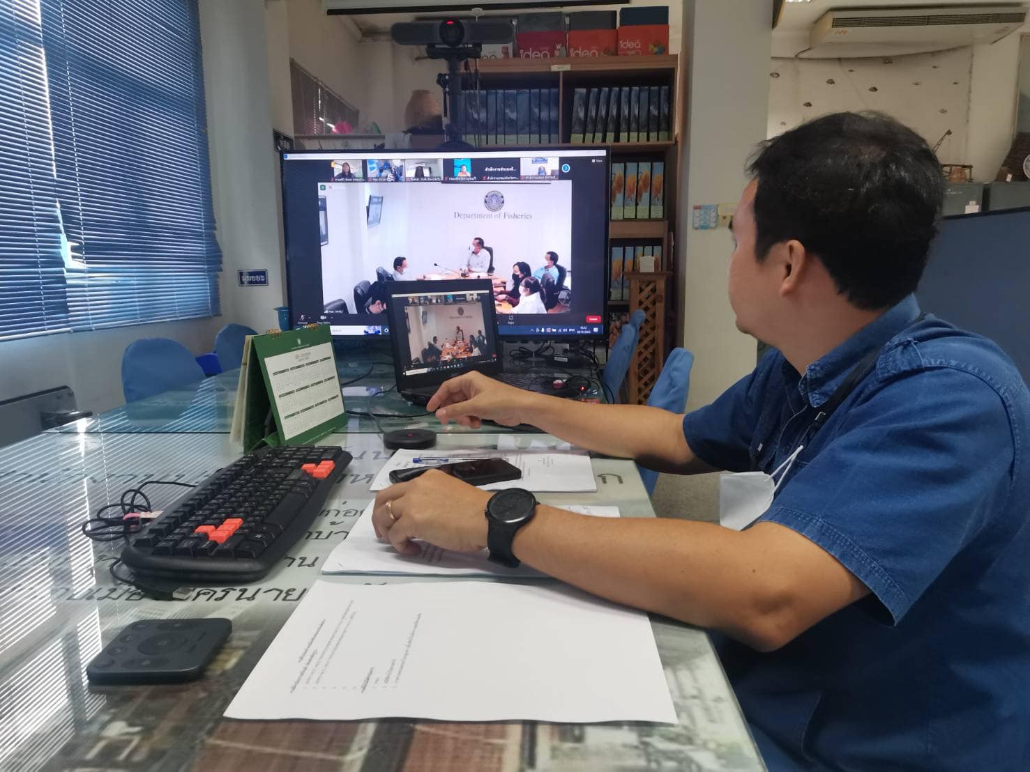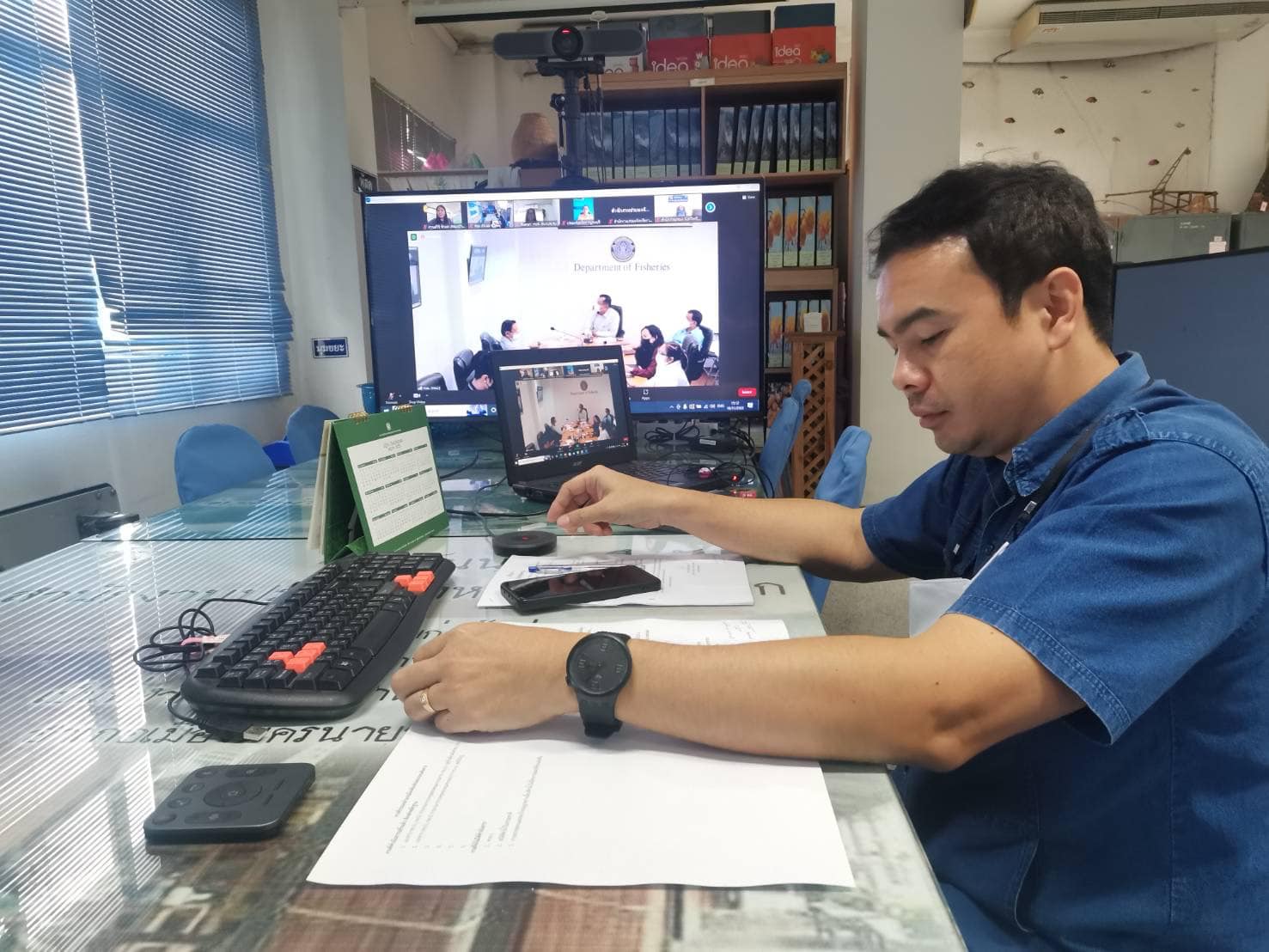 นางสาวรัชนีบูลย์ ทิพย์เนตร รักษาราชการแทนประมงจังหวัดนครนายก มอบหมายให้นายประประภาส พิมลกนกวรรณ เจ้าพนักงานประมงชำนาญงาน ประชุมหารือการพิจารณาข้อมูลการออกใบอนุญาติให้ทำการเพาะเลี้ยงสัตว์น้ำในที่จับสัตว์น้ำซึ่งเป็นสาธารณสมบัติแผ่นดินเพื่อจัดทำร่างกฎกระทรวงยกเว้นค่าธรรมเนียมใบอนุญาตให้ทำการเพาะเลี้ยงสัตว์น้ำในที่จับสัตว์น้ำซึ่งเป็นสาธารณสมบัติแผ่นดิน ผ่านระบบ Zoom Application
