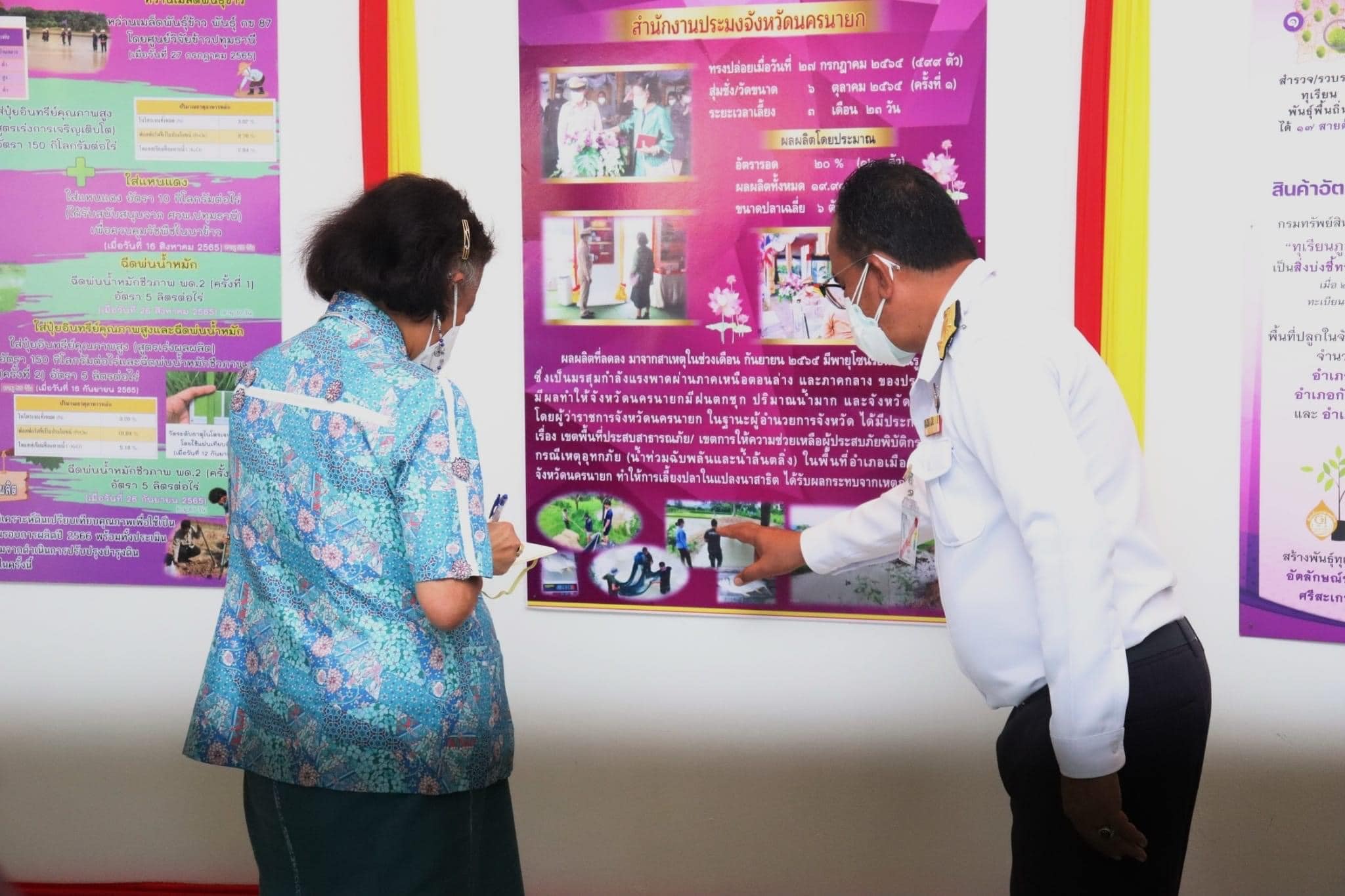 จังหวัดนครนายก ดังนี้ กรมประมง ได้ดำเนินการปรับปรุงแปลงนาที่ 8 ประมาณ 0.5 ไร่ กว้าง 8 เมตร ยาว 20 เมตร พื้นที่ 160 ตารางเมตร เพื่อทำเป็นบ่อรวบรวมปลา และดำเนินการปล่อยปลาตะเพียนขาว ขนาด 5 - 7 เซนติเมตร จำนวน 599 ตัว เมื่อวันที่ 27 กรกฎาคม 2565 การเลี้ยงปลาใช้วิธีการ ทำปุ๋ยคอกหมัก เพื่อเป็นอาหารธรรมชาติ และช่วยลดต้นทุนการผลิต โดยมีเป้าหมายผลผลิตที่คาดว่าจะได้รับ จำนวน 100 กิโลกรัม ในการนี้ได้ทำการติดตามการเจริญเติบโตของปลา จำนวน 1 ครั้ง เมื่อวันที่ 6 ตุลาคม 2565 คาดว่ามีผลผลิตคงเหลือประมาณ 20 กิโลกรัม ขนาดปลาตะเพียนขาว 6 ตัวต่อกิโลกรัม ผลผลิตที่ไม่ได้ตามเป้าหมายเนื่องมาจากได้รับผลกระทบจากอิทธิพล พายุโซนร้อน “โนรู” ทำให้มีน้ำหลากท่วมแปลงนาสาธิตกระทบ ต่อการเลี้ยงปลาตะเพียนขาวในแปลงนาสาธิต การขยายผลจากการเลี้ยงปลาในนาข้าว กรมประมง จะดำเนินการ มอบพ่อแม่พันธุ์ปลาตะเพียนขาว ที่ได้จากการเลี้ยงให้กับโรงเรียน ทหารการสัตว์ กรมการสัตว์ทหารบก สำหรับเพาะพันธุ์เพื่อแจกจ่าย ให้เกษตรกรโครงการต่าง ๆ และมอบพ่อแม่พันธุ์ปลาตะเพียนขาว ให้กับองค์กรชุมชนประมงท้องถิ่น กลุ่มเลี้ยงปลาในกระชัง เขื่อนขุนด่านปราการชล สำหรับเพาะพันธุ์เพื่อปล่อยลงเพิ่มผลผลิตสัตว์น้ำในแม่น้ำนครนายก เนื่องในโอกาสวันสำคัญต่าง ๆ ต่อไป