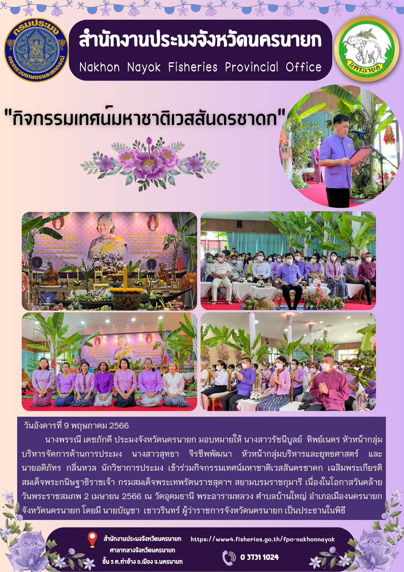 นางพรรณี เดชภักดี ประมงจังหวัดนครนายก มอบหมายให้ นางสาวรัชนีบูลย์ ทิพย์เนตร หัวหน้ากลุ่มบริหารจัดการด้านการประมง นางสาวสุทธา จิรชีพพัฒนา หัวหน้ากลุ่มบริหารและยุทธศาสตร์ และ นายอดิภัทร กลิ่นหวล นักวิชาการประมง เข้าร่วมกิจกรรมเทศน์มหาชาติเวสสันดรชาดกเฉลิมพระเกียรติสมเด็จพระกนิษฐาธิราชเจ้า กรมสมเด็จพระเทพรัตนราชสุดาฯ สยามบรมราชกุมารี เนื่องในโอกาสวันคล้ายวันพระราชสมภพ 2 เมษายน 2566 ณ วัดอุดมธานี พระอารามหลวง ตำบลบ้านใหญ่ อำเภอเมืองนครนายก จังหวัดนครนายก โดยมี นายบัญชา เชาวรินทร์ ผู้ว่าราชการจังหวัดนครนายก เป็นประธานในพิธี