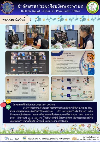 นางพรรณี เดชภักดี ประมงจังหวัดนครนายก มอบหมายให้นายปรเมศร์ อรุณ หัวหน้ากลุ่มพัฒนาและส่งเสริมอาชีพการประมง เข้าร่วมประชุมหารือจัดทำสายการผลิตกุ้งทะเลภายในประเทศ และการค้าชายแดนเพื่อประกอบการจัดทำระบบ APD ของกรมประมง ผ่านระบบ Zoom Meeting โดยมีนางสุทธินี ลิ้มธรรมมหิศร ผู้อำนวยการกองวิจัยและพัฒนาการเพาะเลี้ยงสัตว์น้ำชายฝั่ง เป็นประธานการประชุม
