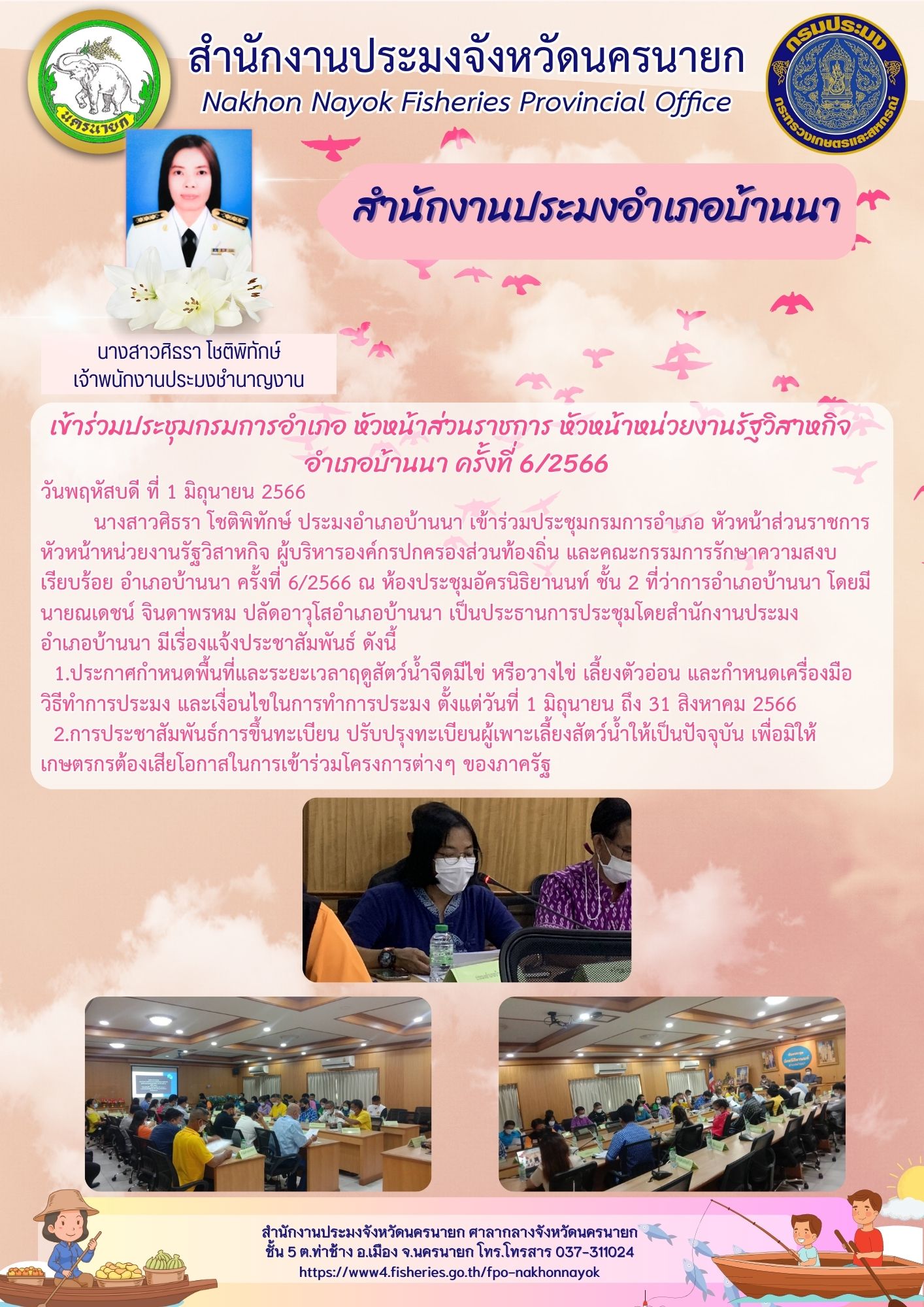 นางสาวศิธรา โชติพิทักษ์ ประมงอำเภอบ้านนา เข้าร่วมประชุมกรมการอำเภอ หัวหน้าส่วนราชการ หัวหน้าหน่วยงานรัฐวิสาหกิจ ผู้บริหารองค์กรปกครองส่วนท้องถิ่น และคณะกรรมการรักษาความสงบเรียบร้อย อำเภอบ้านนา ครั้งที่ 6/2566 ณ ห้องประชุมอัครนิธิยานนท์ ชั้น 2 ที่ว่าการอำเภอบ้านนา โดยมีนายณเดชน์ จินดาพรหม ปลัดอาวุโสอำเภอบ้านนา เป็นประธานการประชุมโดยสำนักงานประมงอำเภอบ้านนา มีเรื่องแจ้งประชาสัมพันธ์ ดังนี้
