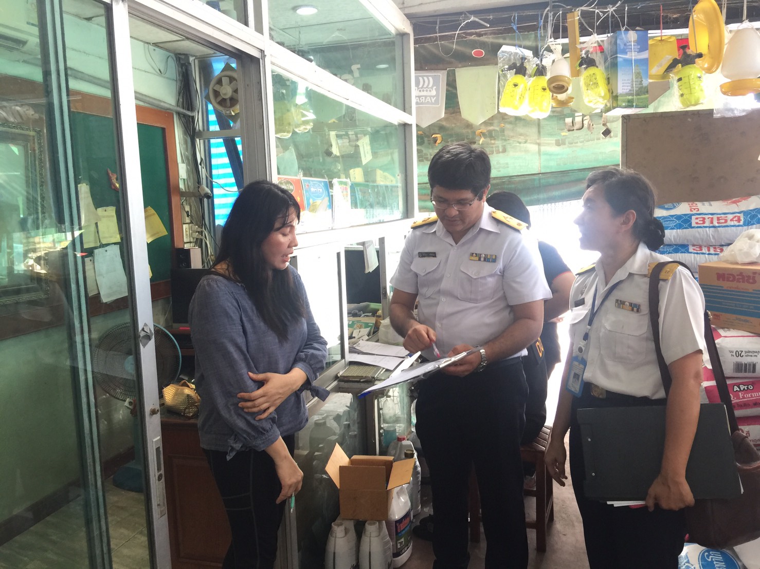 นายบุญส่ง ศิริมา ประมงจังหวัดนครนายก มอบหมายให้ นางสาวรัชนีบูลย์ ทิพย์เนตร ประมงอำเภอองครักษ์ และนางสาวมัลลิกา วรรณประภา หัวหน้ากลุ่มพัฒนาและส่งเสริมอาชีพการประมง เข้าร่วมตรวจปัจจัยการผลิตกับ นายจิติวัฒนา เหล็งบำรุง นักวิชาการประมง ชำนาญการ และเจ้าหน้าที่ กลุ่มสารวัตรและกักกันสัตว์น้ำ กองควบคุมการค้าสัตว์น้ำและปัจจัยการผลิตกรมประมง เพื่อให้คำชี้แจงการจำหน่ายปัจจัยการผลิตสัตว์น้ำในพื้นที่อำเภอองครักษ์ และอำเภอเมืองนครนายก จังหวัดนครนายก