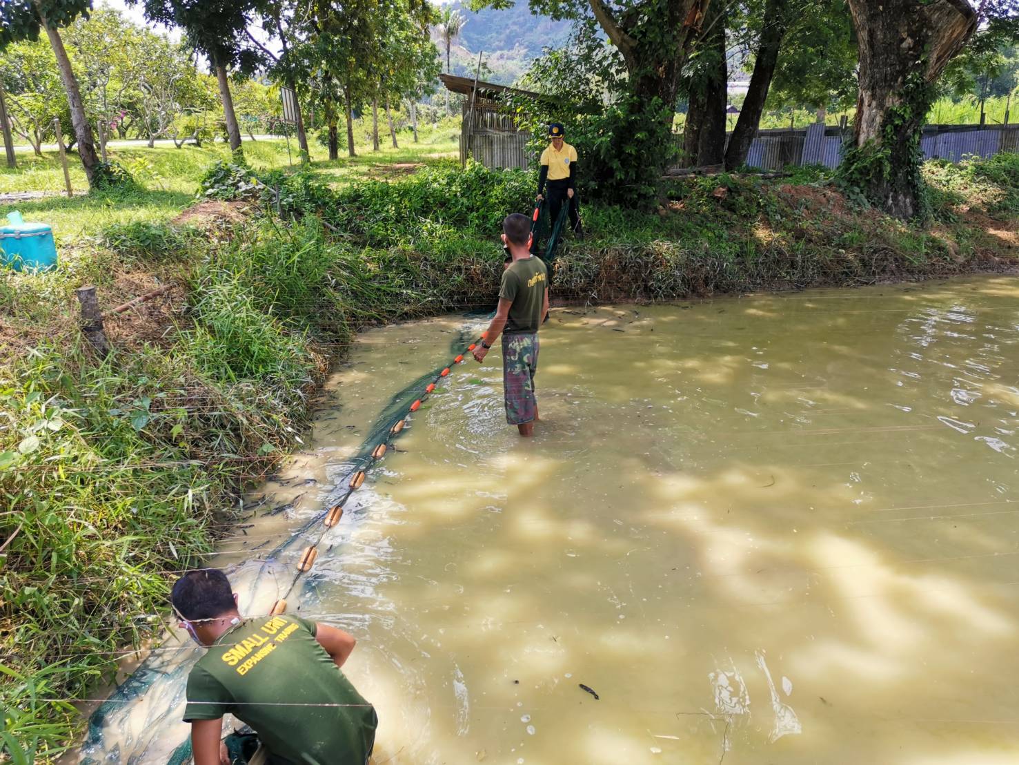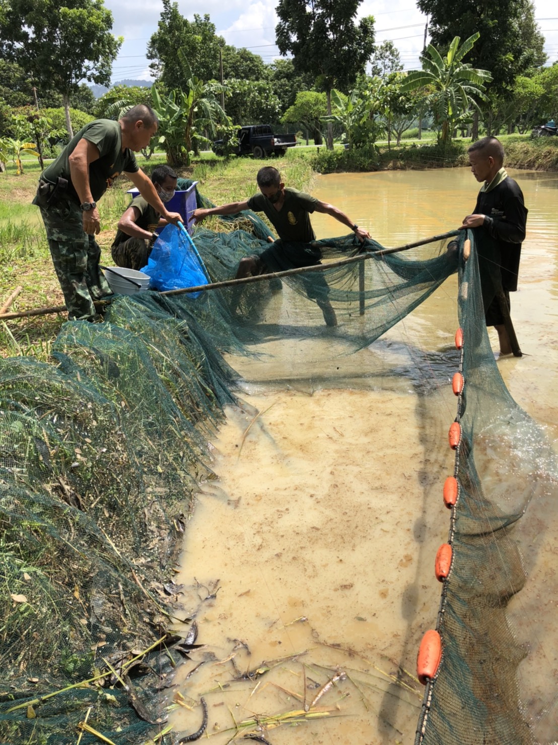 วันที่ 22 มิถุนายน 2563 ตีอวนเพื่อรวบรวมพันธุ์ปลา ที่บ่อปลา โรงเรียนทหารการสัตว์ กรมการทหารการสัตว์