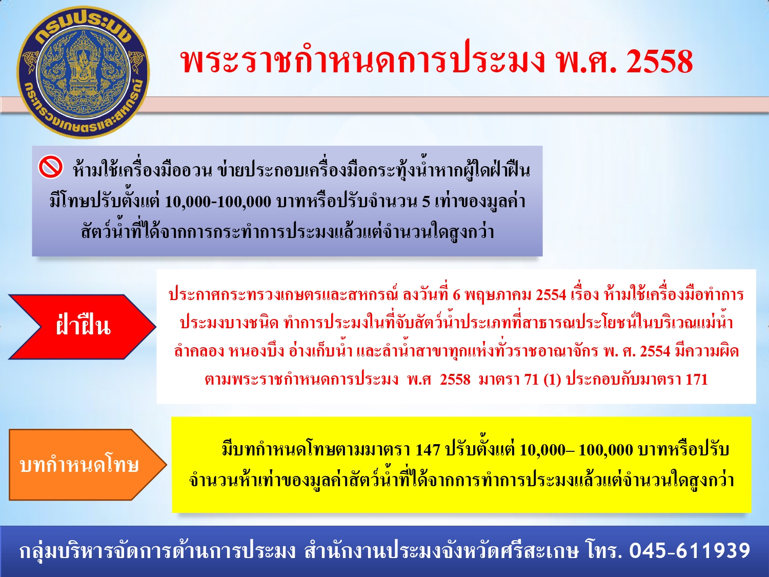 เนื่องด้วยในช่วงฤดูแล้งทำให้แหล่งน้ำธรรมชาติมีปริมาณน้ำลดลงอย่างต่อเนื่องทำให้ผู้มีอาชีพทำการประมงลักลอบทำการประมงด้วยเครื่องมือที่ผิดกฎหมายได้แก่เครื่องมืออวน ข่าย ประกอบเครื่องมือกระทุ้งน้ำและเครื่องมือกางกั้นทางเดินสัตว์น้ำจึงขอประชาสัมพันธ์