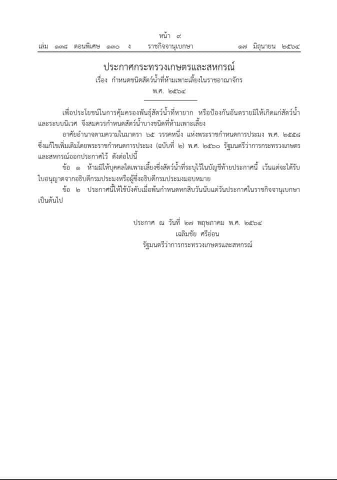 ล่าสุดกรมประมงจึงได้อาศัยความตามมาตรา 65 วรรคหนึ่ง แห่งพระราชกำหนดการประมงพ.ศ. 2560 ออกประกาศกระทรวงเกษตรและสหกรณ์ เรื่อง กำหนดชนิดสัตว์น้ำที่ห้ามเลี้ยงในราชอาณาจักร พ.ศ. 2564 ลงวันที่ 27 พฤษภาคม 2564ซึ่งจะมีผลบังคับใช้ในวันทึ่ 16 สิงหาคม 2564 นี้ เพื่อประโยชน์ในการคุ้มครองพันธุ์สัตว์น้ำพื้นถิ่นหายาก หรือป้องกันอันตรายมิให้เกิดแก่สัตว์น้ำและระบบนิเวศ ซึ่งประกอบสัตว์น้ำด้วย 13 ชนิด ตามภาพประกอบ ดังนี้