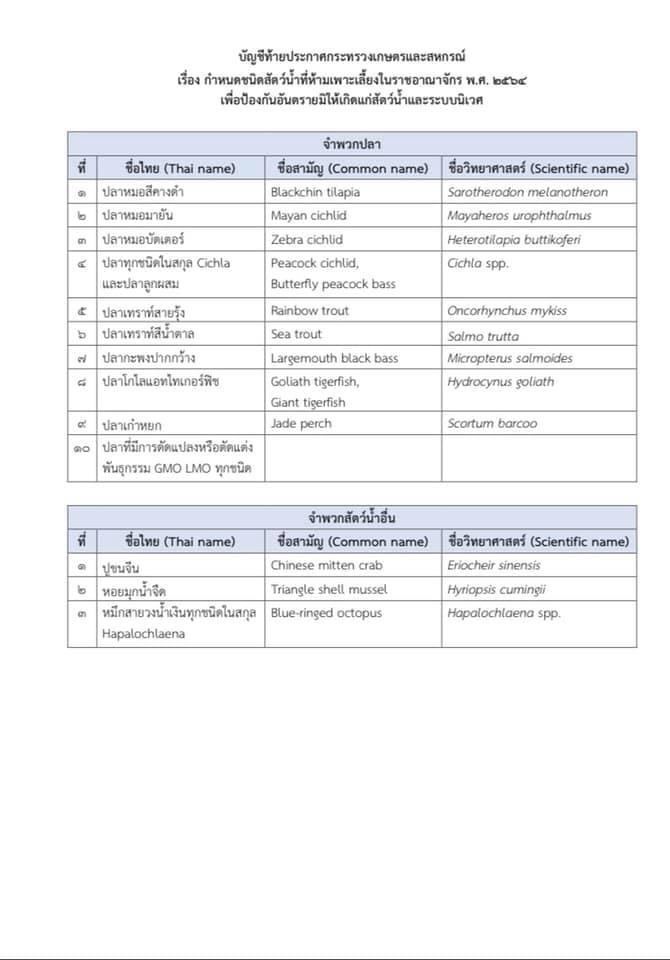 กรมประมง...ออกประกาศฯคุมเข้ม !!! ชนิดพันธุ์สัตว์น้ำต่างถิ่นที่ขึ้นบัญชีเพิ่มอีกจำนวน 13 ชนิดหวังตัดวงจรการแพร่พันธุ์และคุ้มครองพันธุ์สัตว์น้ำพื้นถิ่นพร้อมป้องกันผลกระทบต่อระบบนิเวศแหล่งน้ำของไทยไม่ให้เกิดความเสียหาย