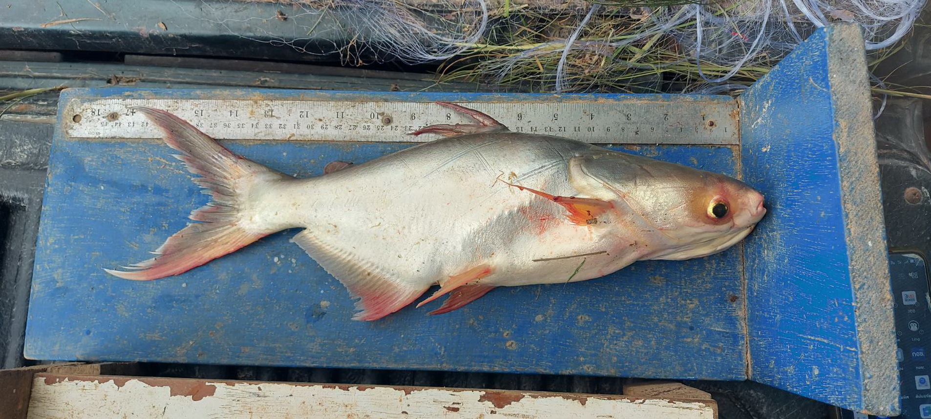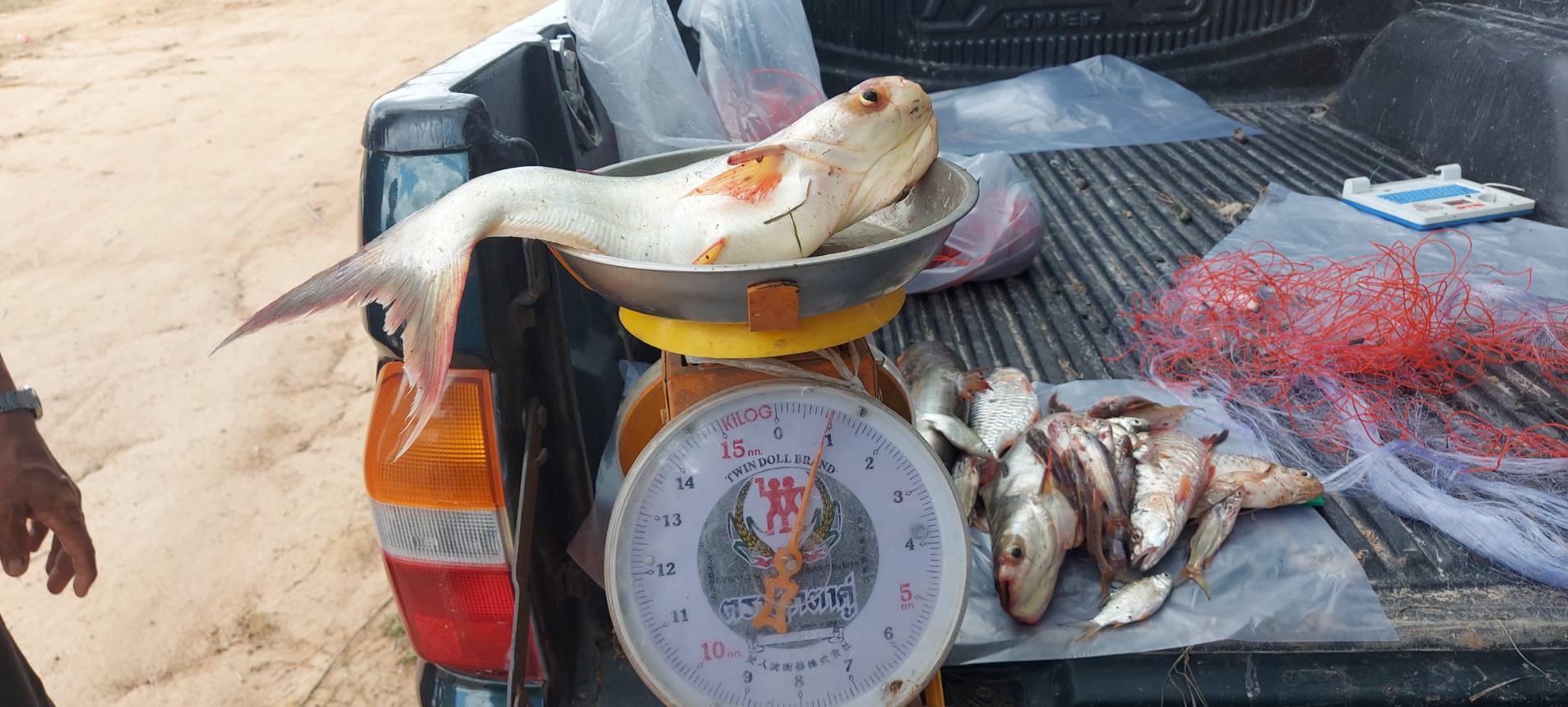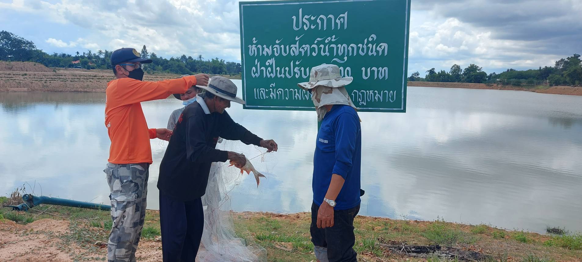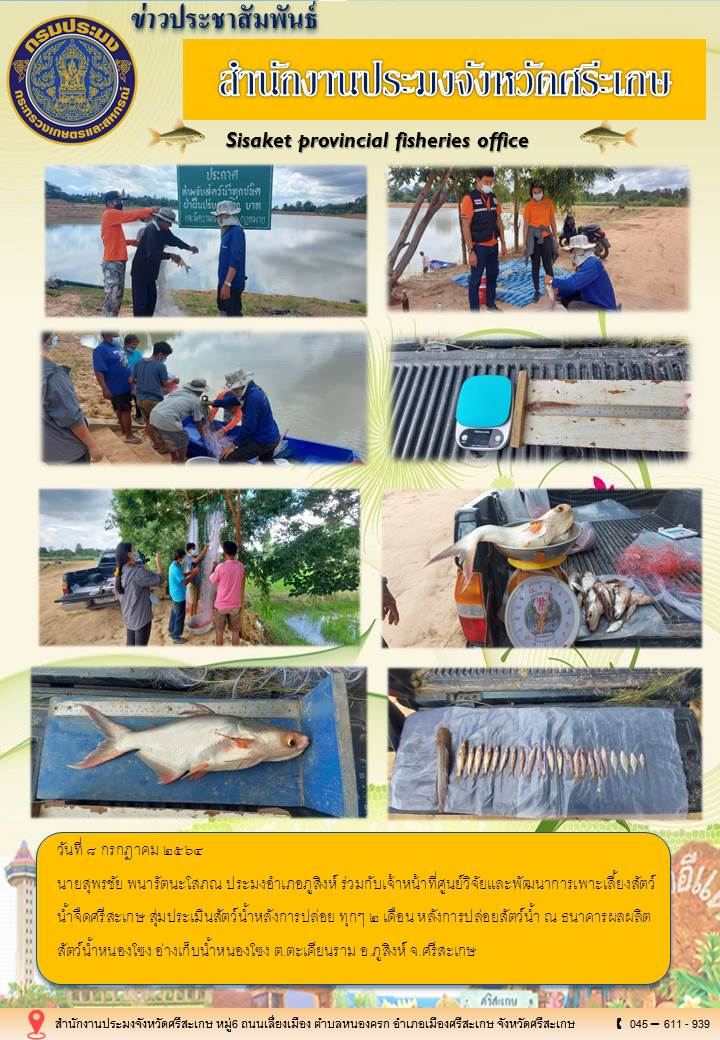 นายสุพรชัย พนารัตนะโสภณ ประมงอำเภอภูสิงห์ ร่วมกับเจ้าหน้าที่ศูนย์วิจัยและพัฒนาการเพาะเลี้ยงสัตว์น้ำจืดศรีสะเกษ สุ่มประเมินสัตว์น้ำหลังการปล่อย ทุกๆ ๒ เดือน หลังการปล่อยสัตว์น้ำ ณ ธนาคารผลผลิตสัตว์น้ำหนองโซง อ่างเก็บน้ำหนองโซง ต.ตะเคียนราม อ.ภูสิงห์ จ.ศรีสะเกษ
