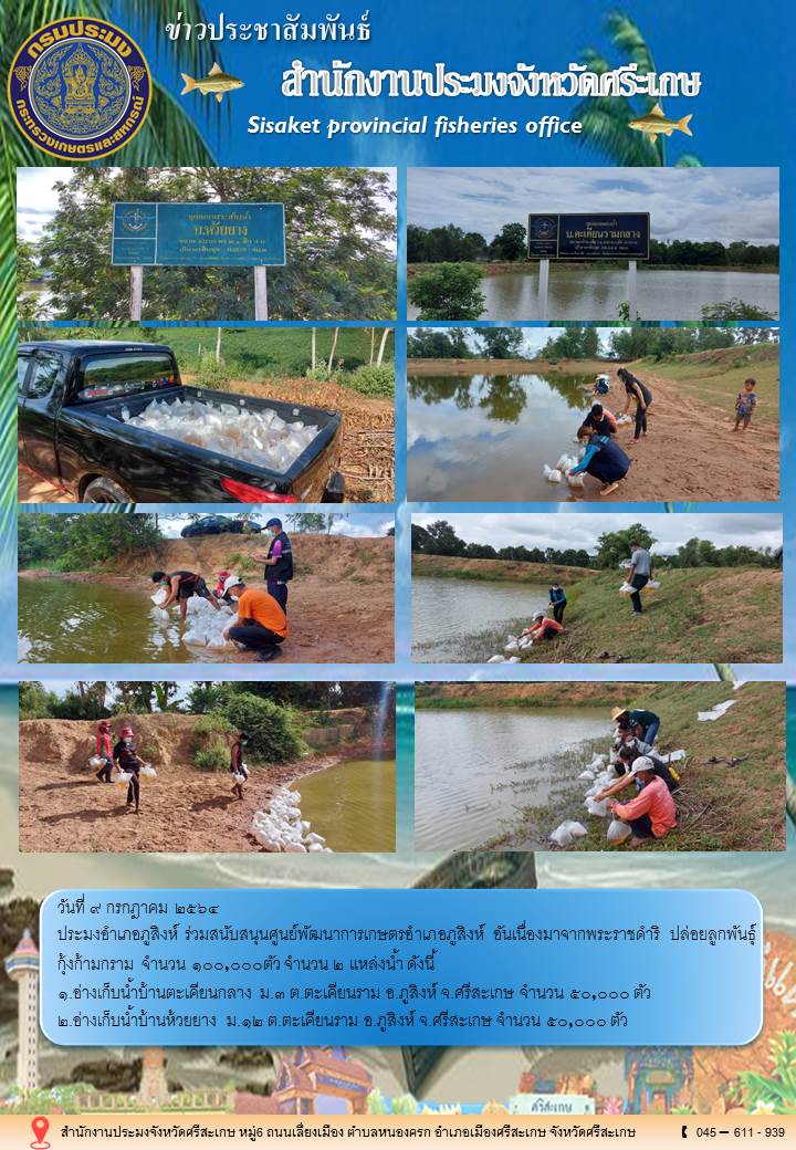 ประมงอำเภอภูสิงห์ ร่วมสนับสนุนศูนย์พัฒนาการเกษตรอำเภอภูสิงห์ อันเนื่องมาจากพระราชดำริ ปล่อยลูกพันธุ์กุ้งก้ามกราม จำนวน ๑๐๐,๐๐๐ตัว จำนวน ๒ แหล่งน้ำ ดังนี้