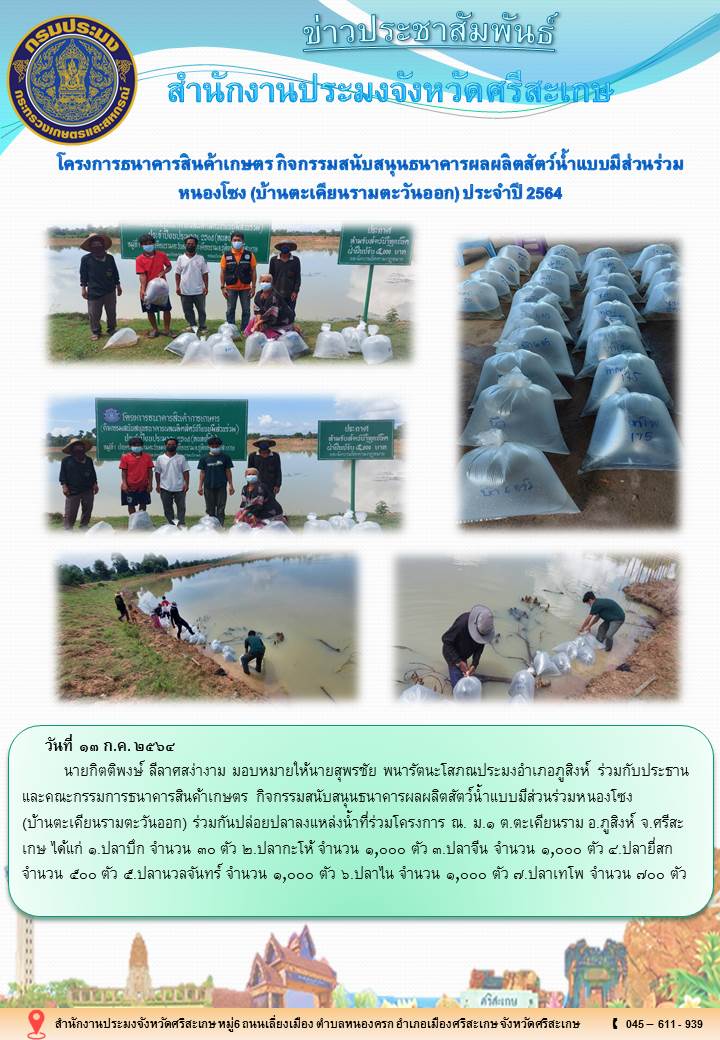 นายกิตติพงษ์ ลีลาศสง่างาม ประมงจังหวัดมอบหมายให้นายสุพรชัย พนารัตนะโสภณประมงอำเภอภูสิงห์ ร่วมกับประธานและคณะกรรมการธนาคารสินค้าเกษตร กิจกรรมสนับสนุนธนาคารผลผลิตสัตว์น้ำแบบมีส่วนร่วมหนองโซง (บ้านตะเคียนรามตะวันออก) ร่วมกันปล่อยปลาลงแหล่งน้ำที่ร่วมโครงการ ณ. ม.๑ ต.ตะเคียนราม อ.ภูสิงห์ จ.ศรีสะเกษ ได้แก่ ๑.ปลาบึก จำนวน ๓๐ ตัว ๒.ปลากะโห้ จำนวน ๑,๐๐๐ ตัว ๓.ปลาจีน จำนวน ๑,๐๐๐ ตัว ๔.ปลายี่สก จำนวน ๕๐๐ ตัว ๕.ปลานวลจันทร์ จำนวน ๑,๐๐๐ ตัว ๖.ปลาไน จำนวน ๑,๐๐๐ ตัว ๗.ปลาเทโพ จำนวน ๗๐๐ ตัว