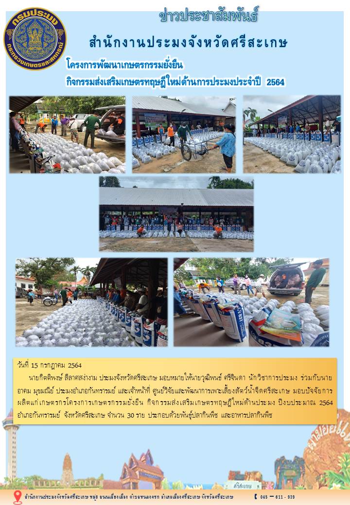 นายกิตติพงษ์ ลีลาศสง่างาม ประมงจังหวัดศรีสะเกษ มอบหมายให้นายวุฒิพนธ์ ศรีจินดา นักวิชาการประมง ร่วมกับนายอาคม มุขมณีย์ ประมงอำเภอกันทรารมย์ และเจ้าหน้าที่ ศูนย์วิจัยและพัฒนาการเพาะเลี้ยงสัตว์น้ำจืดศรีสะเกษ มอบปัจจัยการผลิตแก่เกษตรกรโครงการเกษตรกรรมยั่งยืน กิจกรรมส่งเสริมเกษตรทฤษฎีใหม่ด้านประมง ปีงบประมาณ 2564 อำเภอกันทรารมย์ จังหวัดศรีสะเกษ จำนวน 30 ราย ประกอบด้วยพันธุ์ปลากินพืช และอาหารปลากินพืช