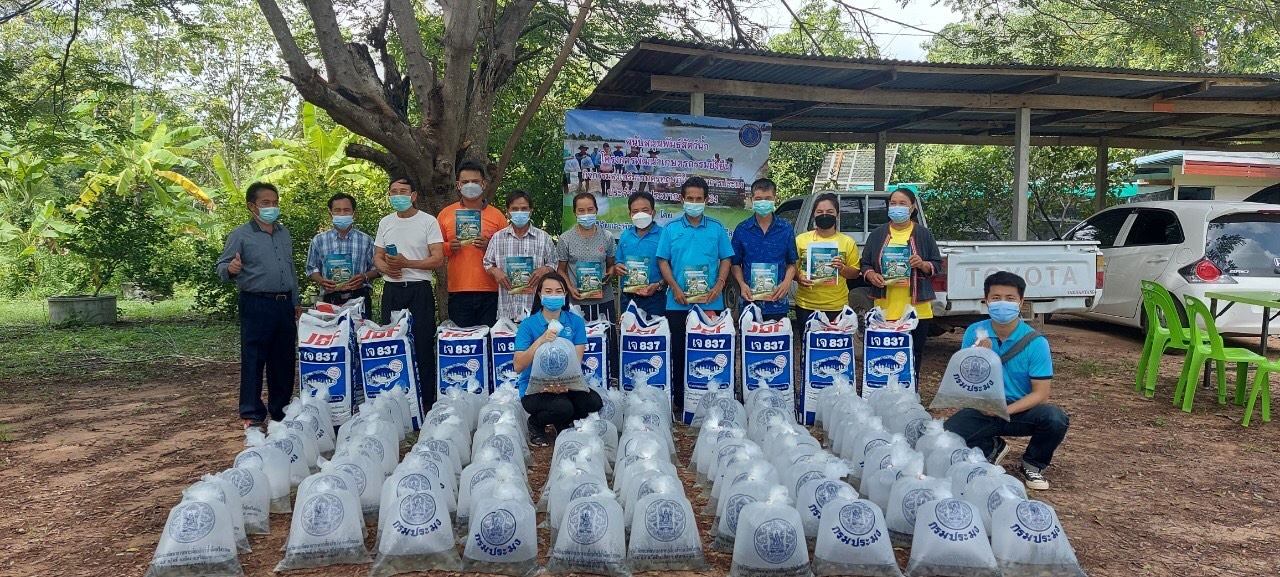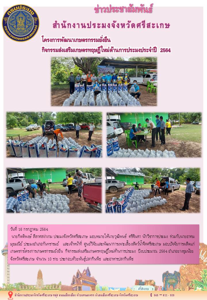 นายกิตติพงษ์ ลีลาศสง่างาม ประมงจังหวัดศรีสะเกษ มอบหมายให้นายวุฒิพนธ์ ศรีจินดา นักวิชาการประมง ร่วมกับนายอาคม มุขมณีย์ ประมงอำเภอกันทรารมย์ และเจ้าหน้าที่ ศูนย์วิจัยและพัฒนาการเพาะเลี้ยงสัตว์น้ำจืดศรีสะเกษ มอบปัจจัยการผลิตแก่เกษตรกรโครงการเกษตรกรรมยั่งยืน กิจกรรมส่งเสริมเกษตรทฤษฎีใหม่ด้านการประมง ปีงบประมาณ 2564 อำเภอยางชุมน้อย จังหวัดศรีสะเกษ จำนวน 10 ราย ประกอบด้วยพันธุ์ปลากินพืช และอาหารปลากินพืช