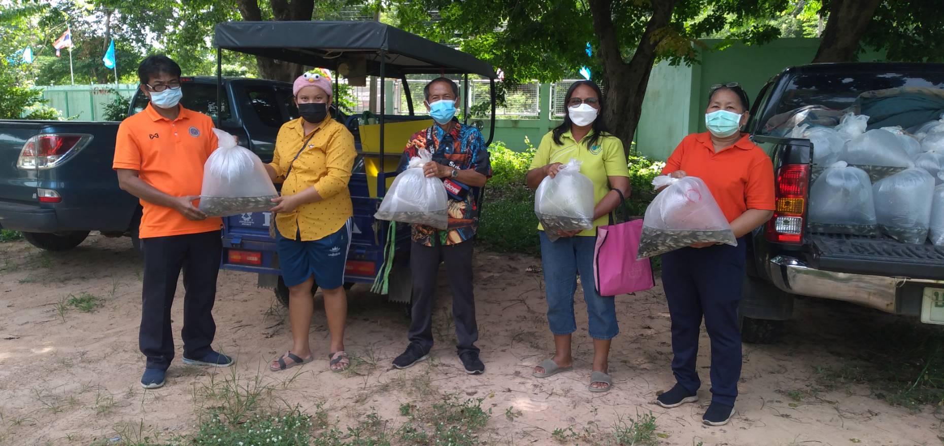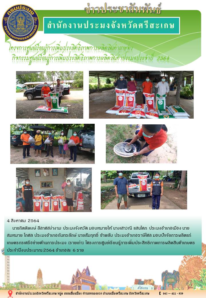 นายกิตติพงษ์ ลีลาศสง่างาม ประมงจังหวัด มอบหมายให้ นางเสาวณี แสนโคก ประมงอำเภอเมือง นายสมหมาย โกศล ประมงอำเภอกันทรลักษ์ นายสัมฤทธิ์ ขำพลับ ประมงอำเภอราษีไศล มอบปัจจัยการผลิตแก่เกษตรกรเครือข่ายด้านการประมง (รายเก่า) โครงการศูนย์เรียนรู้การเพิ่มประสิทธิภาพการผลิตสินค้าเกษตร ประจำปีงบประมาณ 2564 อำเภอละ 6 ราย
