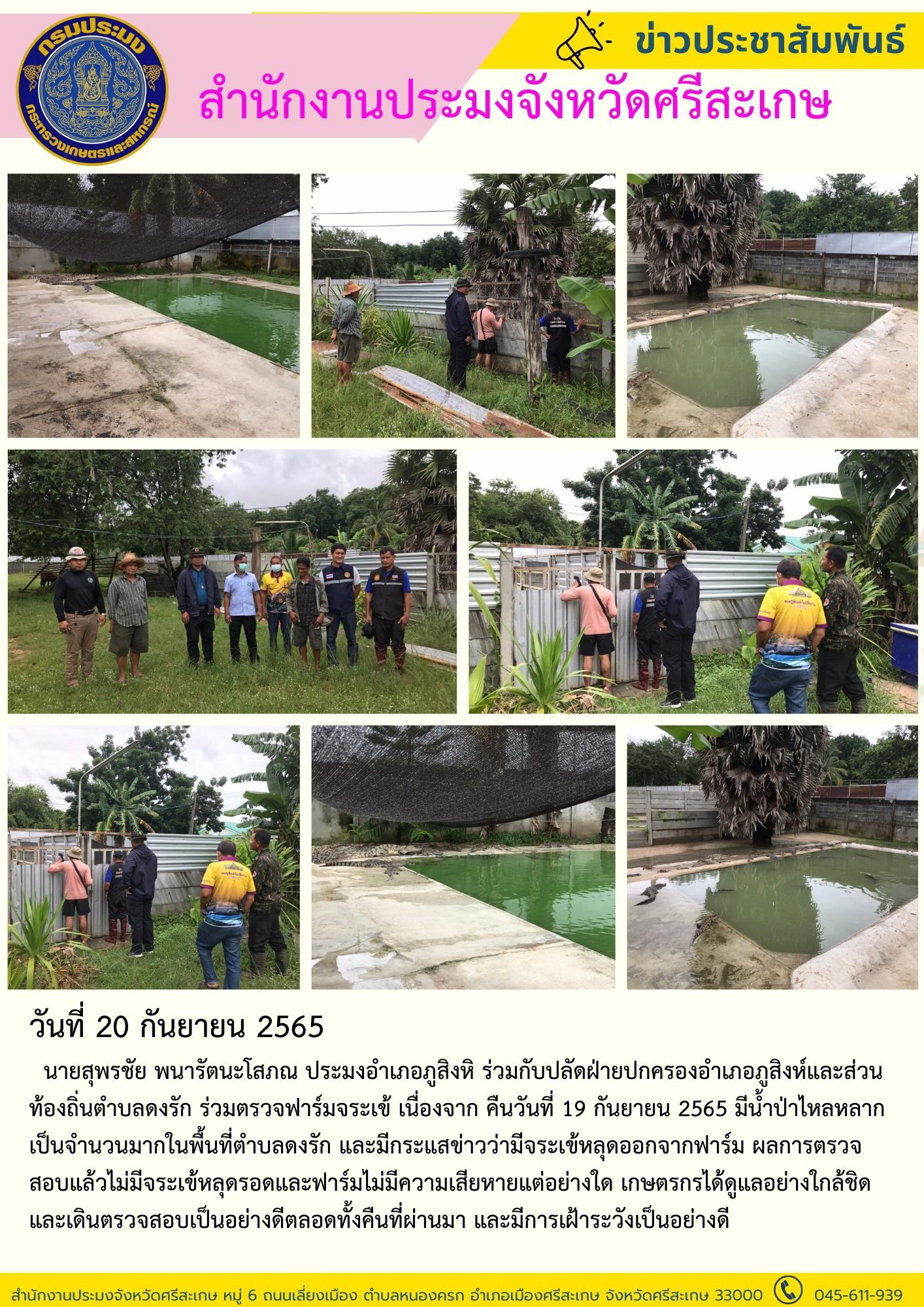 นายสุพรชัย พนารัตนะโสภณ ประมงอำเภอภูสิงหิ ร่วมกับปลัดฝ่ายปกครองอำเภอภูสิงห์และส่วนท้องถิ่นตำบลดงรัก ร่วมตรวจฟาร์มจระเข้ เนื่องจาก คืนวันที่ 19 กันยายน 2565 มีน้ำป่าไหลหลากเป็นจำนวนมากในพื้นที่ตำบลดงรัก และมีกระแสข่าวว่ามีจระเข้หลุดออกจากฟาร์ม ผลการตรวจสอบแล้วไม่มีจระเข้หลุดรอดและฟาร์มไม่มีความเสียหายแต่อย่างใด เกษตรกรได้ดูแลอย่างใกล้ชิด และเดินตรวจสอบเป็นอย่างดีตลอดทั้งคืนที่ผ่านมา และมีการเฝ้าระวังเป็นอย่างดี