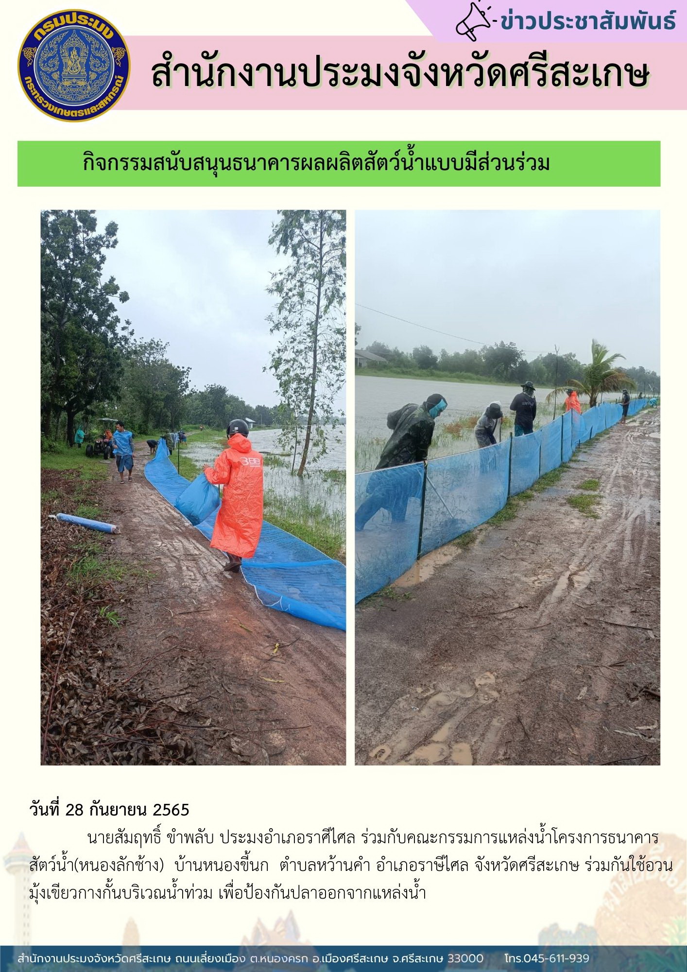 • ขำพลับ ประมงอำเภอราศีไศล ร่วมกับคณะกรรมการแหล่งน้ำโครงการธนาคารสัตว์น้ำ(หนองลักช้าง) บ้านหนองขี้นก ตำบลหว้านคำ อำเภอราษีไศล จังหวัดศรีสะเกษ ร่วมกันใช้อวนมุ้งเขียวกางกั้นบริเวณน้ำท่วม เพื่อป้องกันปลาออกจากแหล่งน้ำ