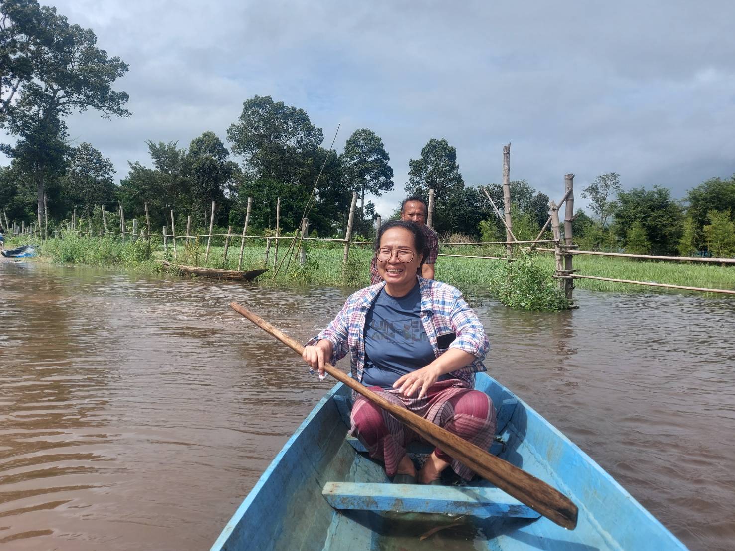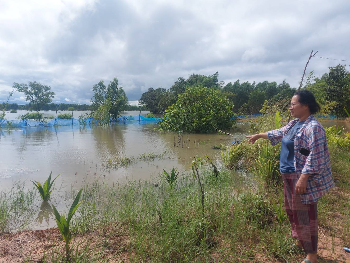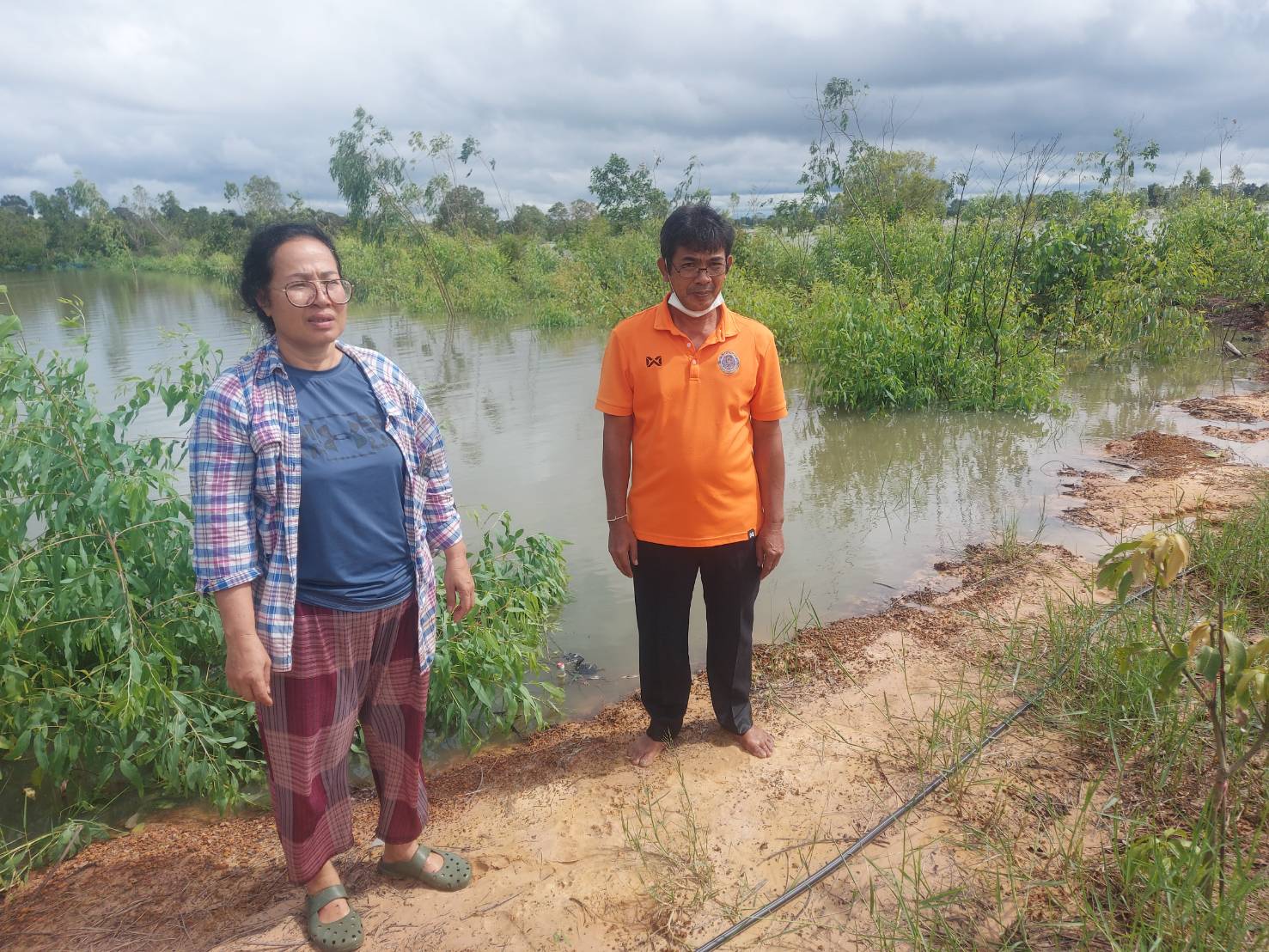 นายสัมฤทธิ์ ขำพลับ ประมงอำเภอราษีไศล ตรวจพื้นที่น้ำท่วมบ่อเลี้ยงปลาของเกษตรกร บ้านสะคาม ม.5