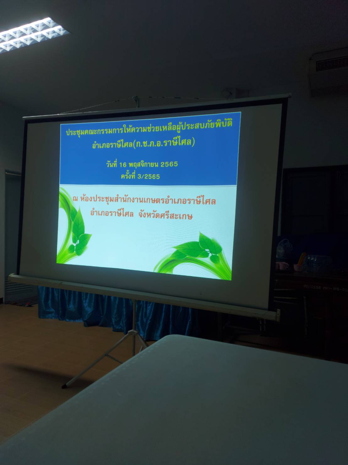 สำนักงานประมงจังหวัด โดย นายสัมฤทธิ์ ขำพลับ ประมงอำเภอราษีไศล เข้าร่วมประชุม คณะกรรมการให้ความช่วยเหลือผู้ประสบภัยพิบัติอำเภอราษีไศล โดยมีนายอำเภอราษีไศล (นายชัยยงค์ เมธาสุรวิทย์) เป็นประธานการประชุม ครั้งที่ 3/65 ได้นำเรียนที่ประชุม ดังนี้ ด้านการประมงอยู่ระหว่างการจัดทำ กษ.01 และตรวจสอบความเสียหายโดยคณะอนุกรรมการตรวจสอบความเสียหายด้านการประมงระดับหมู่บ้าน และพร้อมเสนอที่ประชุม ก.ช.ภ.อ. ครั้งต่อไป โดย อำเภอราษีไศล และอำเภอศิลาลาด อยู่ระหว่างการจัดทำ กษ.01 และบันทึก กษ.02 ตรวจสอบความเสียหาย ในส่วน อำเภอ ศิลาลาด สามารถนำเข้าที่ประชุม ก.ภ.ช.อ. ในวันที่ 24 พย.65 จำนวน 3 ราย และอำเภอราษีไศล จะนำเข้าที่ประชุม ก.ช.ภ.อ. ครั้งต่อไปคาดว่าภายในเดือน ธันวาคม 2565