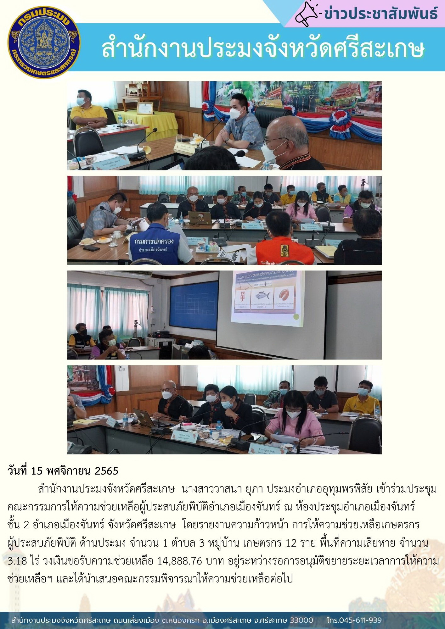 นางสาววาสนา ยุภา ประมงอำเภออุทุมพรพิสัย เข้าร่วมประชุมคณะกรรมการให้ความช่วยเหลือผู้ประสบภัยพิบัติอำเภอเมืองจันทร์ ณ ห้องประชุมอำเภอเมืองจันทร์ ชั้น 2 อำเภอเมืองจันทร์ จังหวัดศรีสะเกษ โดยรายงานความก้าวหน้า การให้ความช่วยเหลือเกษตรกรผู้ประสบภัยพิบัติ ด้านประมง จำนวน 1 ตำบล 3 หมู่บ้าน เกษตรกร 12 ราย พื้นที่ความเสียหาย จำนวน 3.18 ไร่ วงเงินขอรับความช่วยเหลือ 14,888.76 บาท อยู่ระหว่างรอการอนุมัติขยายระยะเวลาการให้ความช่วยเหลือฯ และได้นำเสนอคณะกรรมพิจารณาให้ความช่วยเหลือต่อไป
